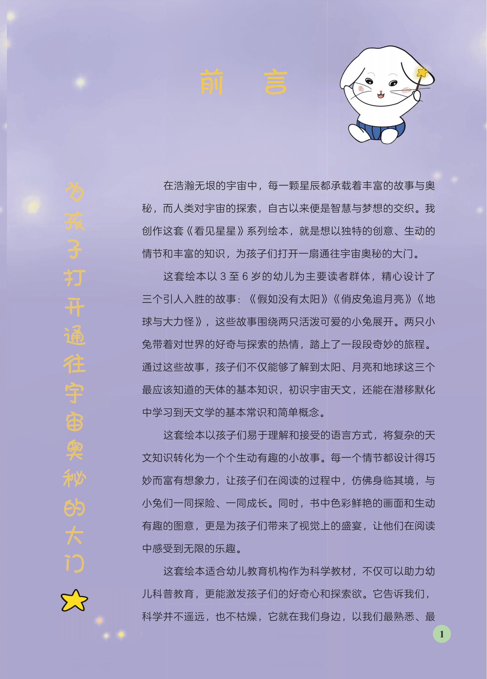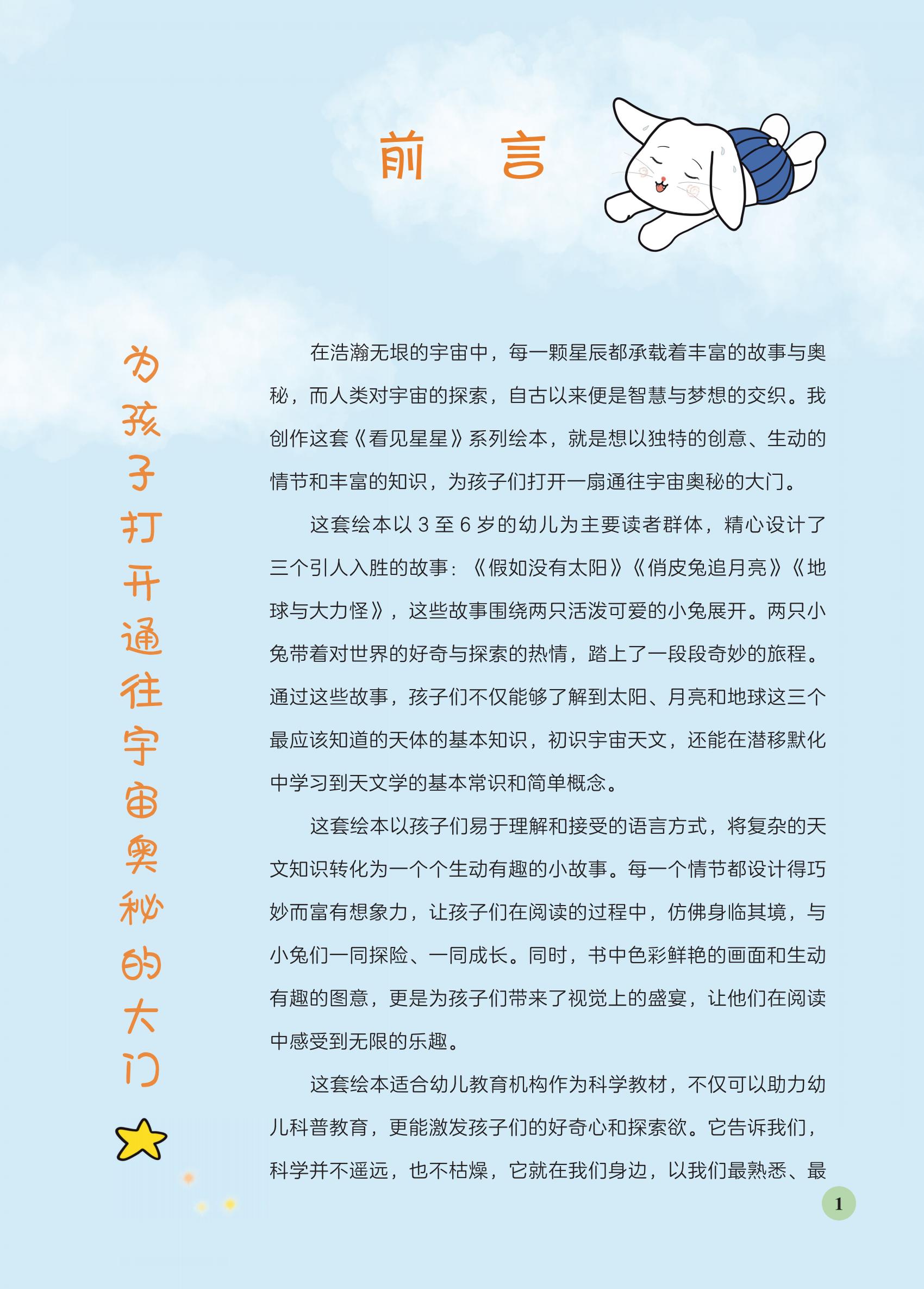 本套丛书是面向幼儿的天文学科普系列读物,包括三个绘本:《假如没有太阳》《俏皮兔追月亮》《地球与大力怪》。丛书通过构设两只小兔奇思怪想、猎奇探险、增长知识、成长进步的有趣故事,介绍了天文学基本常识和简单概念。内容紧贴低幼段孩子的理解能力和认知水平。语言浅显易懂,画面色彩鲜艳,图意趣味盎然,这些设计可使小读者和家长在阅览时产生共鸣,并在潜移默化中学习,从而激发孩子对宇宙天文的兴趣。