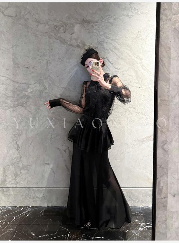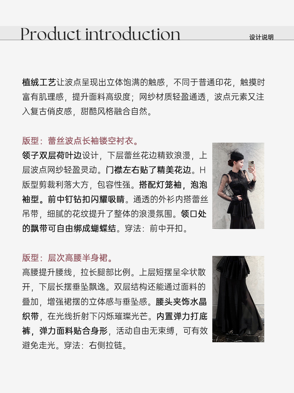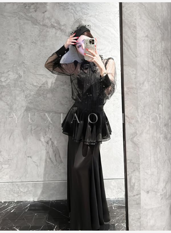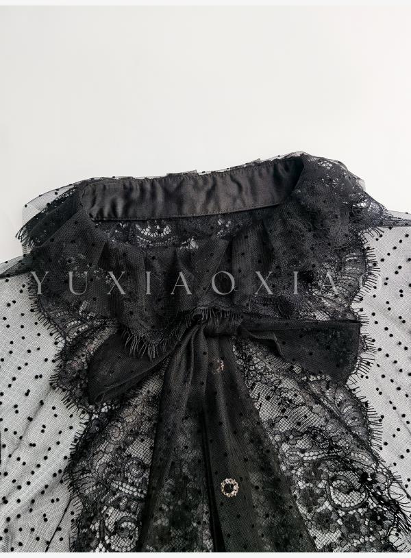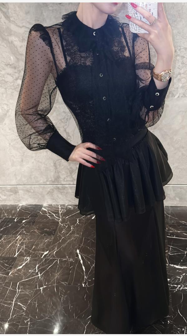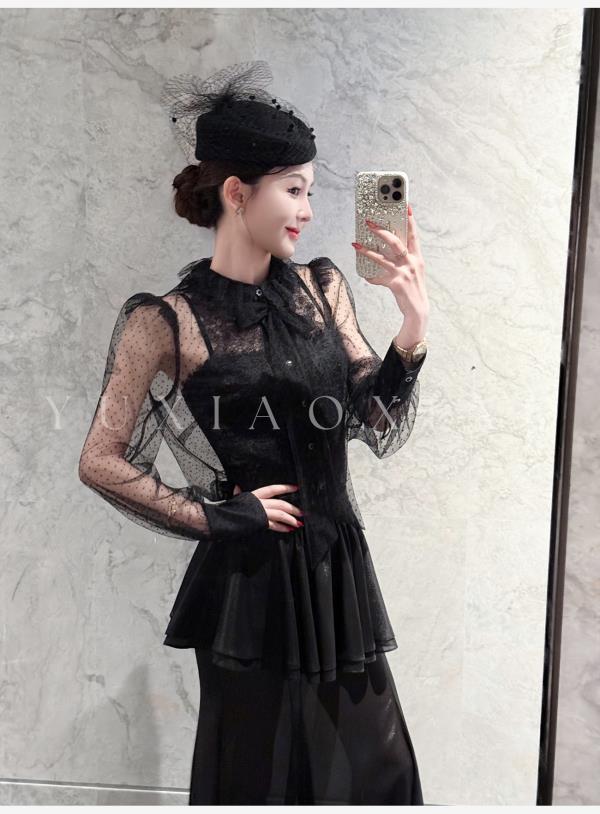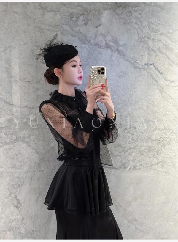 余潇潇【爱丽丝夜曲】蕾丝波点长袖镂空衬衣&高级层次感高腰半身裙