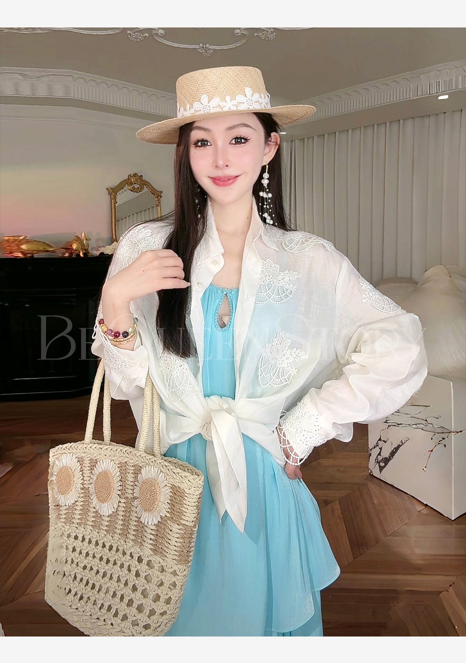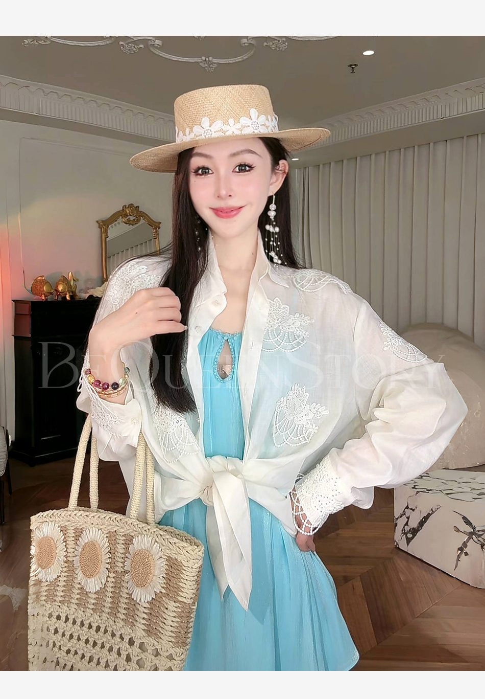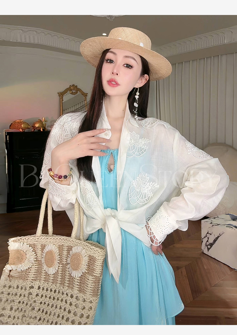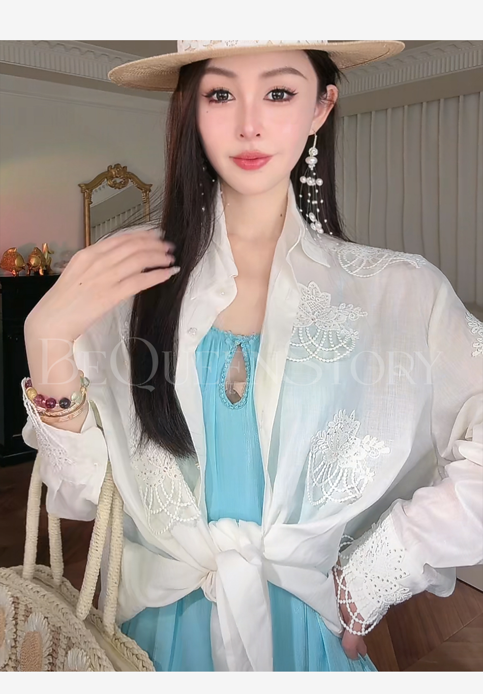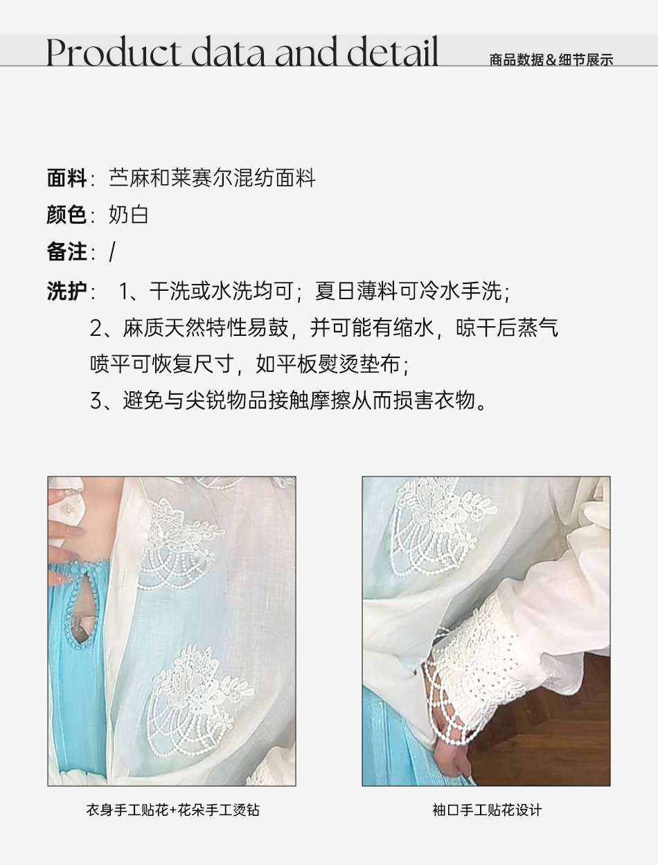 余潇潇【月光恋人】2025春装新款轻奢百搭立体蕾丝花装饰苎麻衬衫