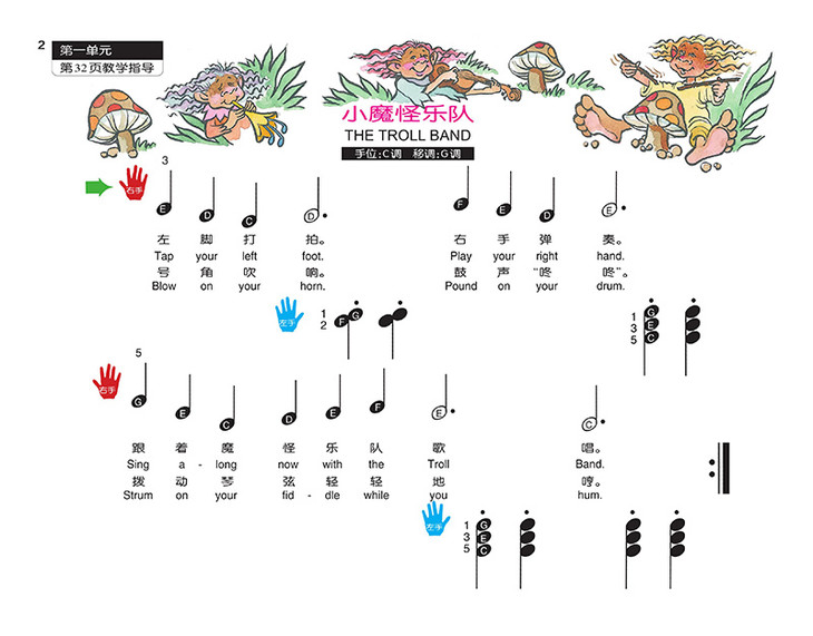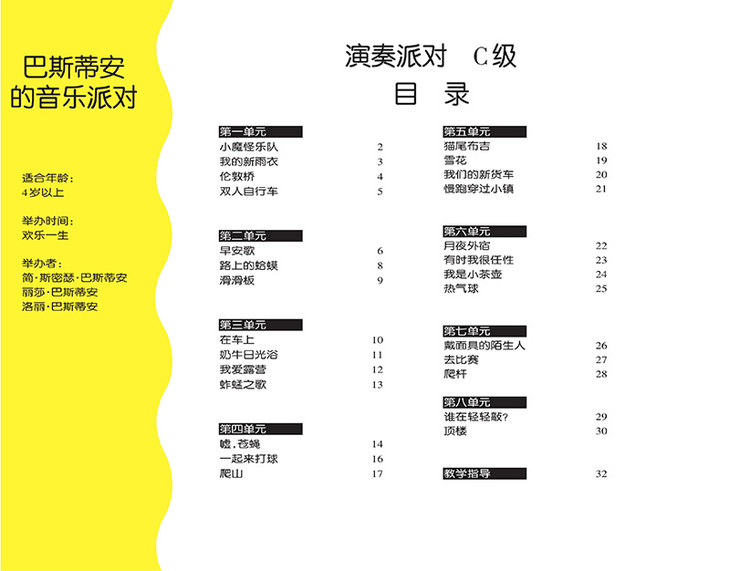 此外,《巴斯蒂安的音乐派对》还是当前低幼钢琴教材市场上紧缺的、可作为钢琴集体课用书的教程,书中不仅在每课的教学指导中给出了如何在集体课上进行教学,还对那些可作为演出、比赛等活动的曲目给出了具体的建议。