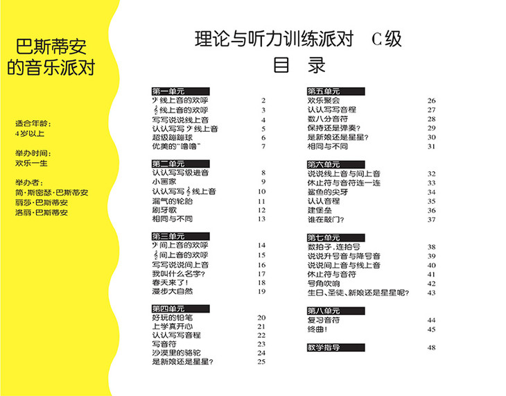 《巴斯蒂安的音乐派对》共包含13本图书,由“4+1”的模式构成。“4”是指这套教程分为A、B、C、D四个级别,每个级别包含3本图书,分别为“钢琴派对”“理论与听力训练派对”和“演奏派对”,其中“钢琴派对”内容为基本课程,“理论与听力训练派对”多是以游戏形式引导孩子对音乐知识和音乐听力进行训练,“演奏派对”则是与课程进度配套的补充曲目。“1”是指在4个级别总计12本书之余,还有一本以独特方法引导低幼龄孩子认识音符和乐谱的《读谱教程》。