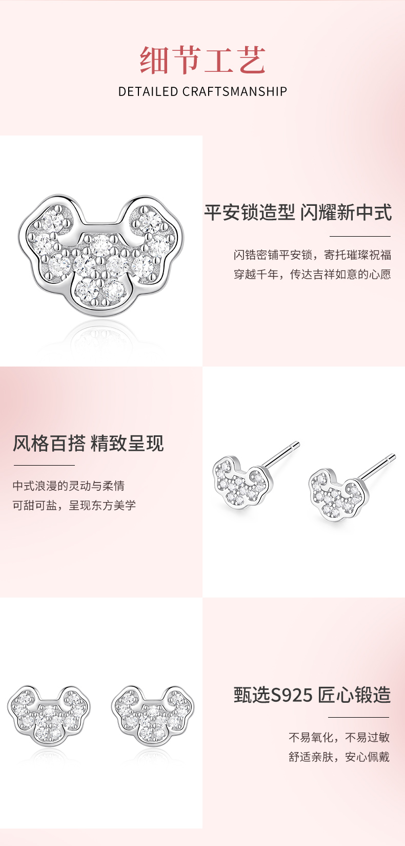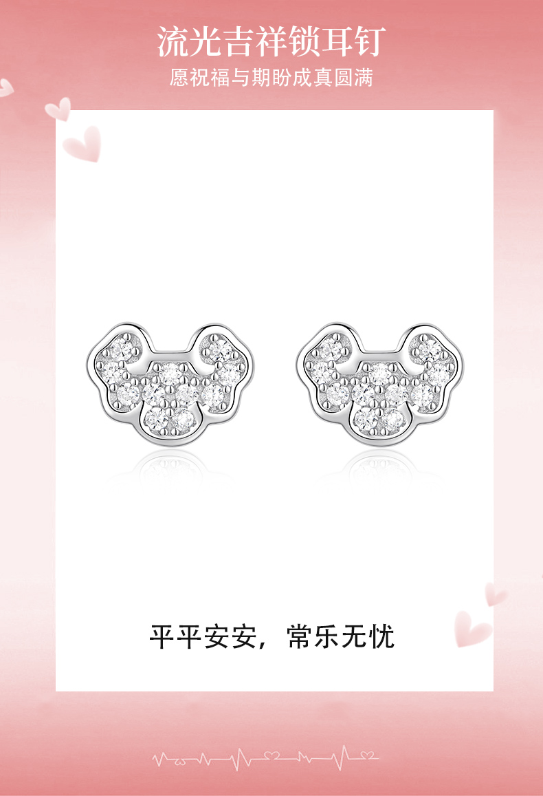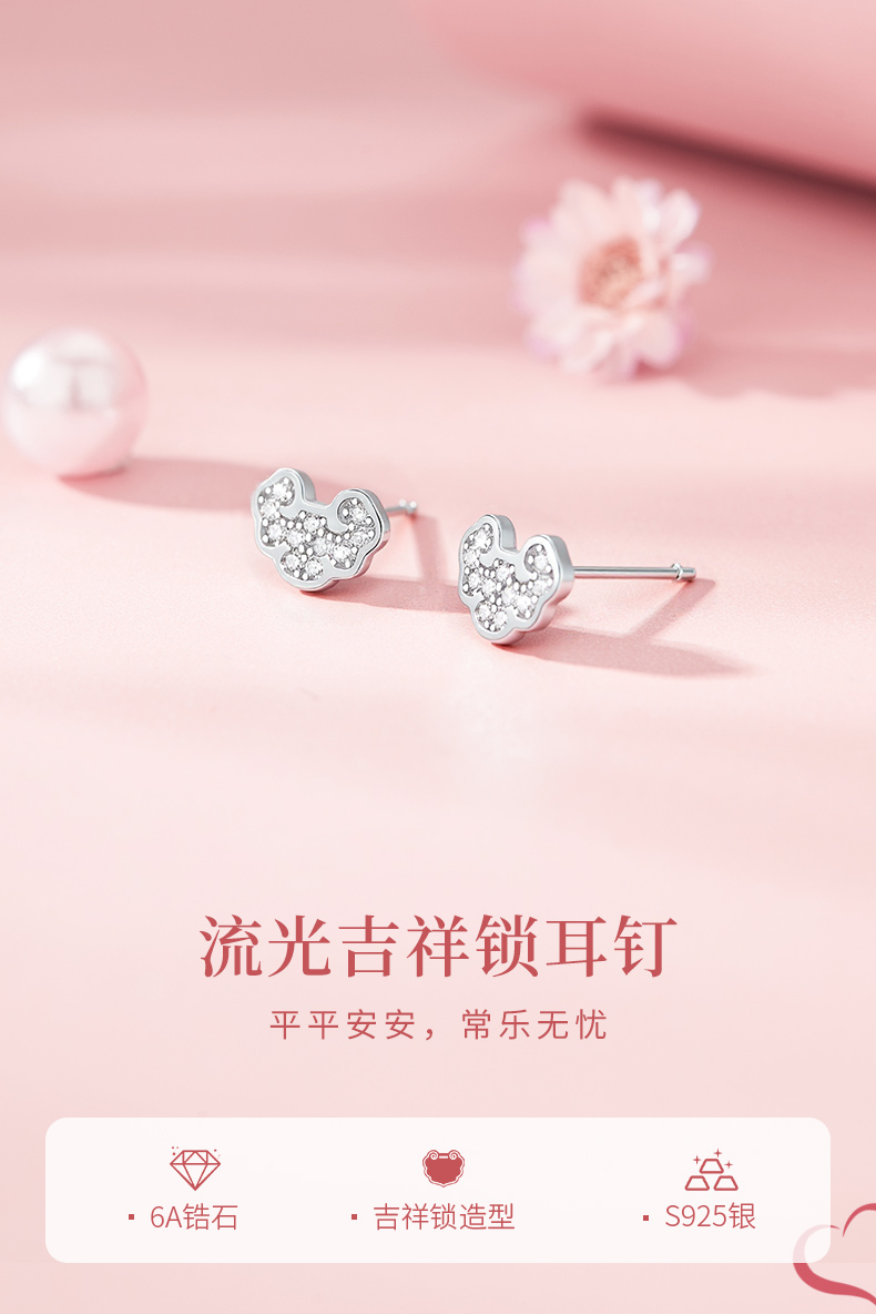 卡蒂罗KADER 流光吉祥锁耳钉 新中式925银闪锆满铺平安锁吉祥如意睡觉免摘养耳洞耳饰 精致小巧可爱