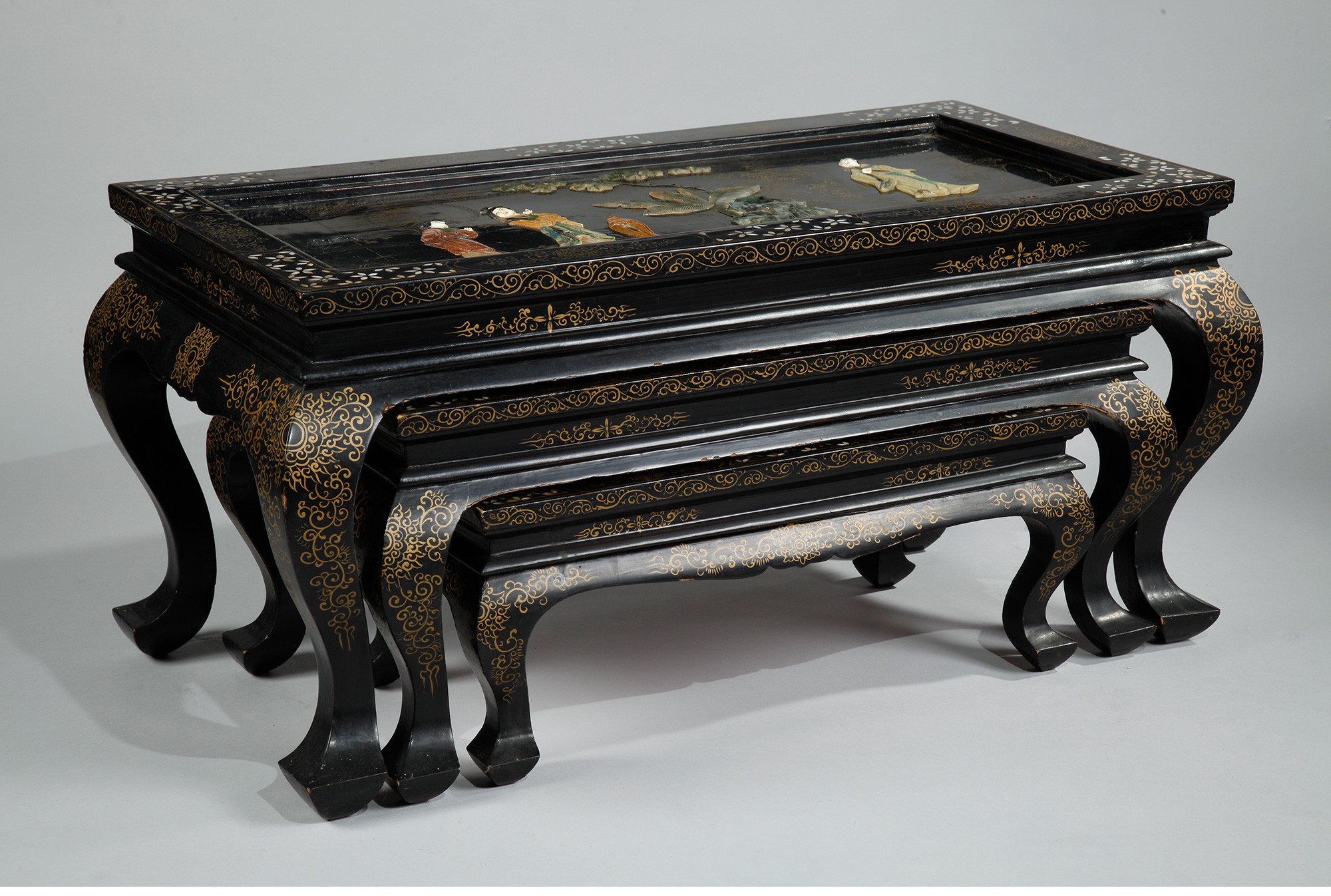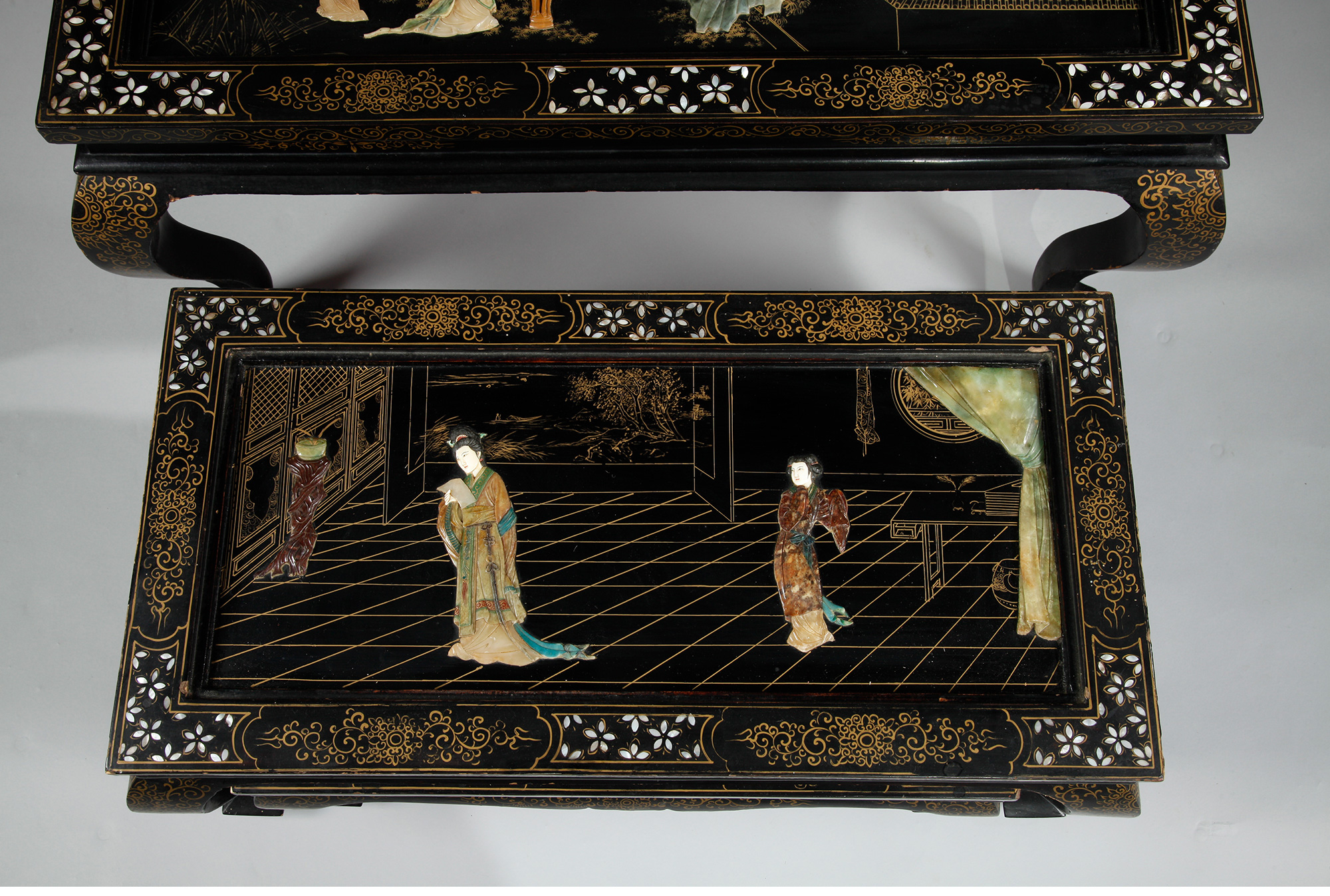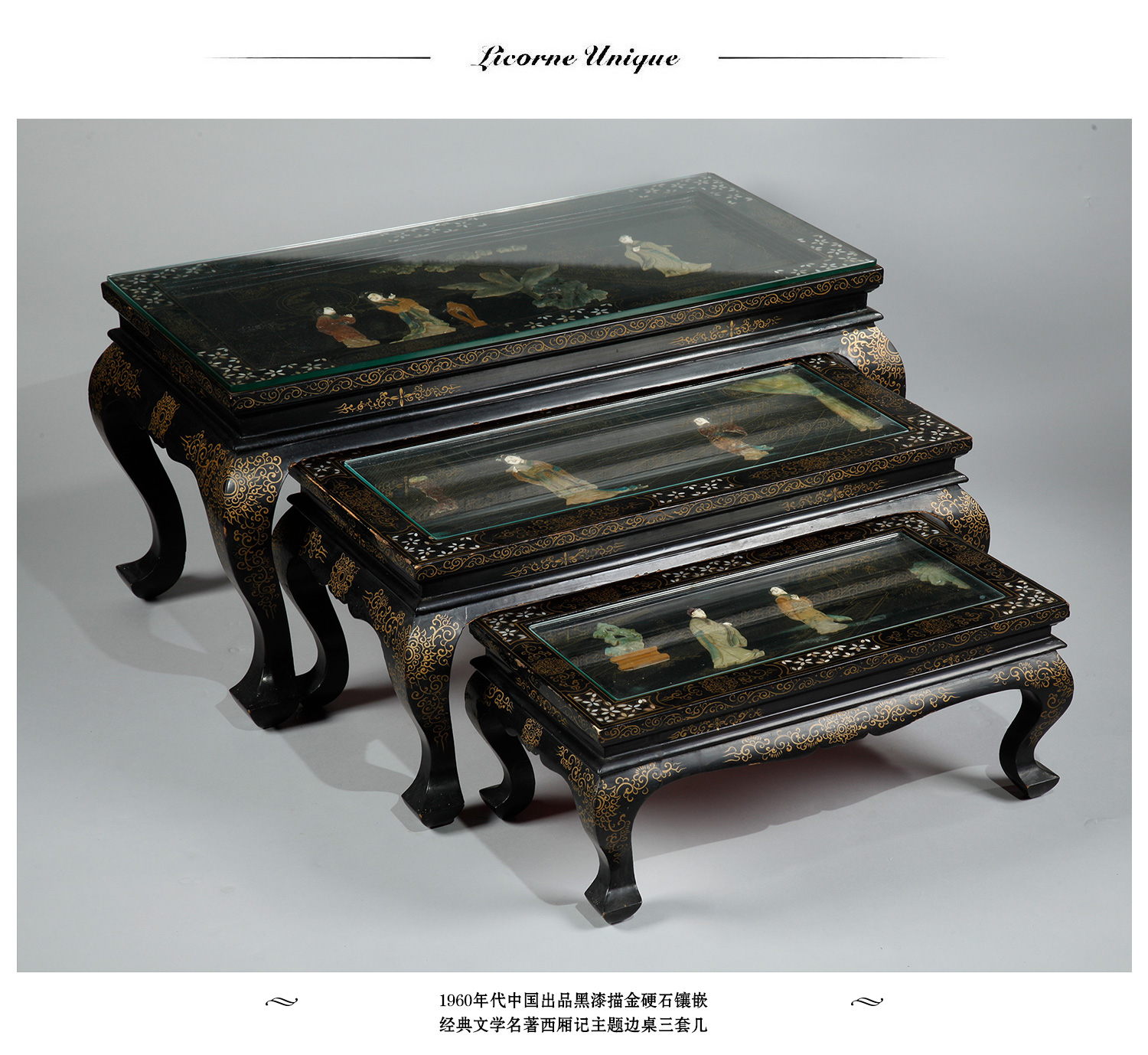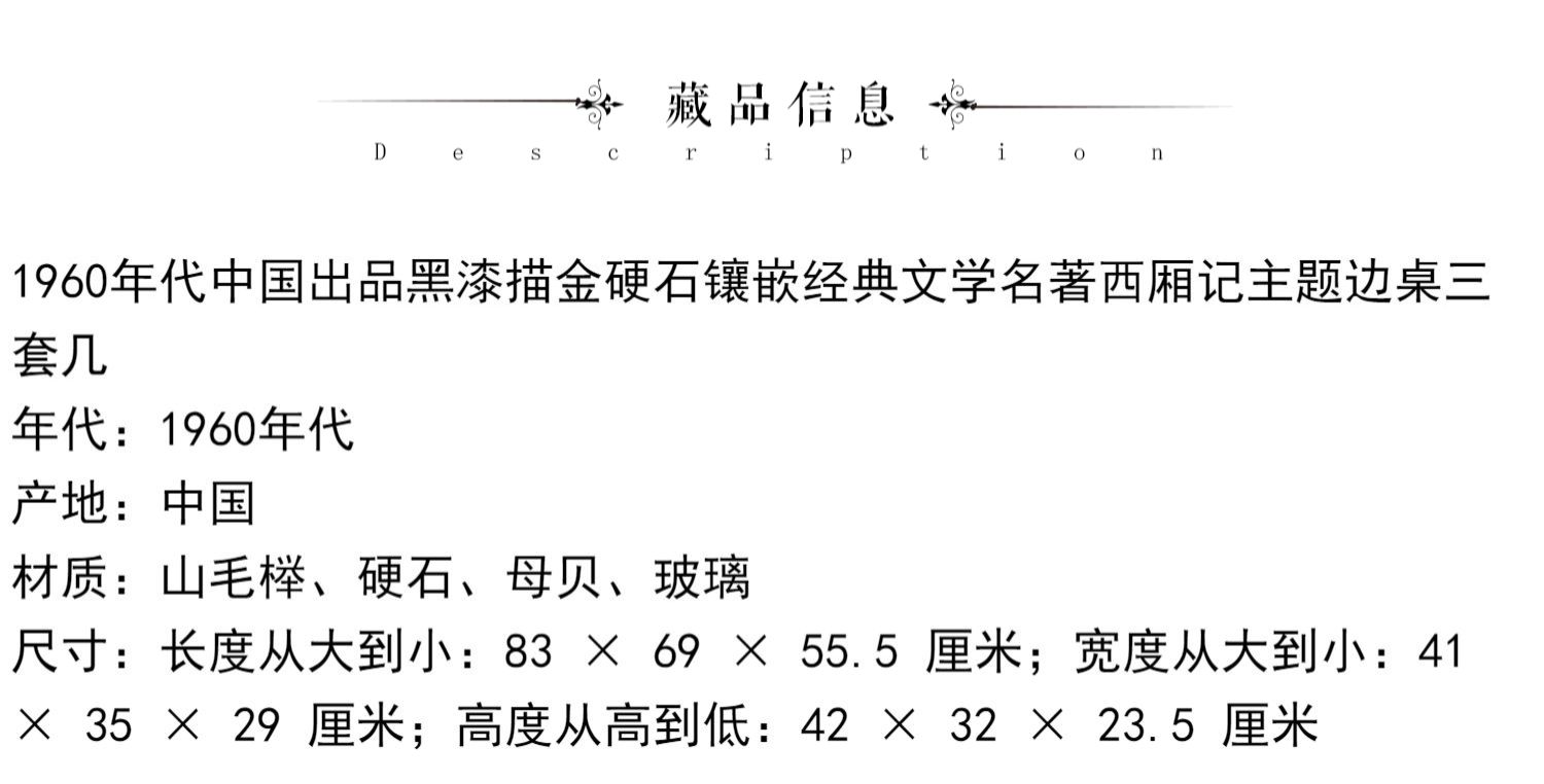 独角鹿西洋古董家具中国黑漆描金硬石镶嵌西厢记主题边桌三套几