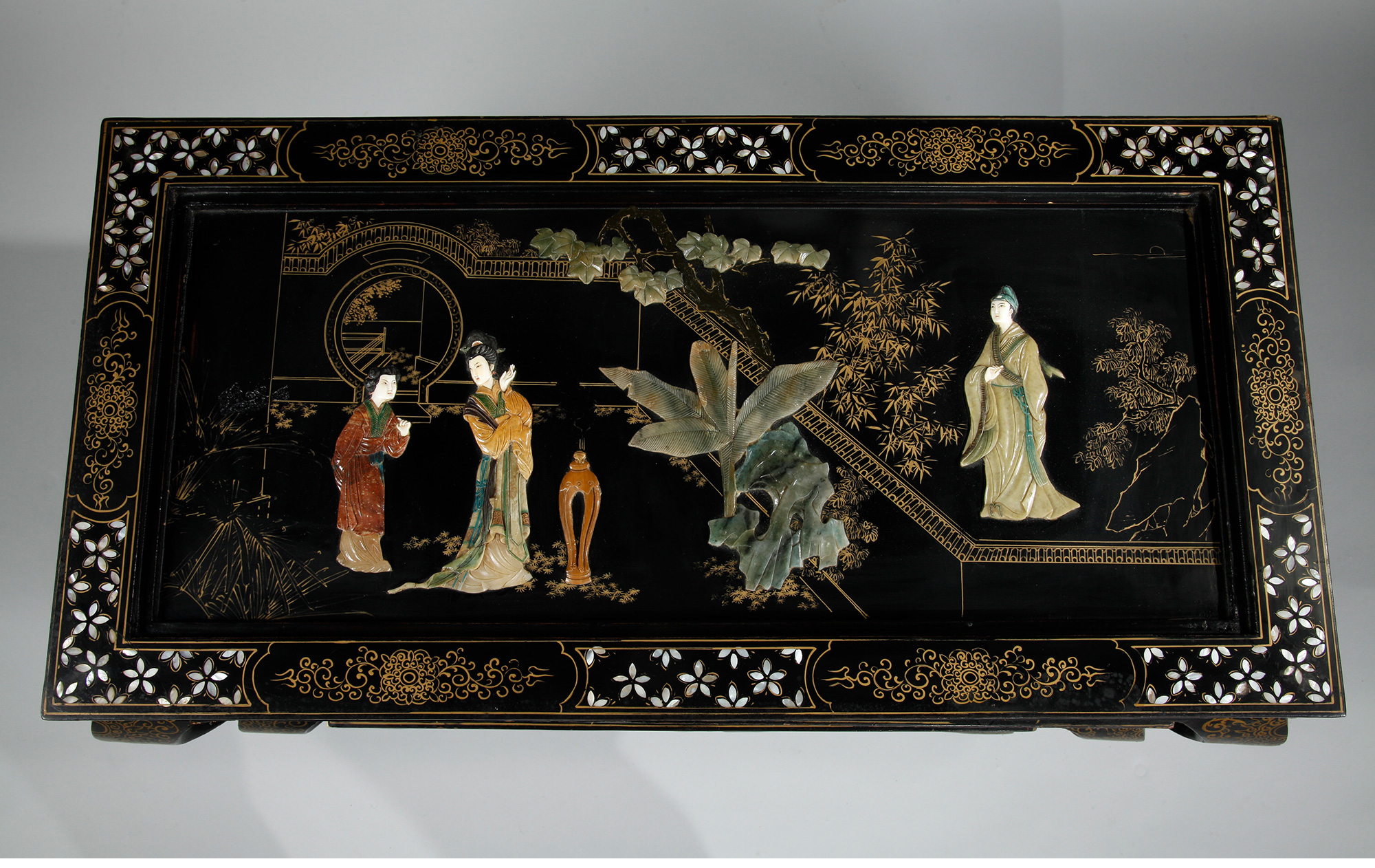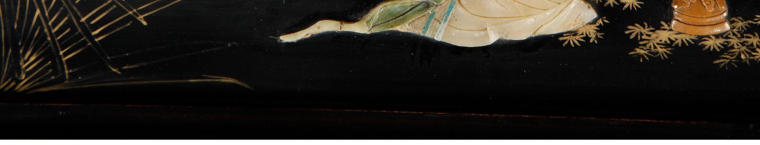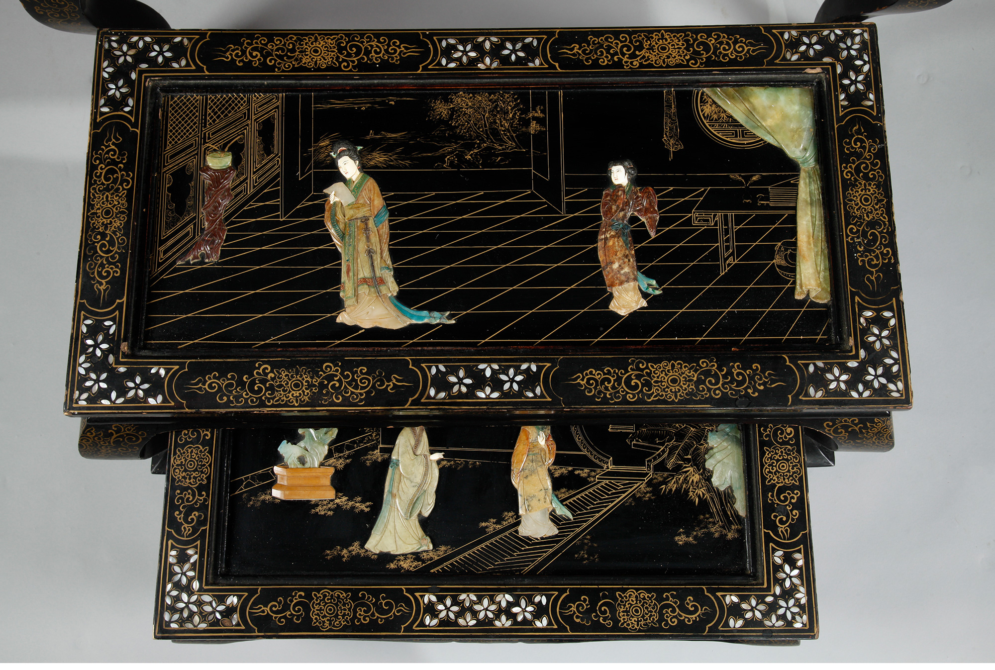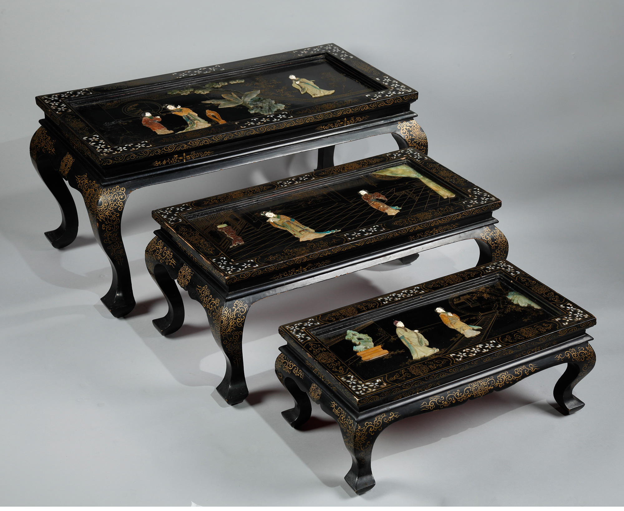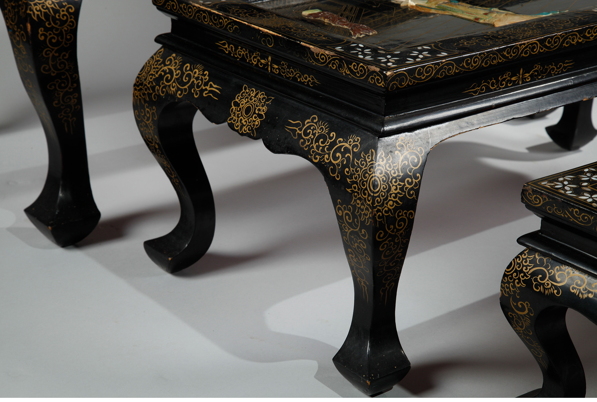 独角鹿西洋古董家具中国黑漆描金硬石镶嵌西厢记主题边桌三套几