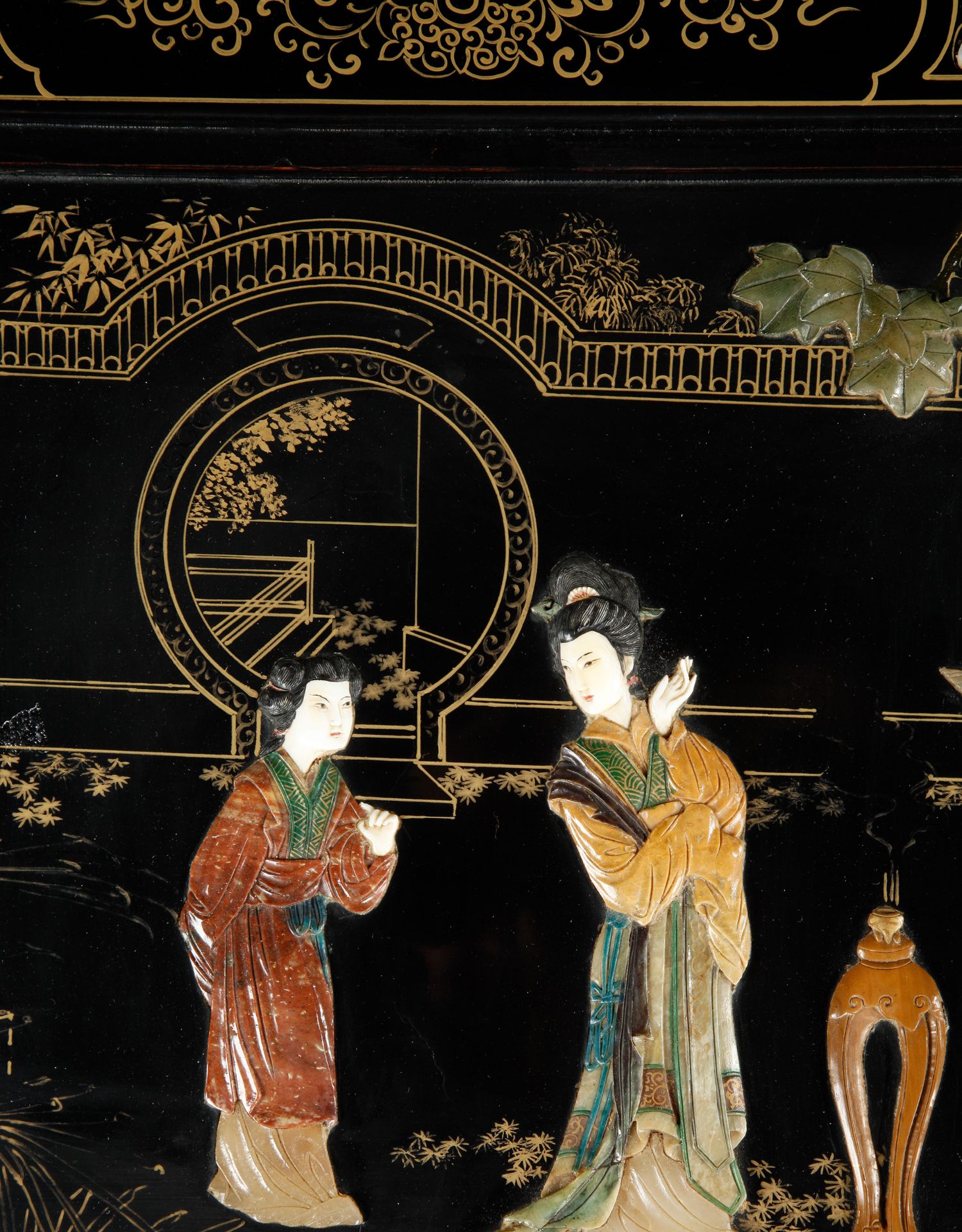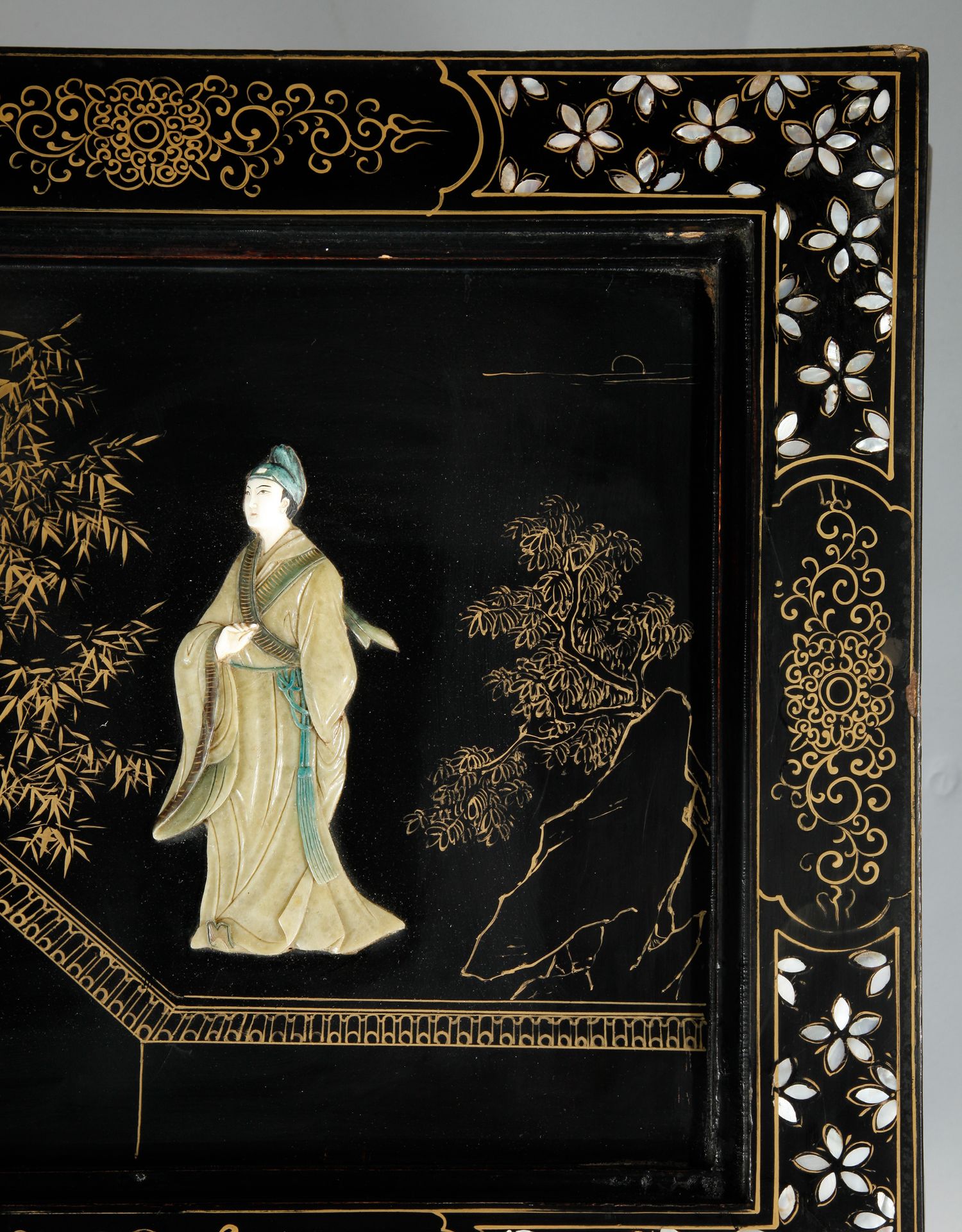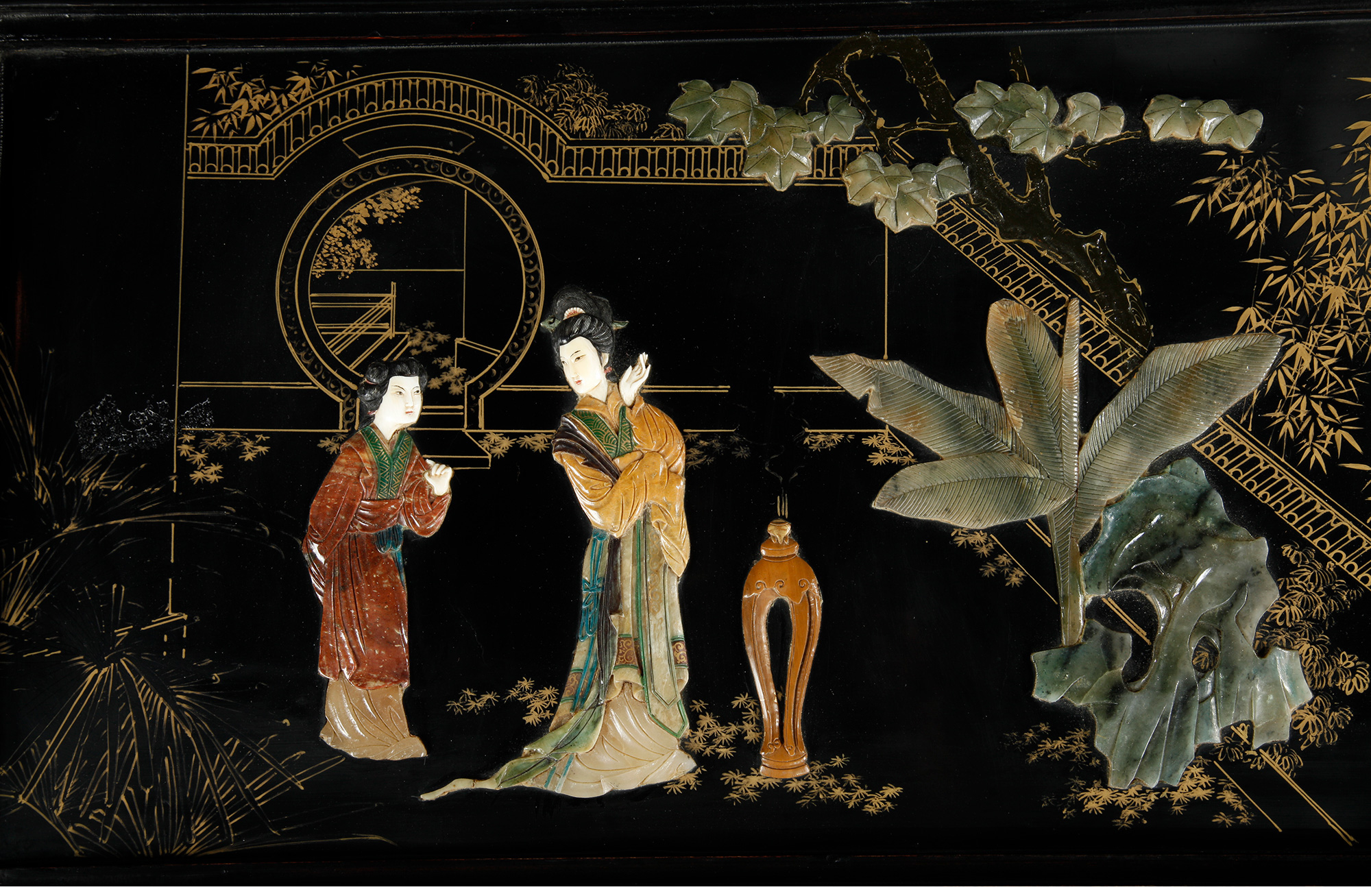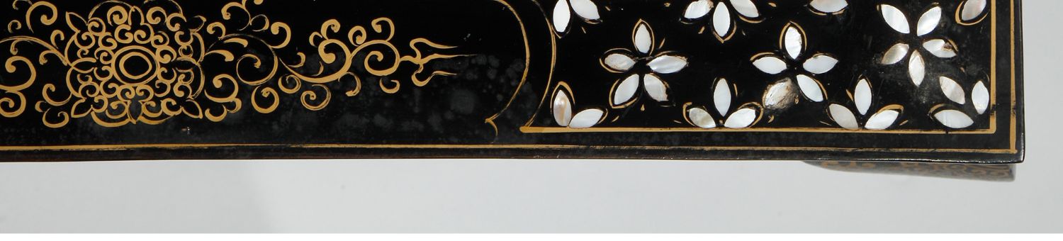 独角鹿西洋古董家具中国黑漆描金硬石镶嵌西厢记主题边桌三套几