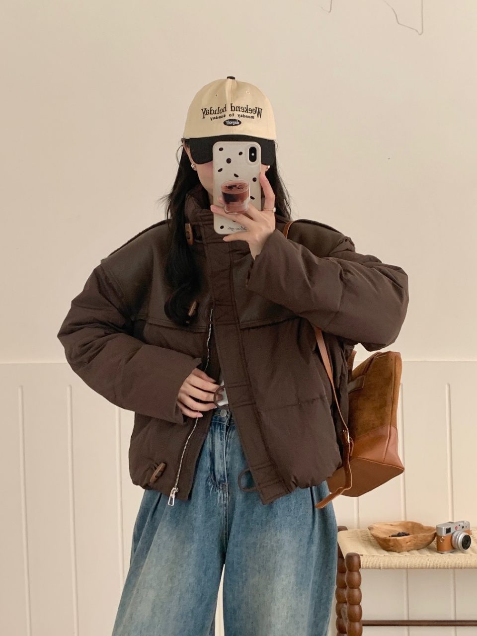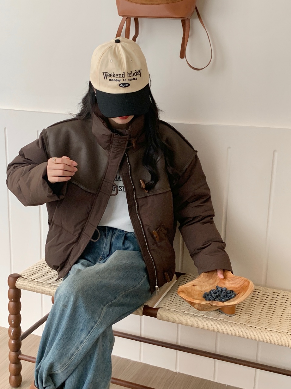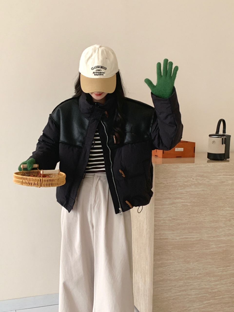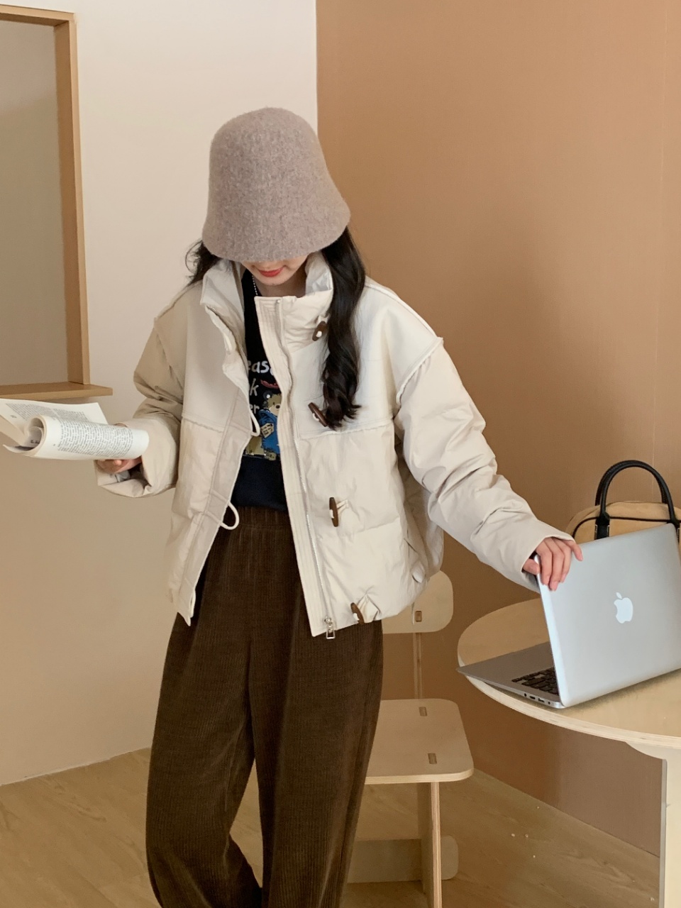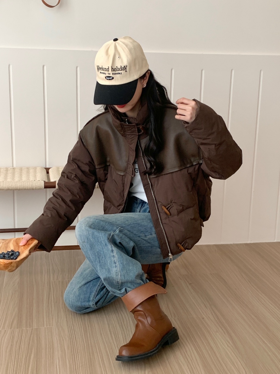 【YW】无忧购韩版简约小众百搭牛角扣立领拼皮羽绒外套24127#(截单后7天发货)25年清仓捡漏
