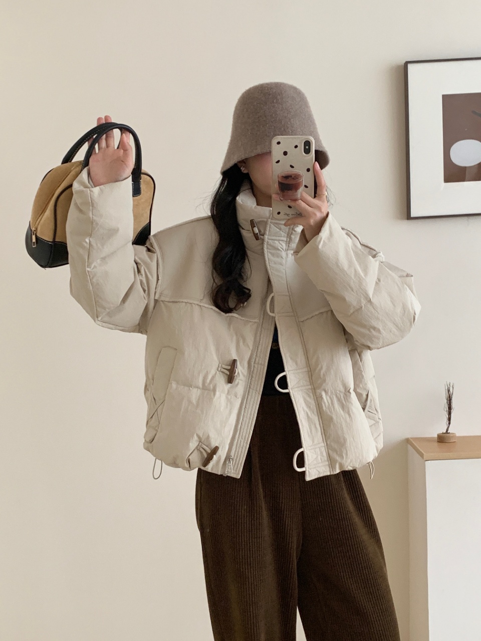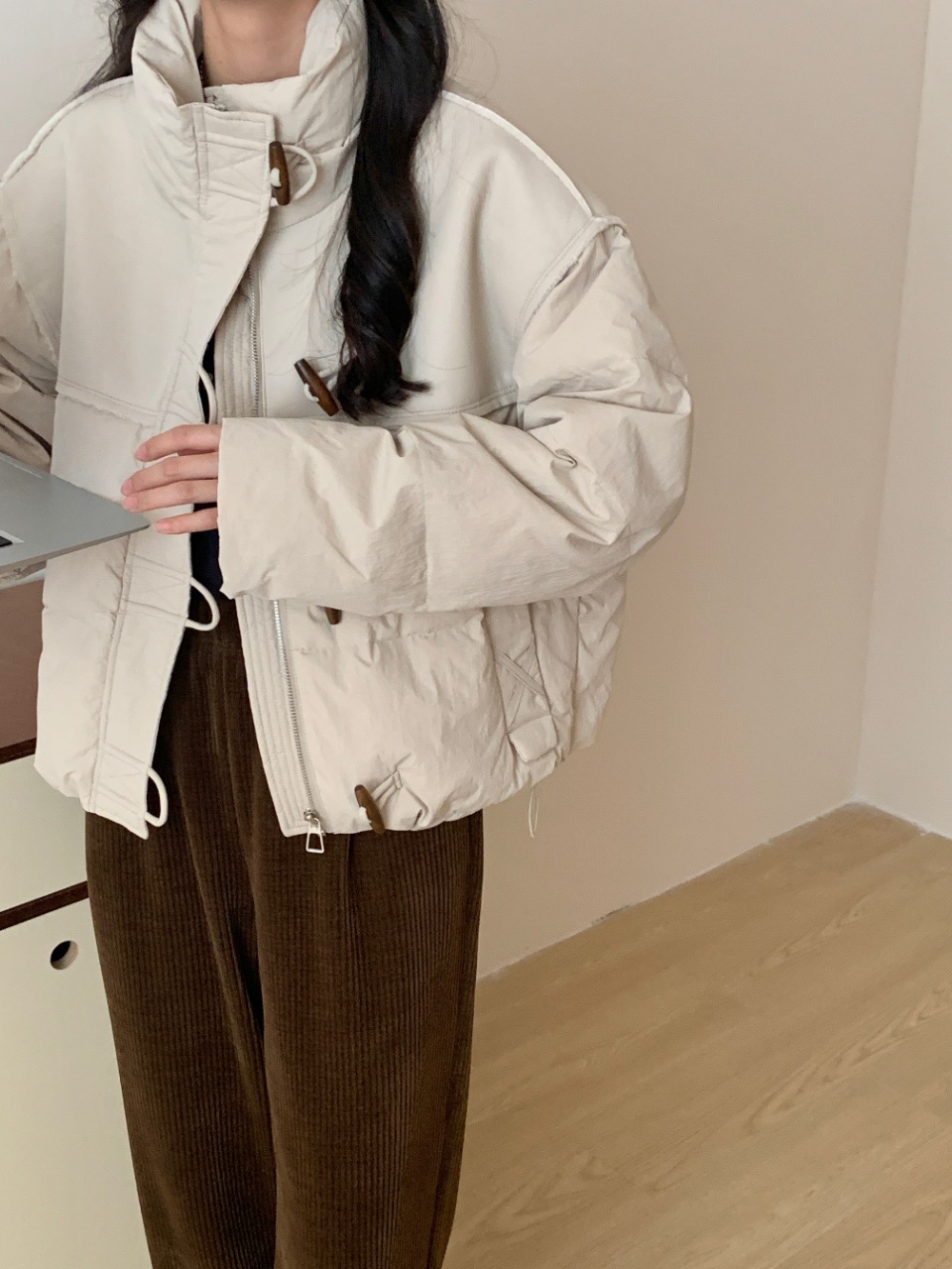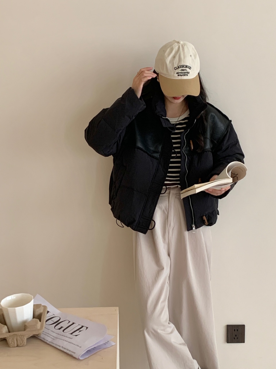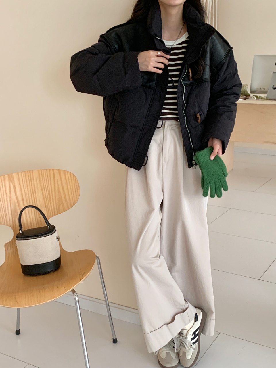 【YW】无忧购韩版简约小众百搭牛角扣立领拼皮羽绒外套24127#(截单后7天发货)25年清仓捡漏