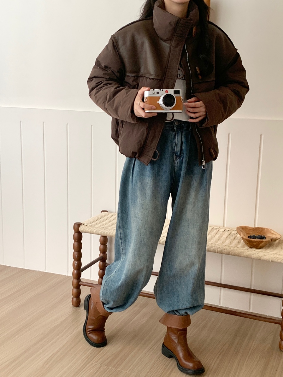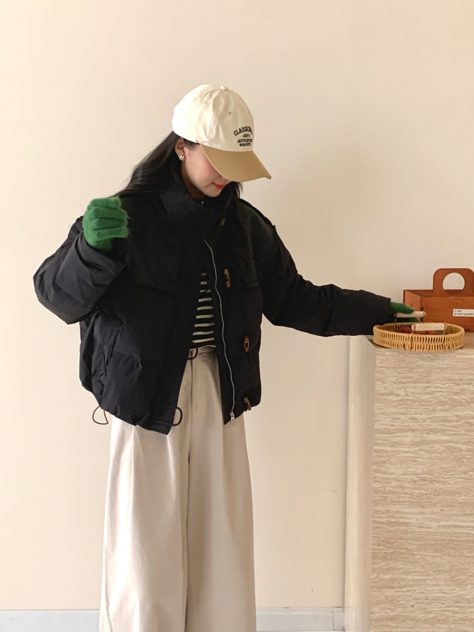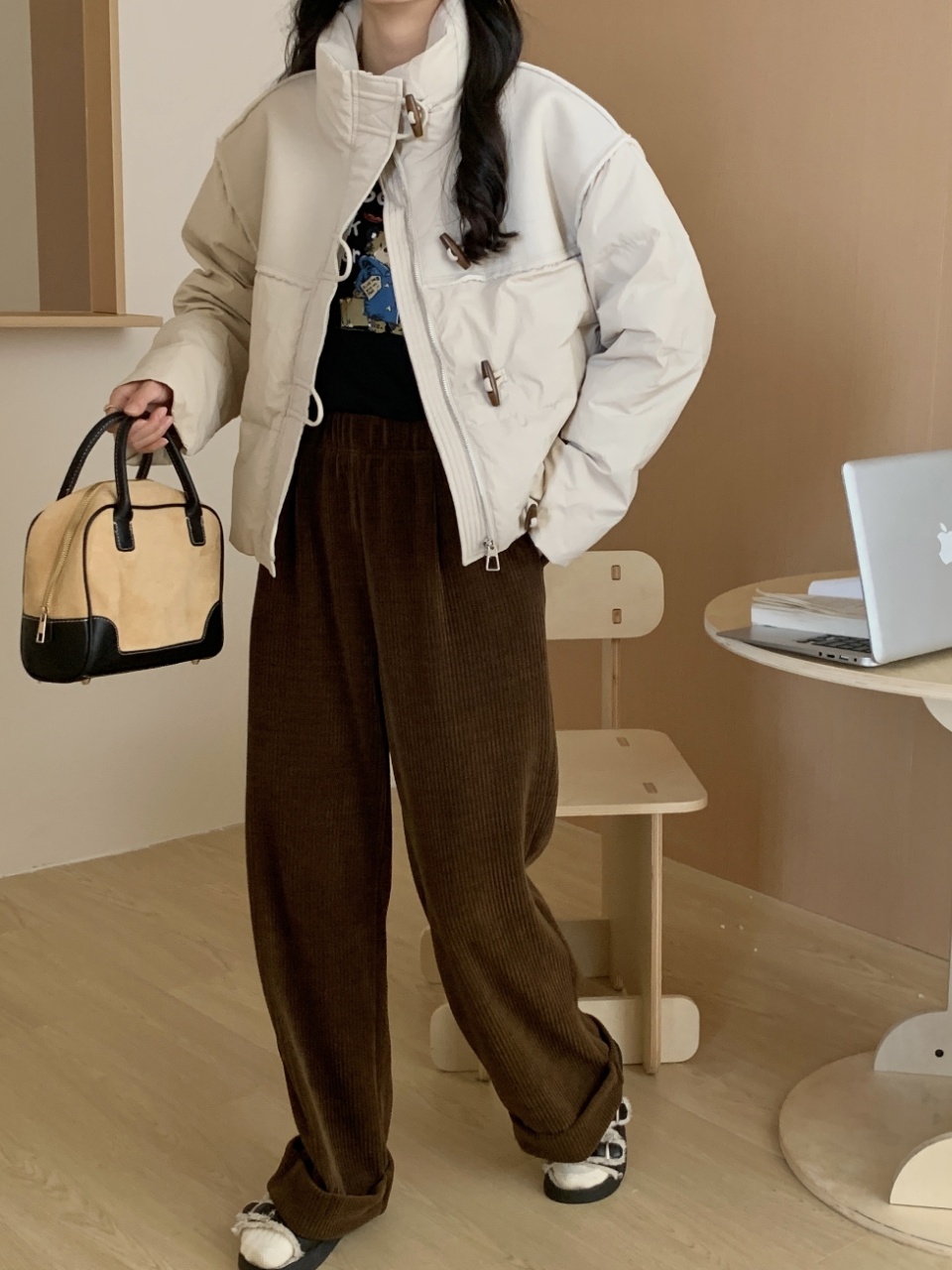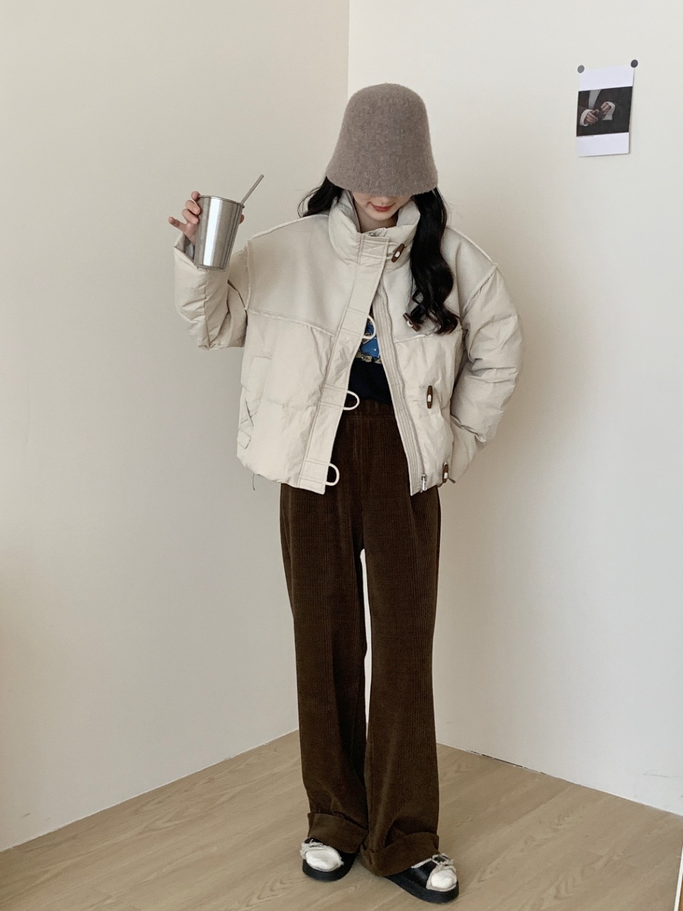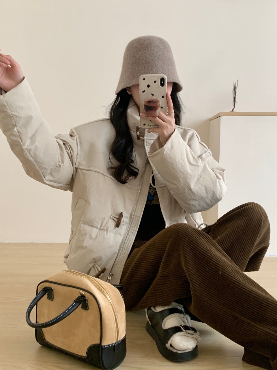 【YW】无忧购韩版简约小众百搭牛角扣立领拼皮羽绒外套24127#(截单后7天发货)25年清仓捡漏