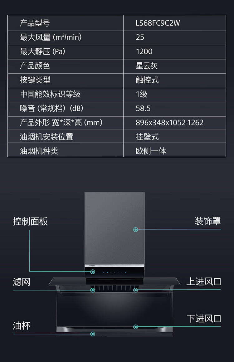 西门子(SIEMENS) 7字型顶侧双吸油烟 家用大吸力超薄智能变频抽油烟 除菌自清洁 LS68FC9C2W