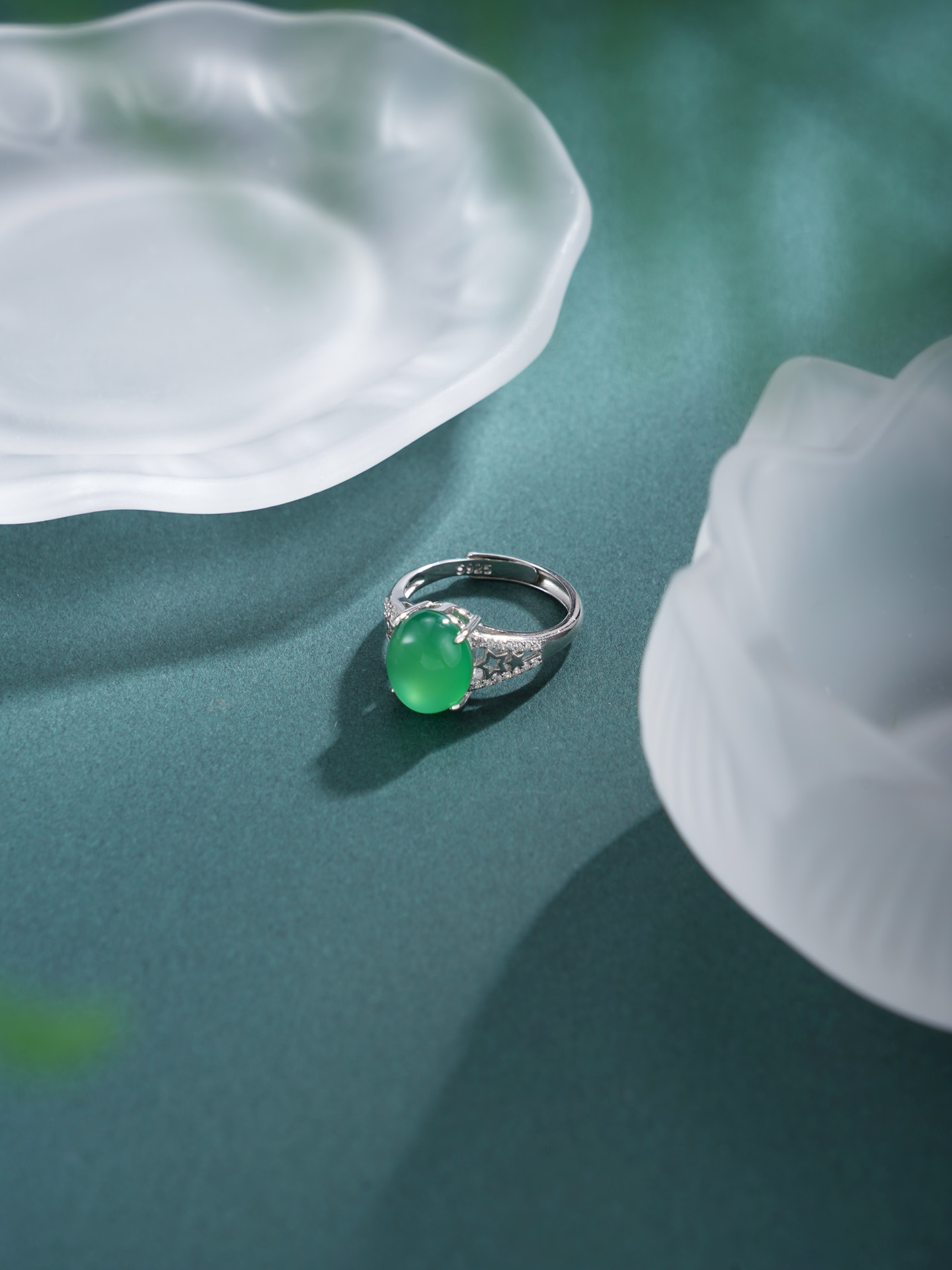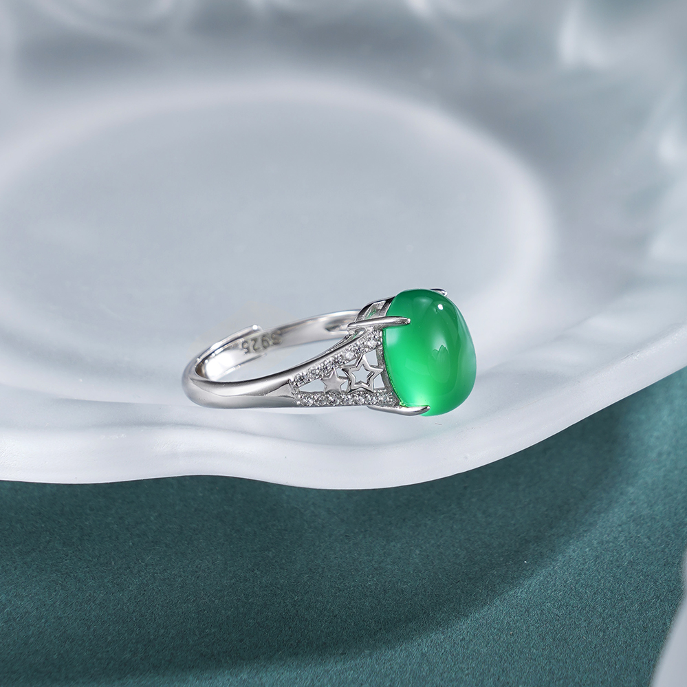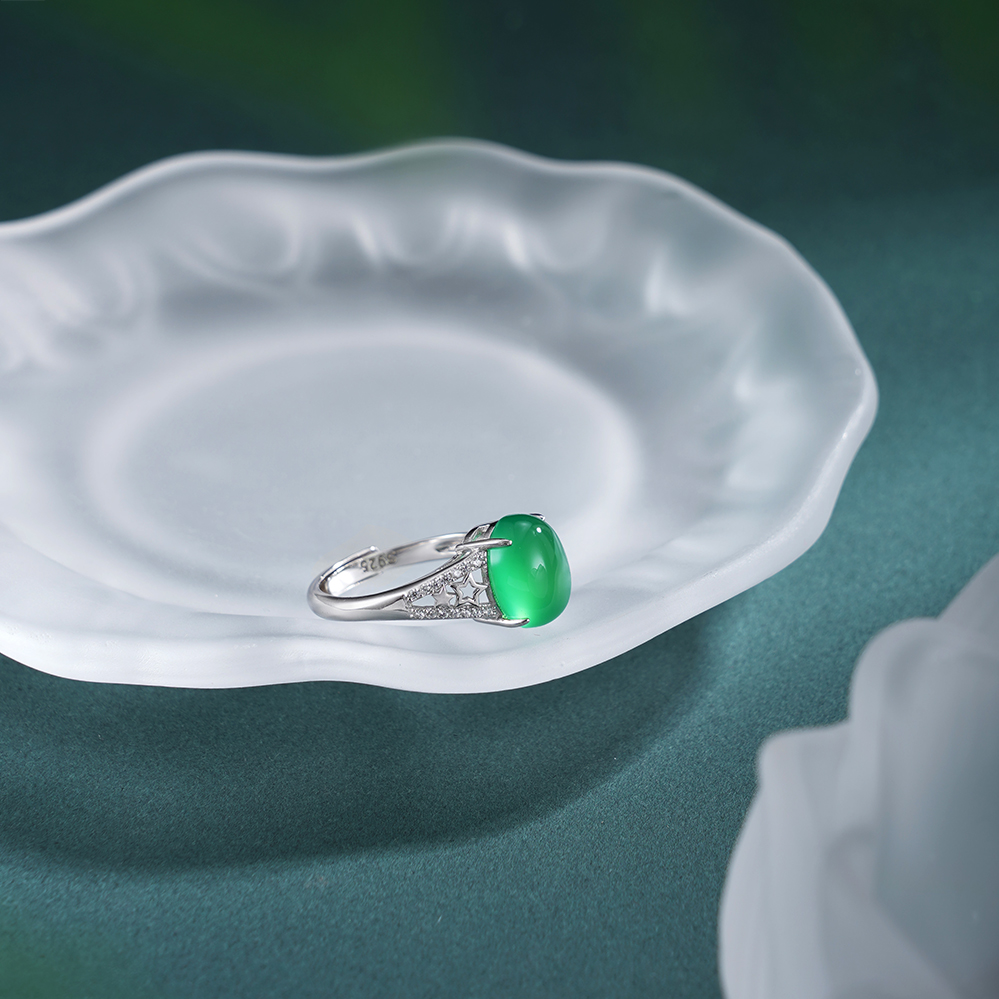 【寓意】:纯银戒托精铸镂空星星纹样,镶嵌蛋面绿玉髓,取“绿漪星辰”之名,寓意人生如星,璀璨不息,亦似清漪,澄澈常新。