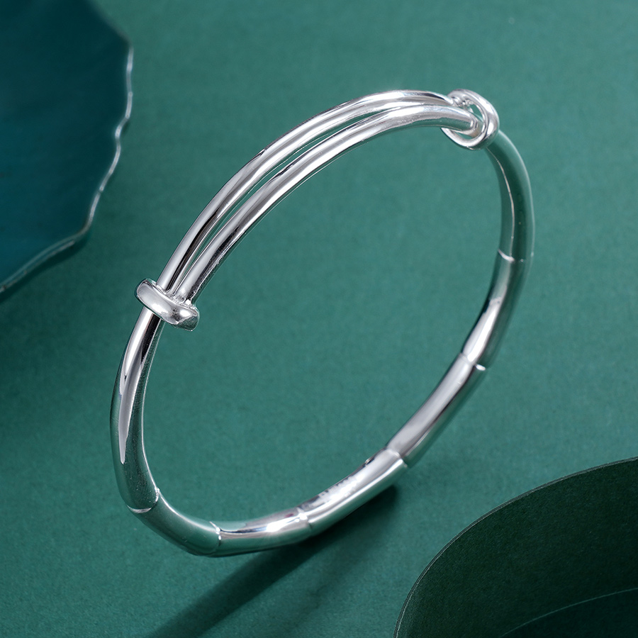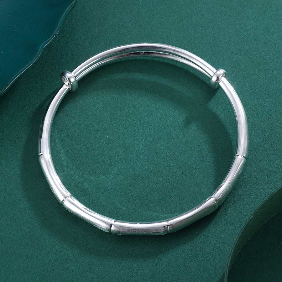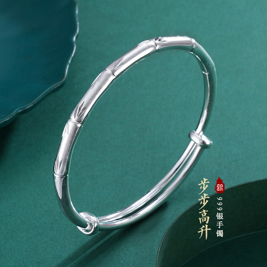 【寓意】:竹节推拉式纯银手镯,巧妙保留了竹节凹凸纹理,寓意节节高升。表面抛光打磨,简约设计唤醒宁静淡泊之气。
