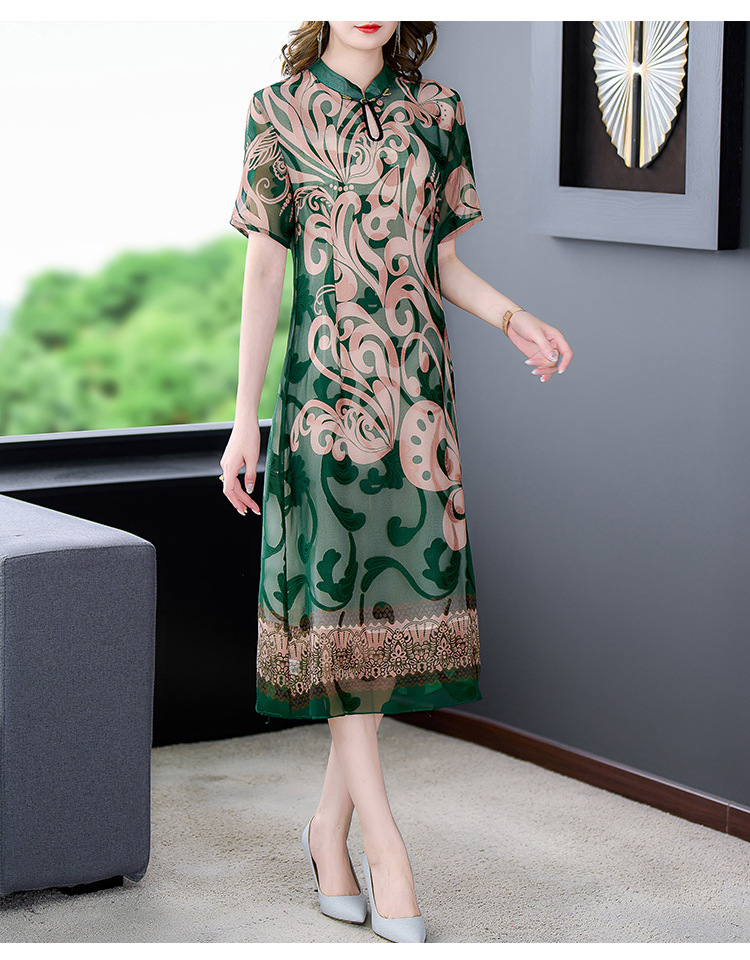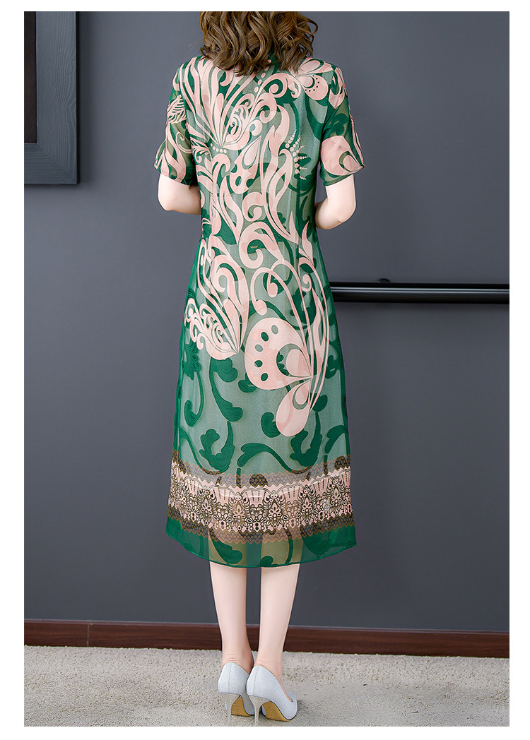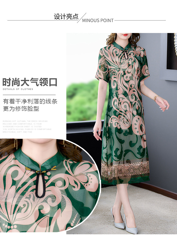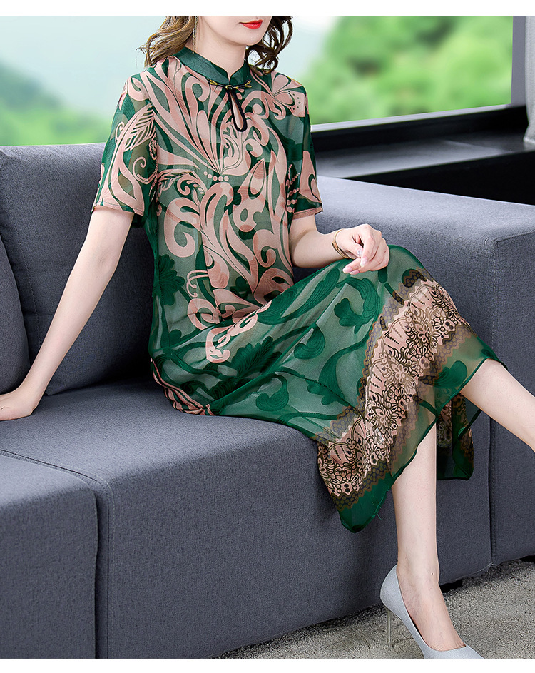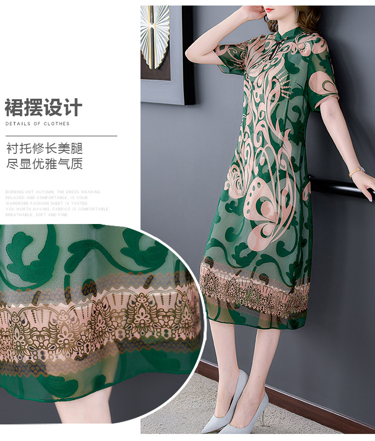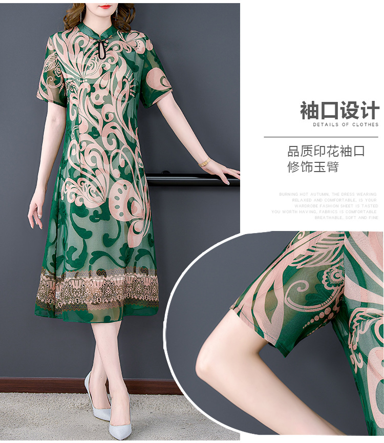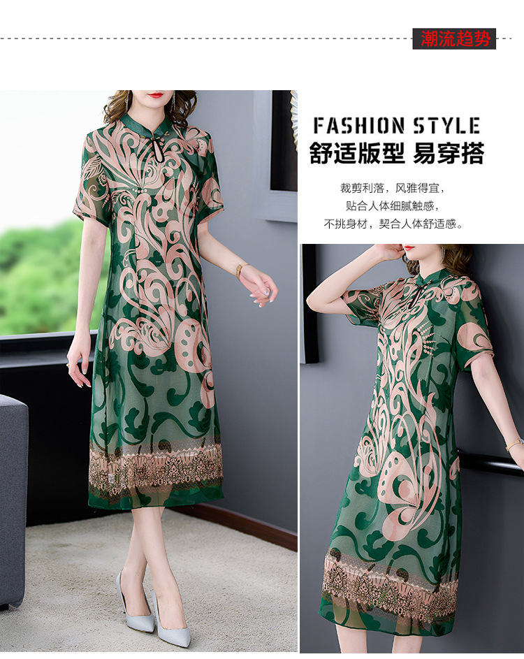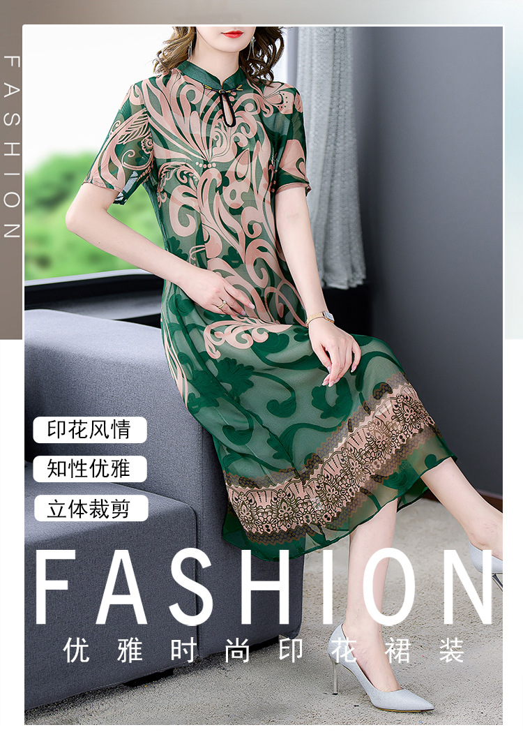 时尚优雅,女夏季新款妈妈装中国风长裙复古印花桑蚕丝连衣裙AHM-snwl9351