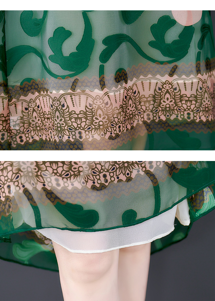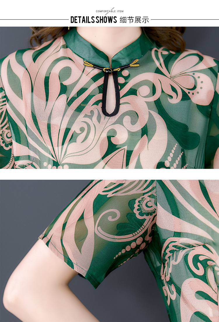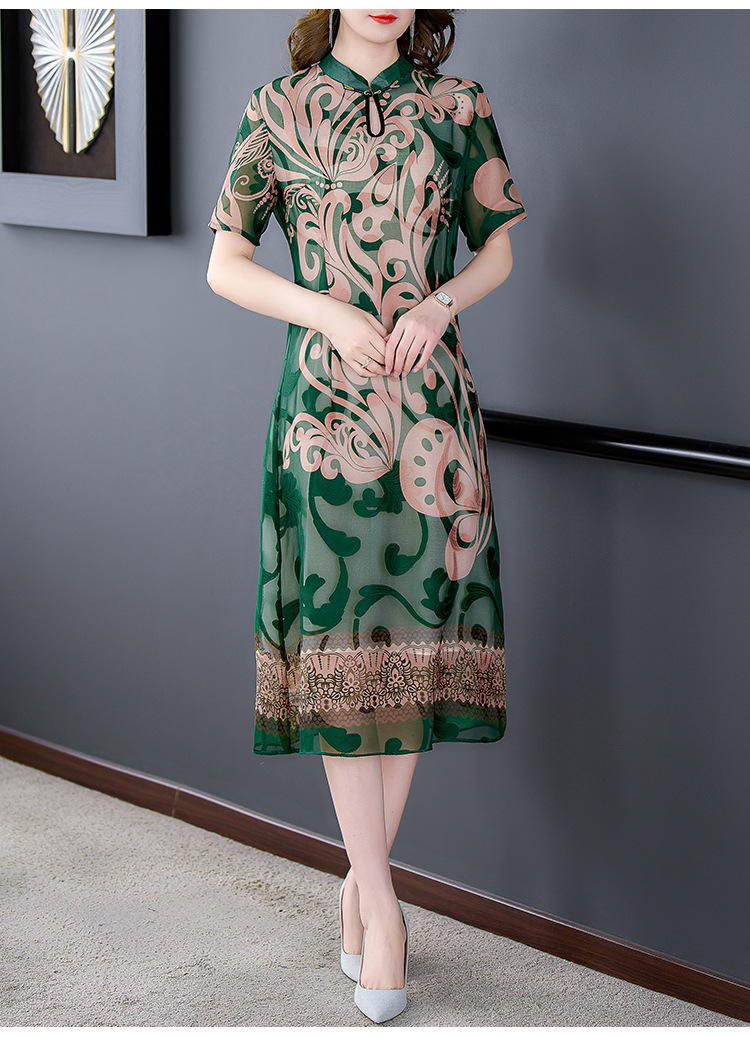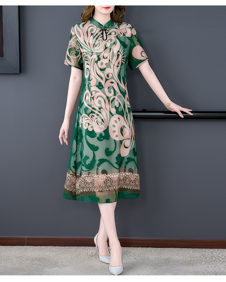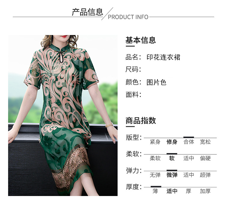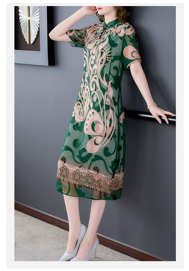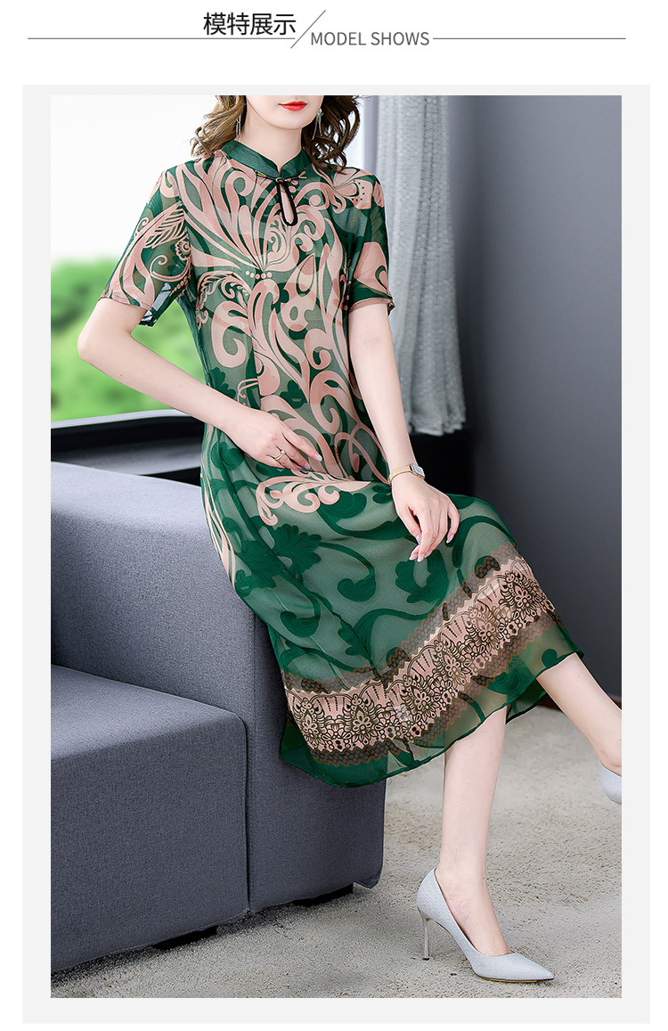 时尚优雅,女夏季新款妈妈装中国风长裙复古印花桑蚕丝连衣裙AHM-snwl9351