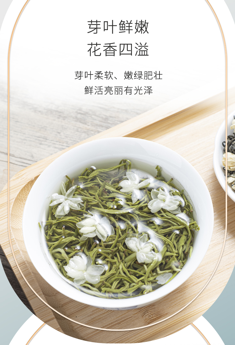 2、与茉莉花窨制结合后突出表现为浓郁的花香和清雅的花果香、嫩香的复合香气,富含芳樟醇氧化物等萜烯类挥发性物质,经烘焙后可转化为柔和甜香。干茶芽头肥壮、翠绿显毫,冲泡后汤色黄绿明亮,叶底嫩匀柔软整体风格清新怡人。