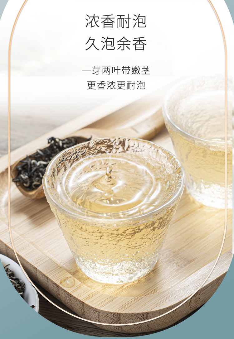 1、鲜采高山早春绿茶,采摘标准一芽两叶到三叶。这样的茶胚,既有芽头的鲜爽滋味,又有嫩叶的高扬茶香,茶叶内质丰富,茶感饱满。