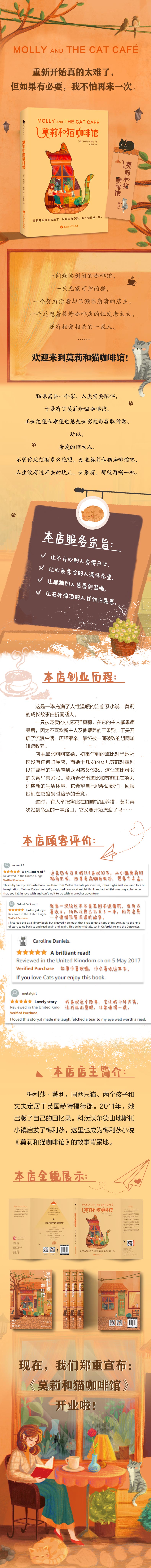 这是一本充满了人性温暖的治愈系小说,莫莉的成长故事曲折而动人。 一只被宠爱的小虎斑猫莫莉,在它的主人罹患痴呆后,它不喜欢新主人及他喂养的三条狗,于是开启了流浪生活。历经艰辛,最终被一间破败的胡同咖啡馆收养。 店主黛比刚刚离婚,初来乍到的黛比对当地社区没有任何归属感,而她十几岁的女儿苏菲对挥别以往熟悉的生活感到既困惑又愤怒。莫莉看得出黛比和苏菲正在努力适应新的生活环境,它希望自己能帮助她们,回报她们在它狼狈时给予的善意。 这时,有人举报黛比在咖啡馆里养猫,莫莉再次站到命运的十字路口,它又要开始流浪了吗……