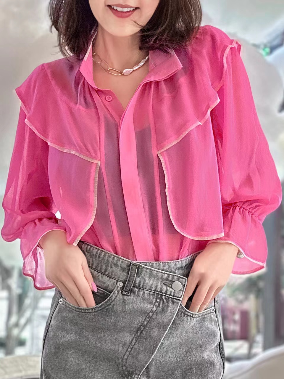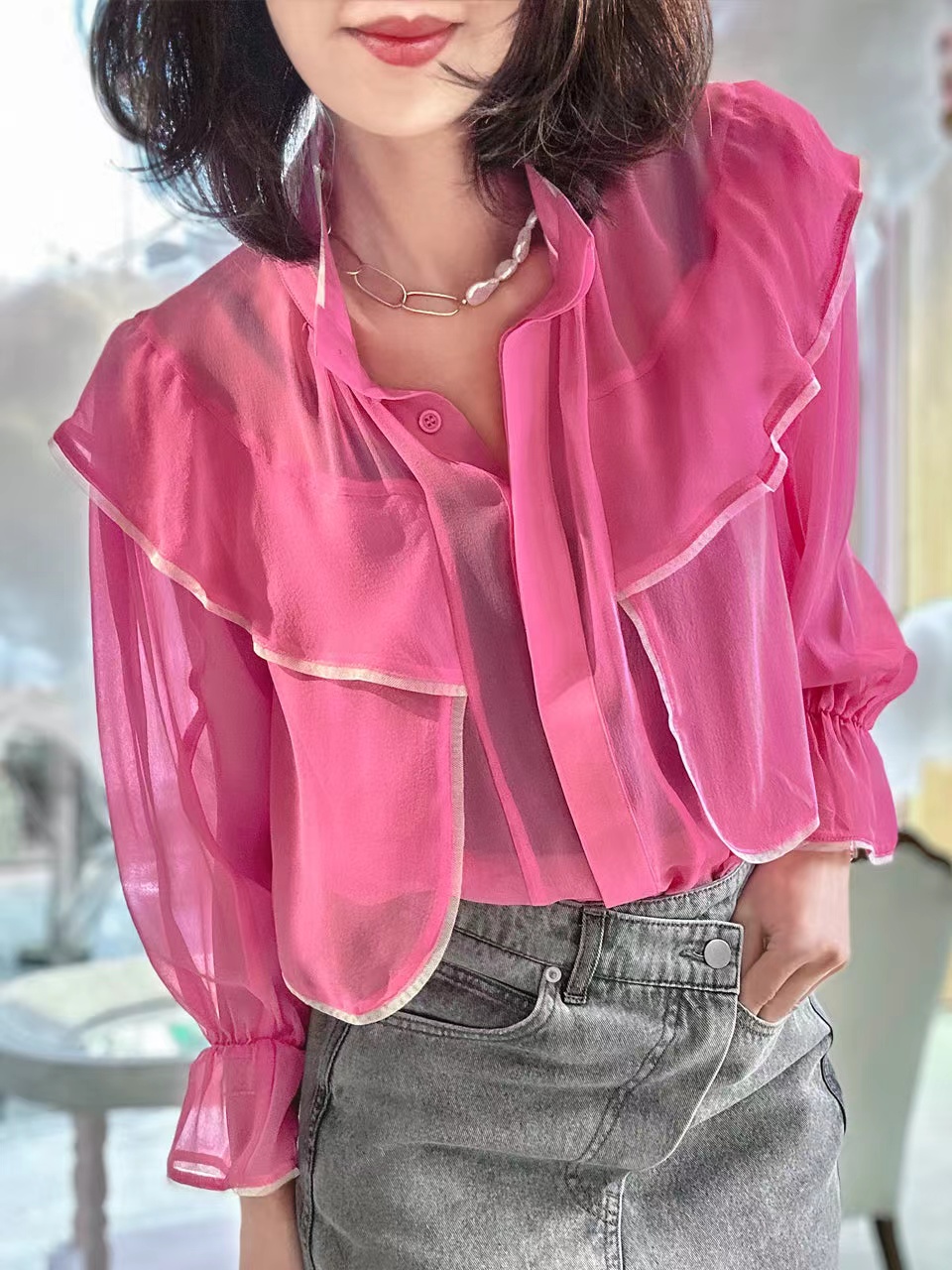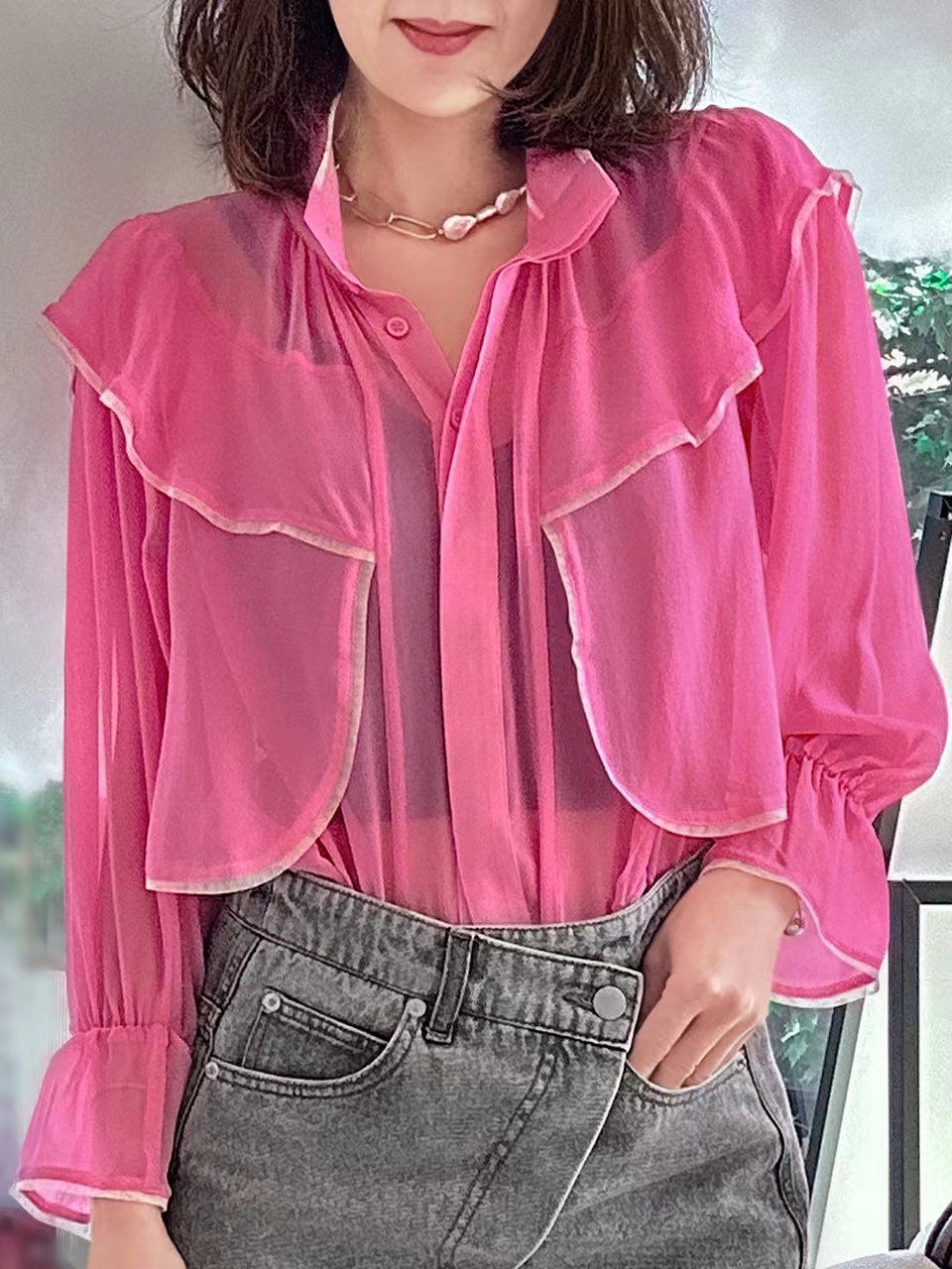 TYNVIE 立领雪纺长袖衬衫-粉色