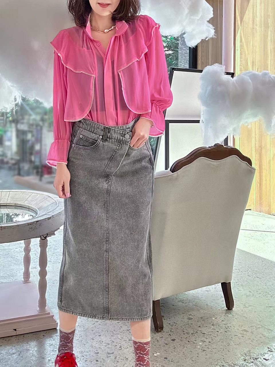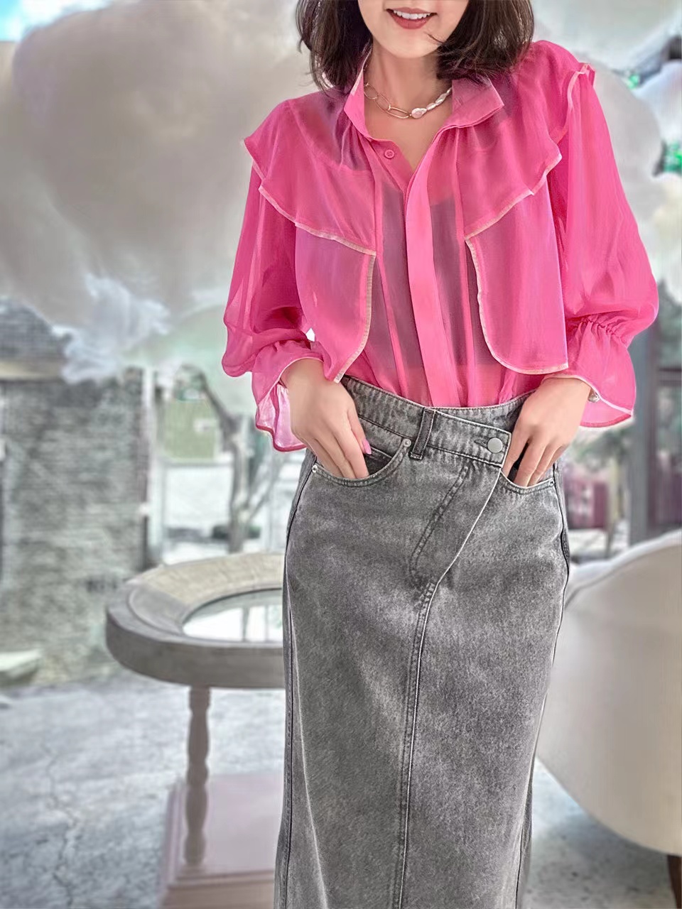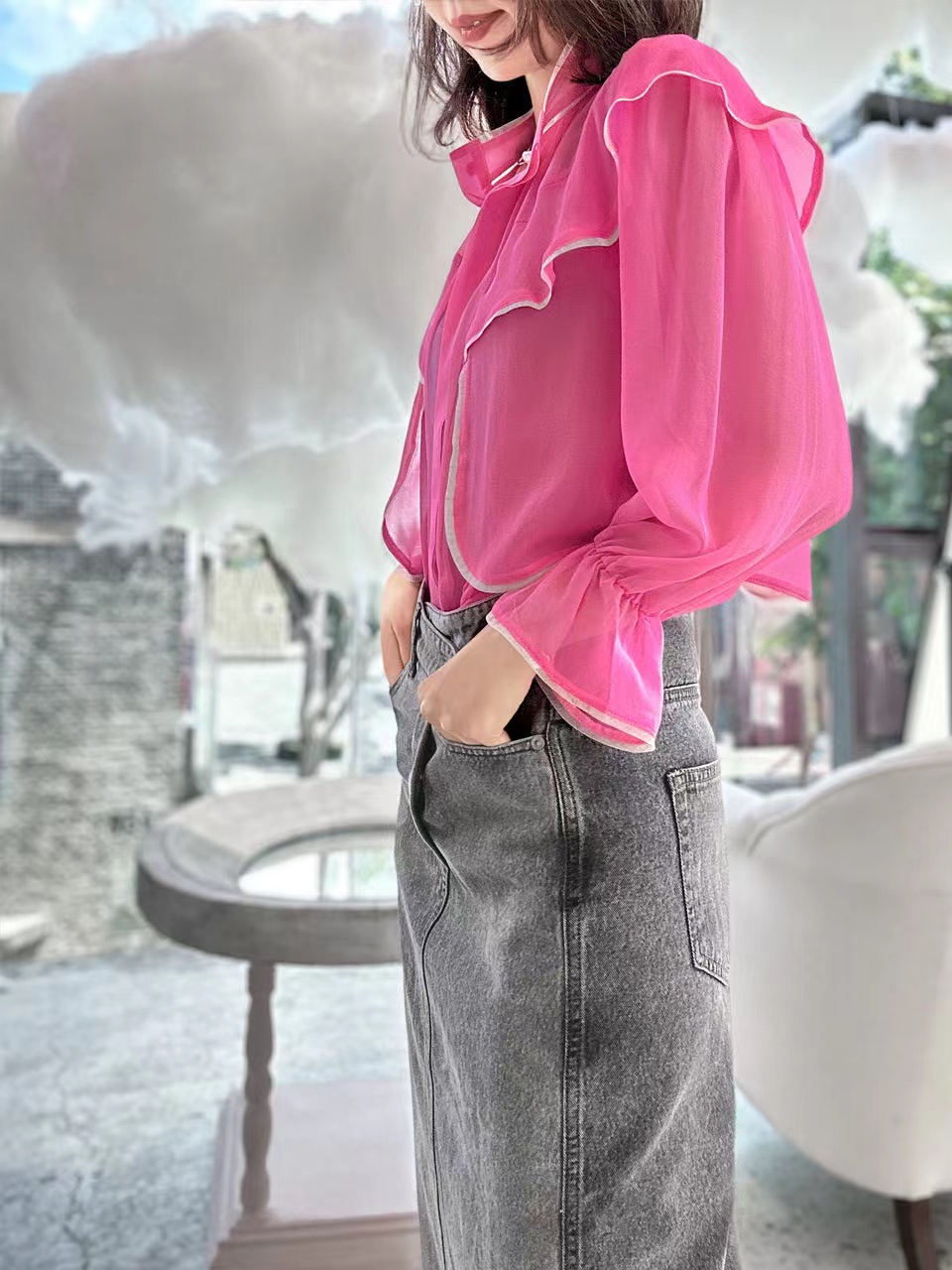 TYNVIE 立领雪纺长袖衬衫-粉色