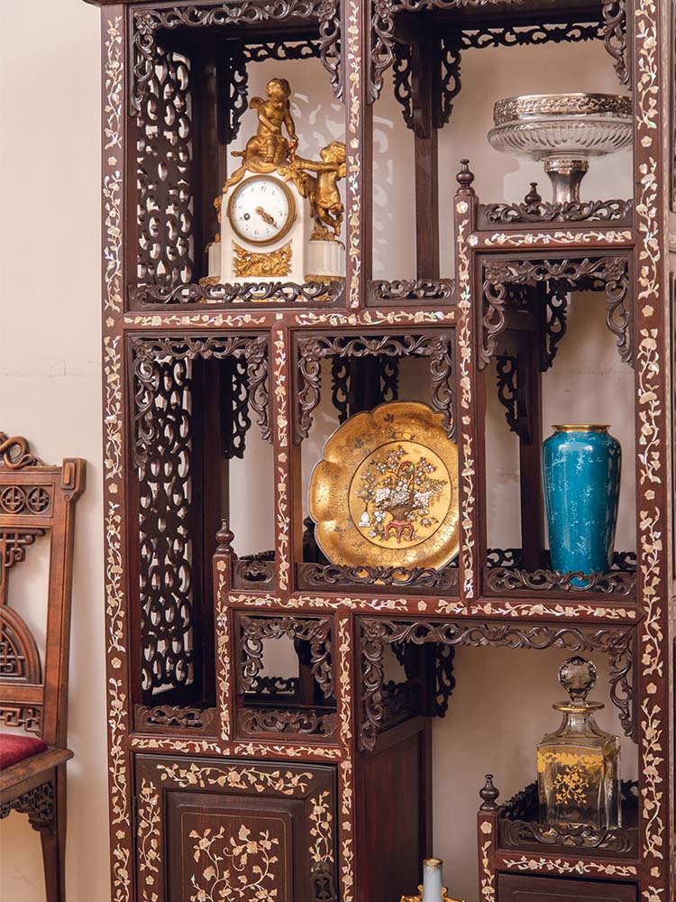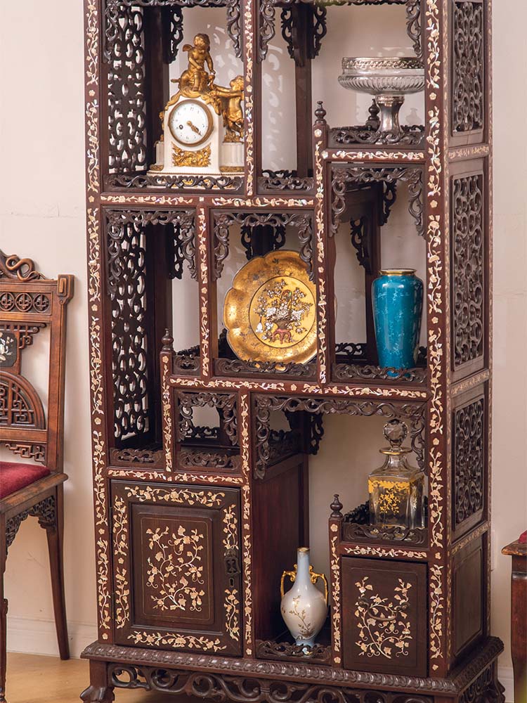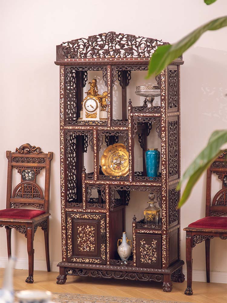 1900年代中国出品祥云卷叶纹镂雕装饰东方缠枝花卉主题螺钿镶嵌硬木多宝阁