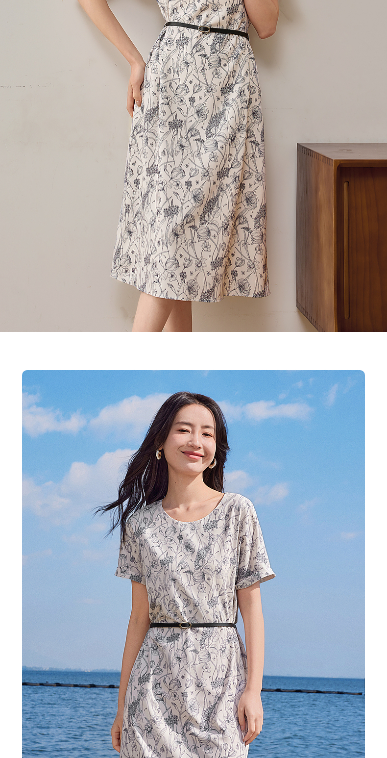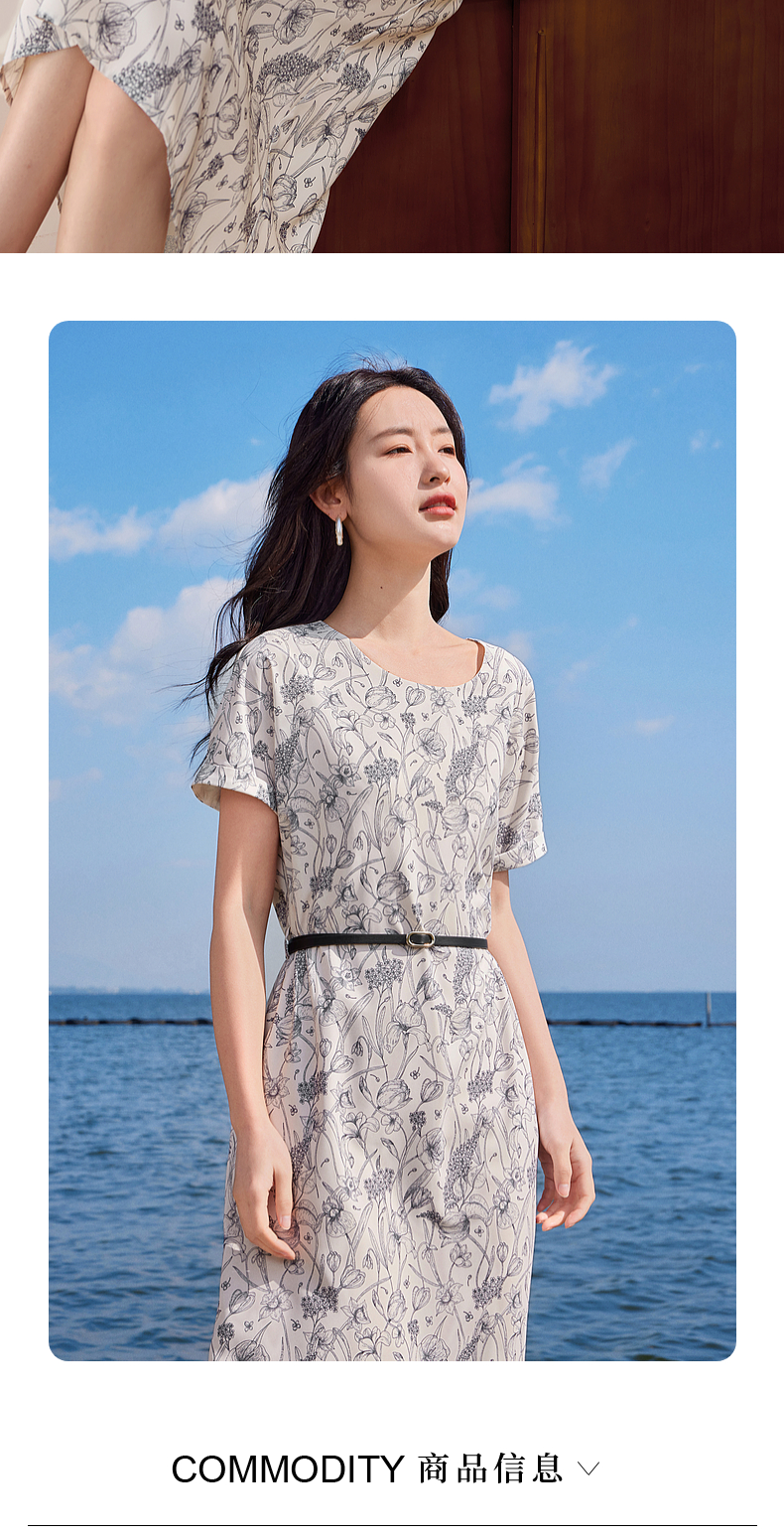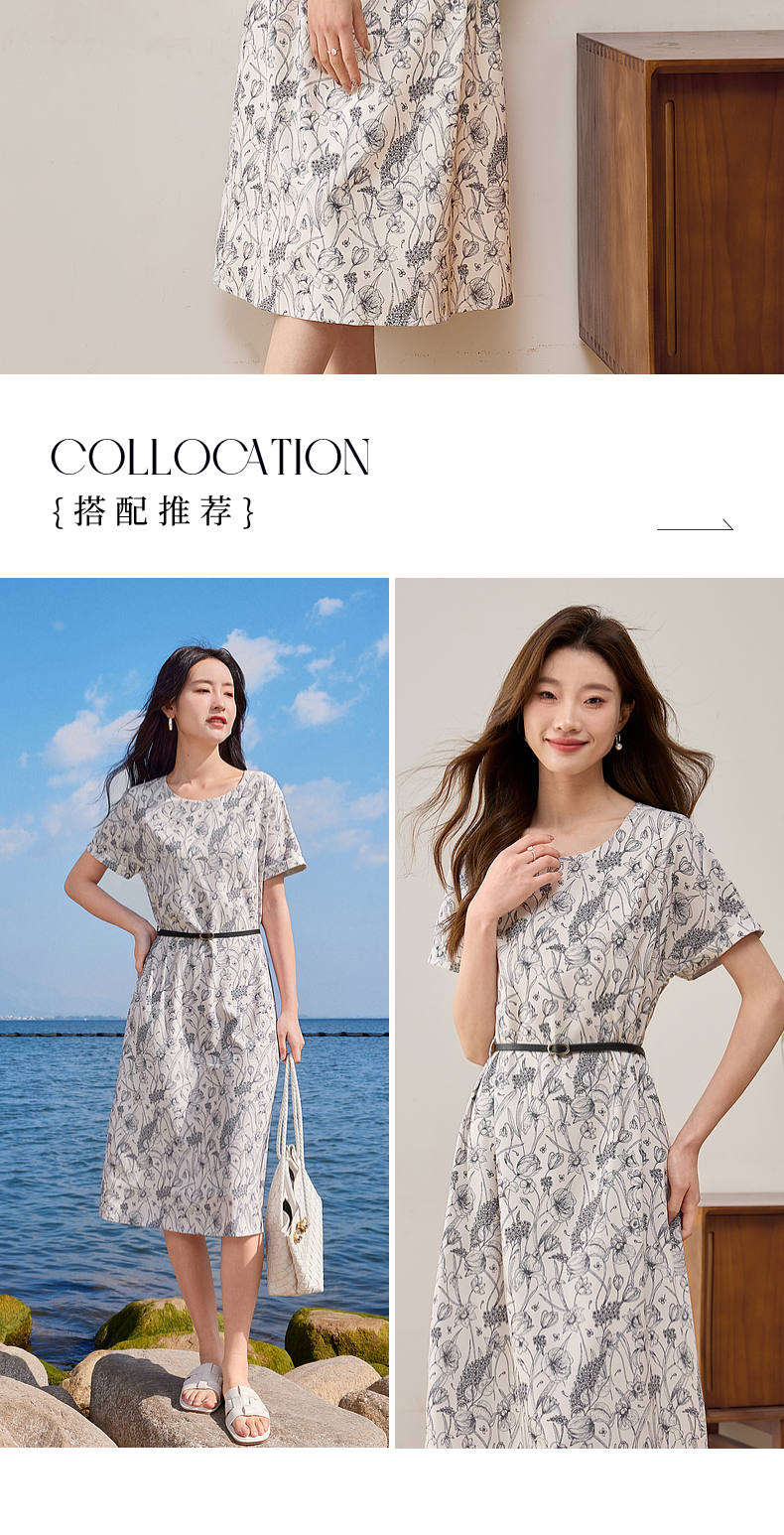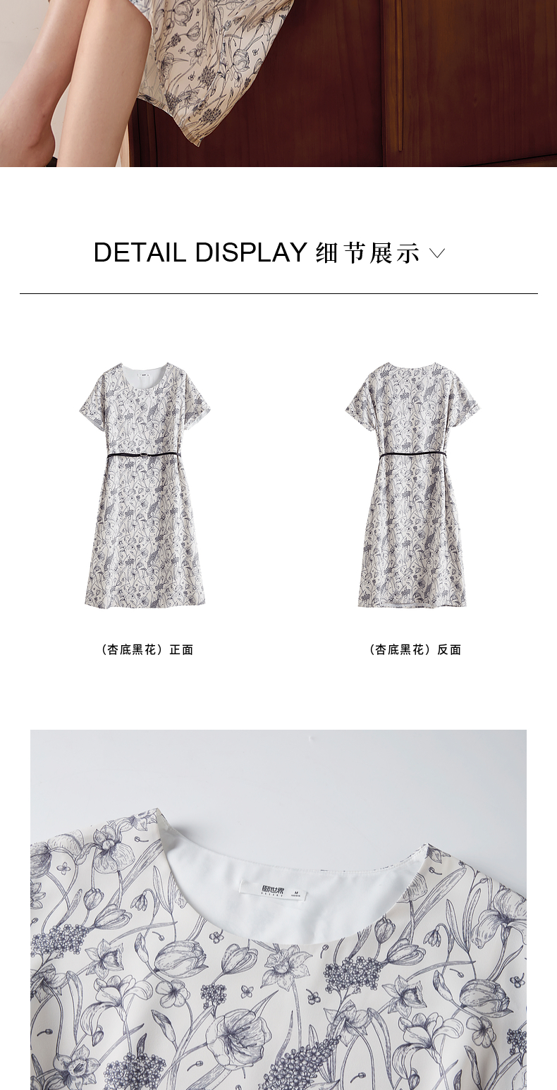 【专属特价】熙世界杏底黑花短袖连衣裙夏季新款复古印花裙子圆领显瘦中长裙