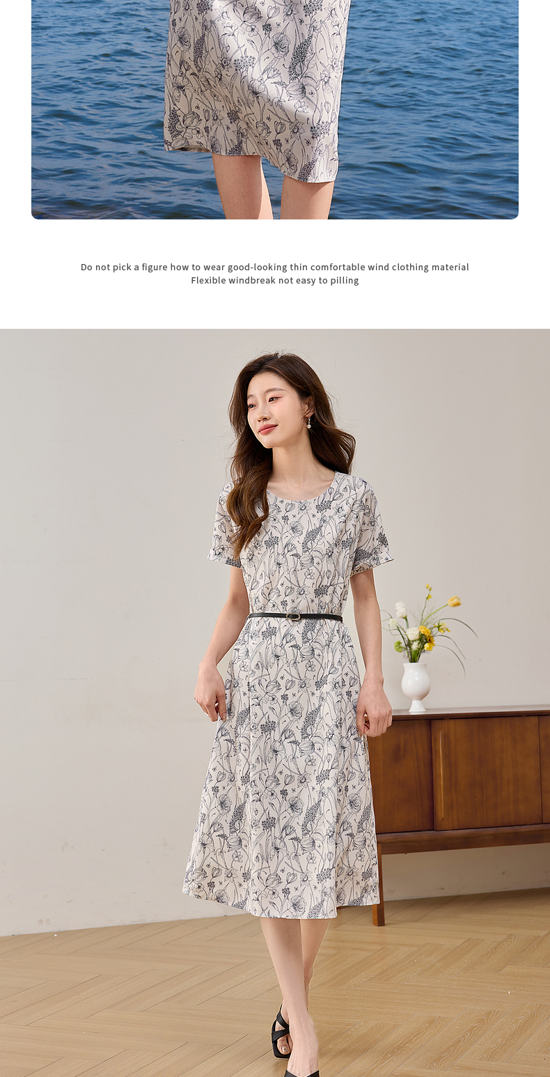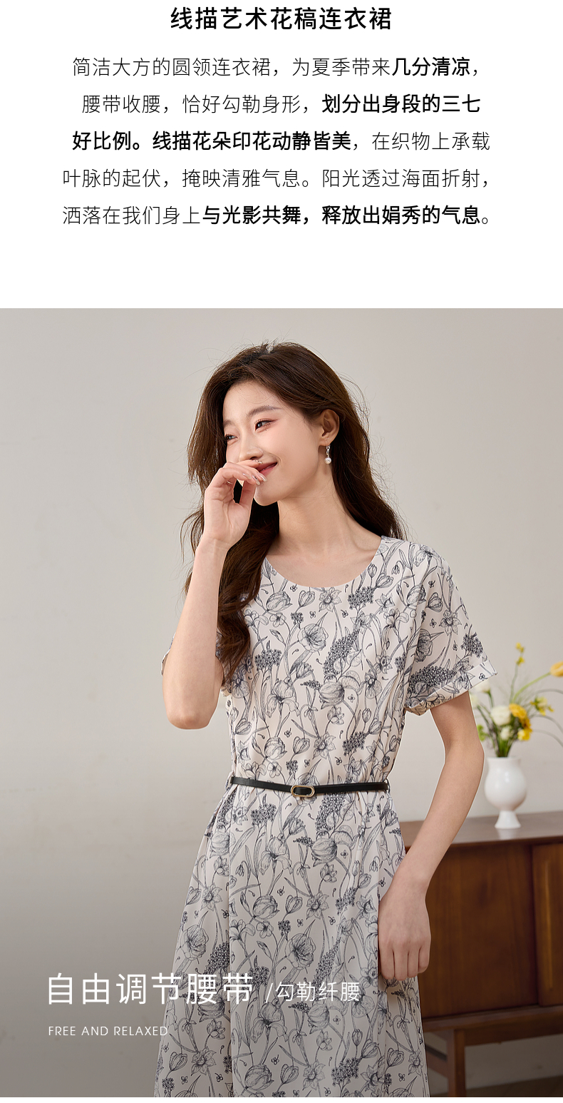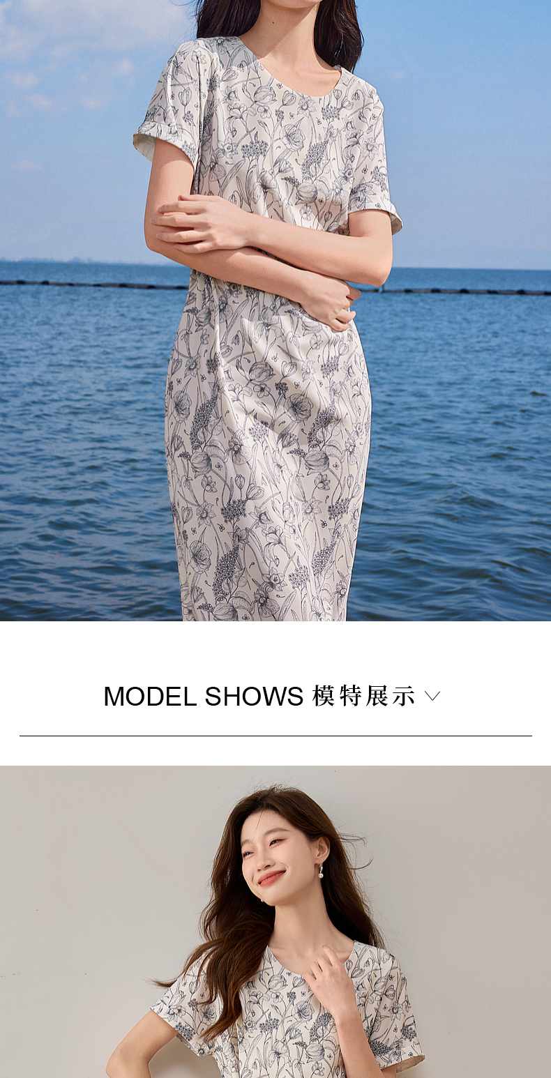 【专属特价】熙世界杏底黑花短袖连衣裙夏季新款复古印花裙子圆领显瘦中长裙