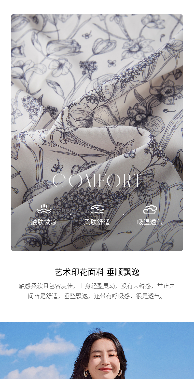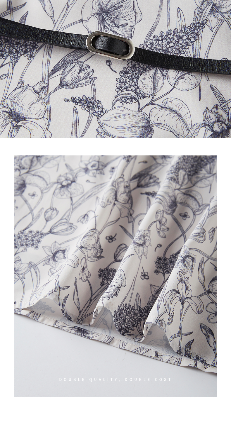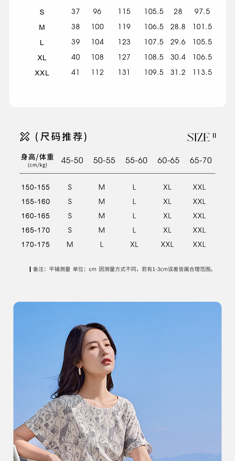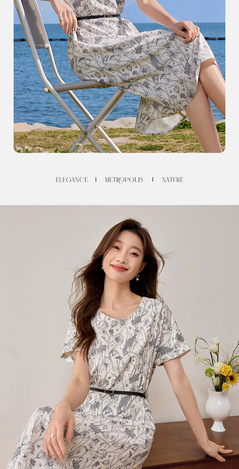 【专属特价】熙世界杏底黑花短袖连衣裙夏季新款复古印花裙子圆领显瘦中长裙