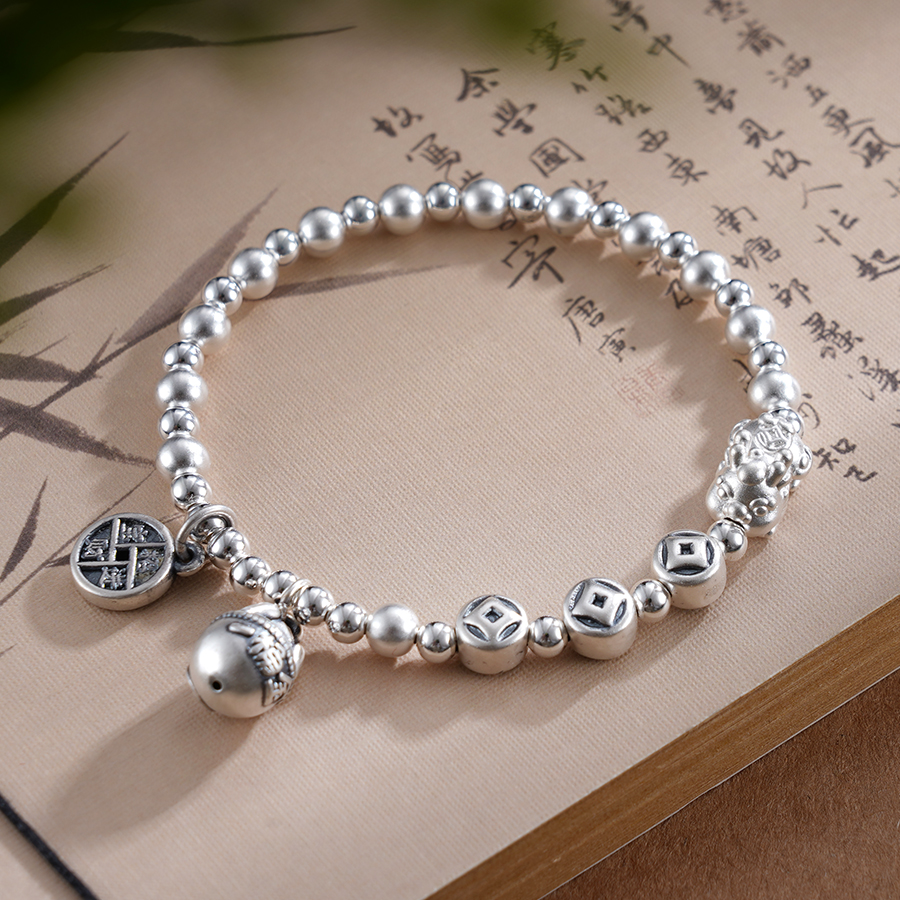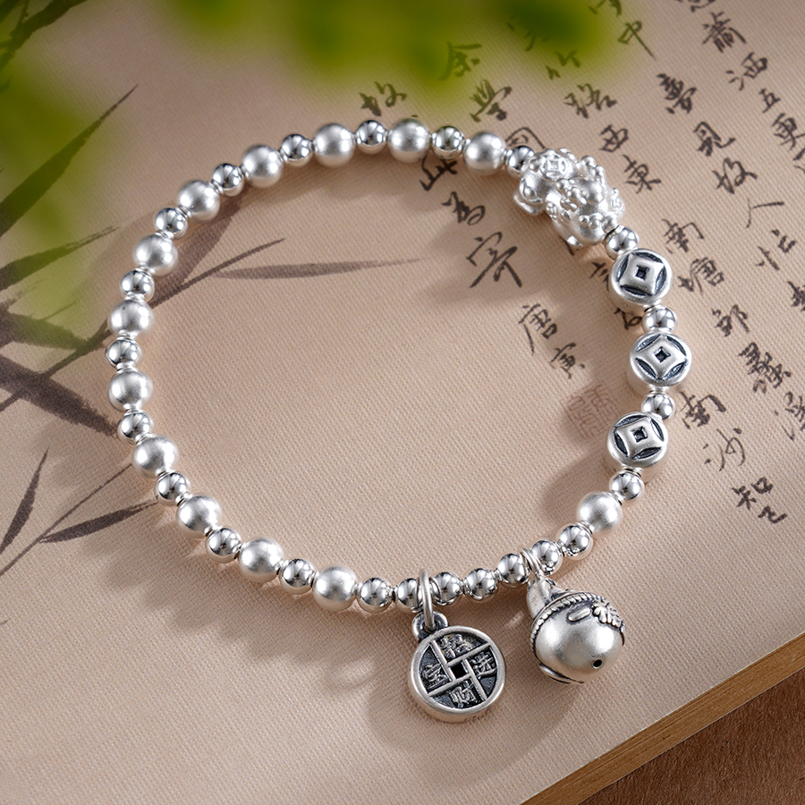 【寓意】:仿古貔貅手串,尽显立体之美。圆润珠子串联成串,巧妙悬吊铜钱吊坠,古韵悠悠,招财纳瑞。