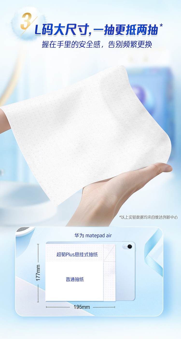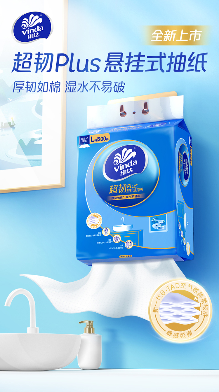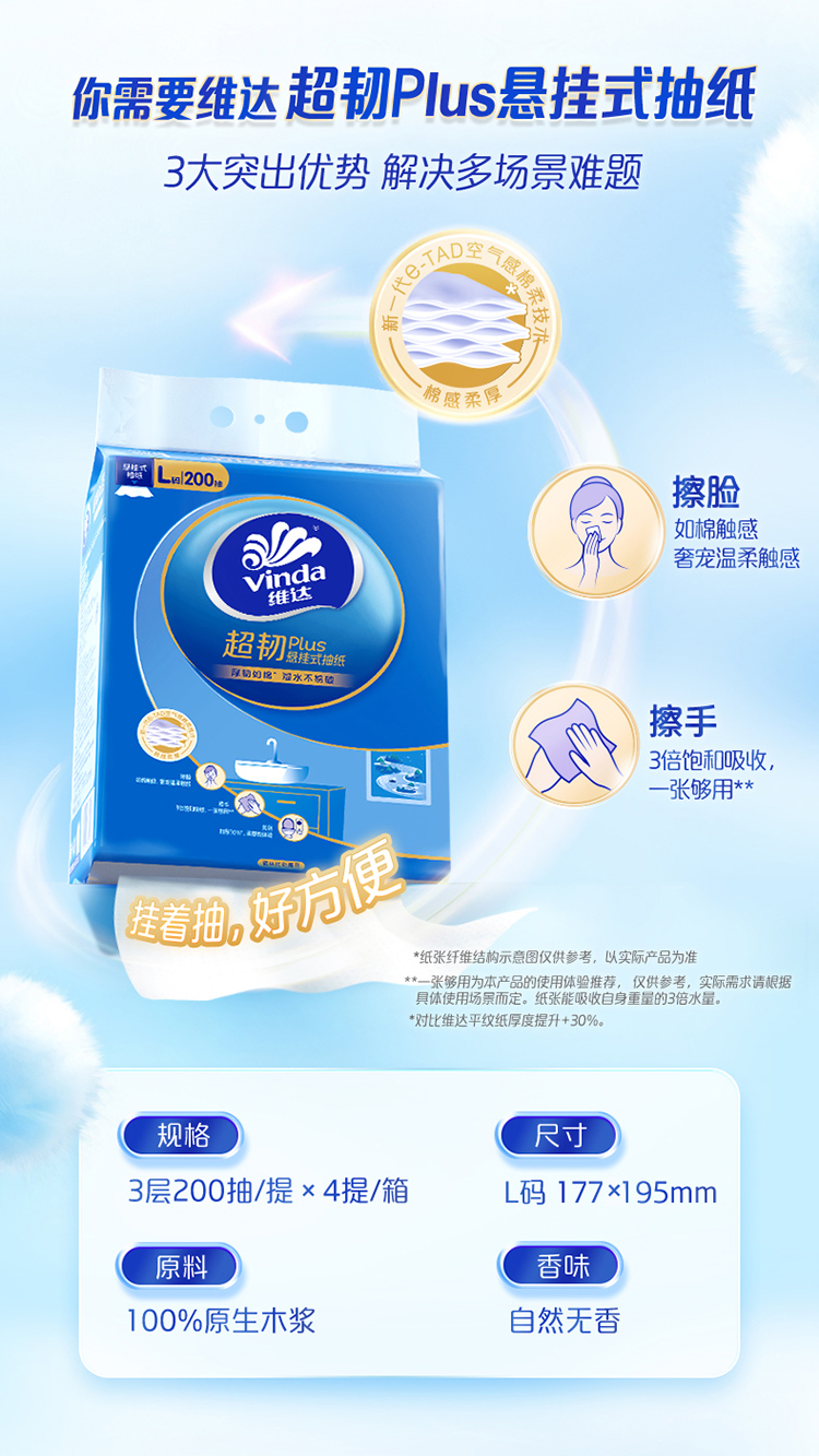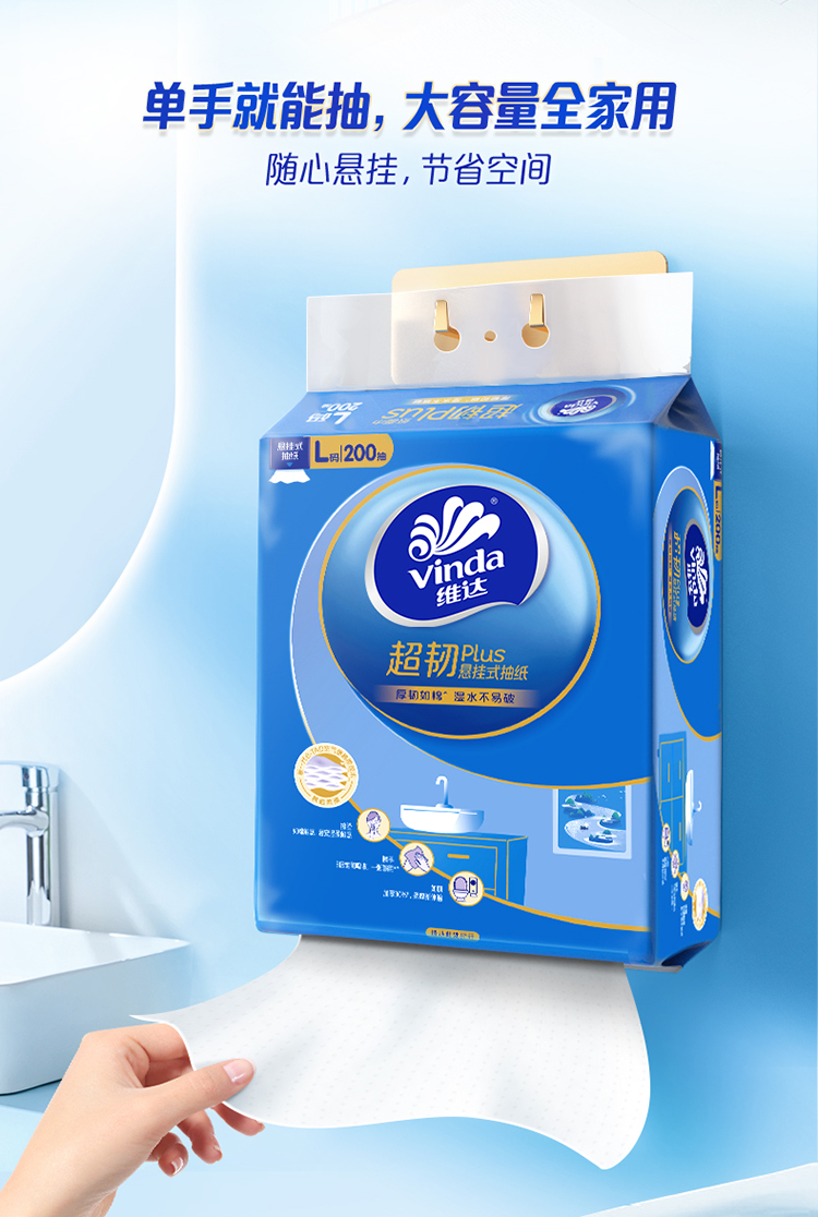 维达 悬挂式超韧plus抽纸L码大张3层200抽4包 湿水不易破 送挂钩 48小时发货