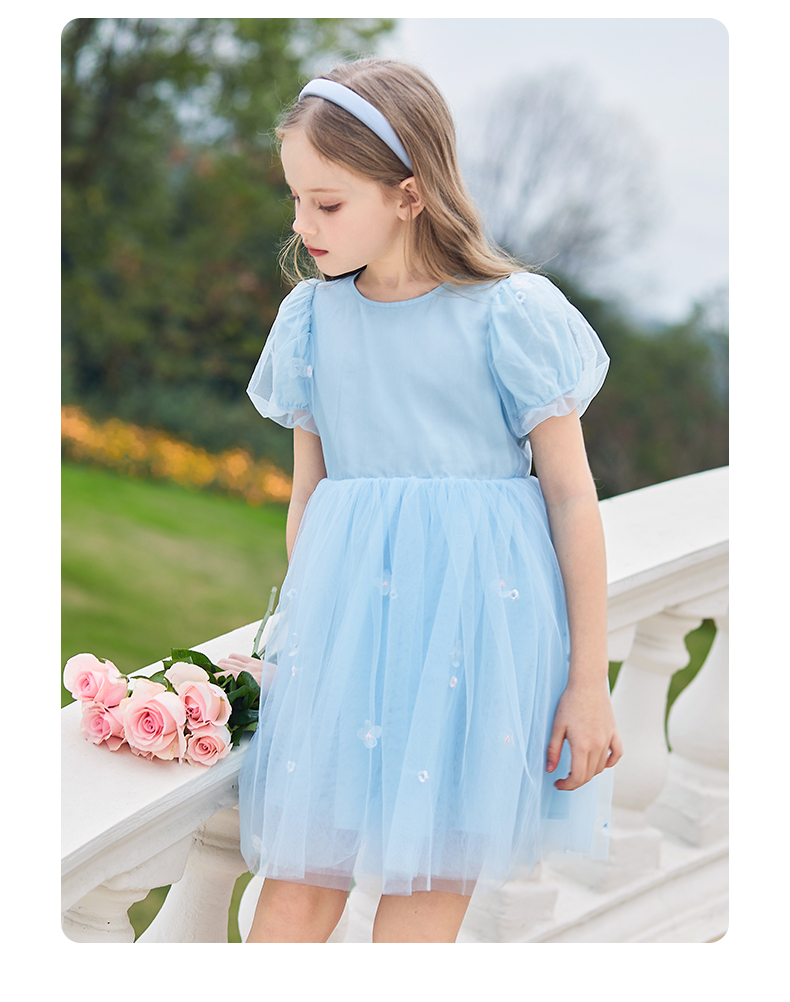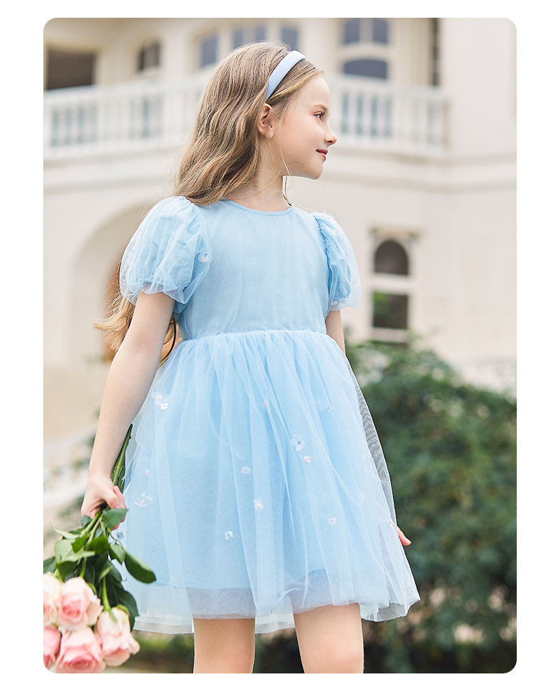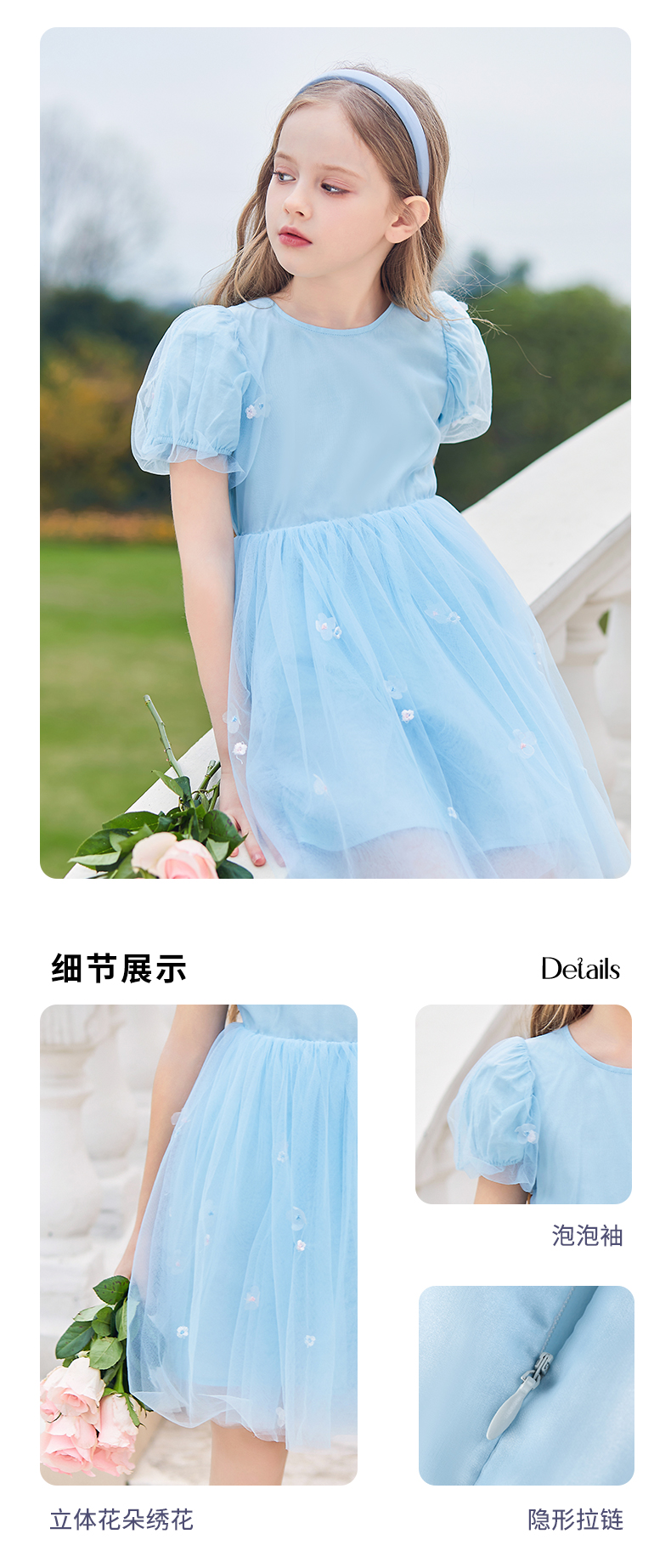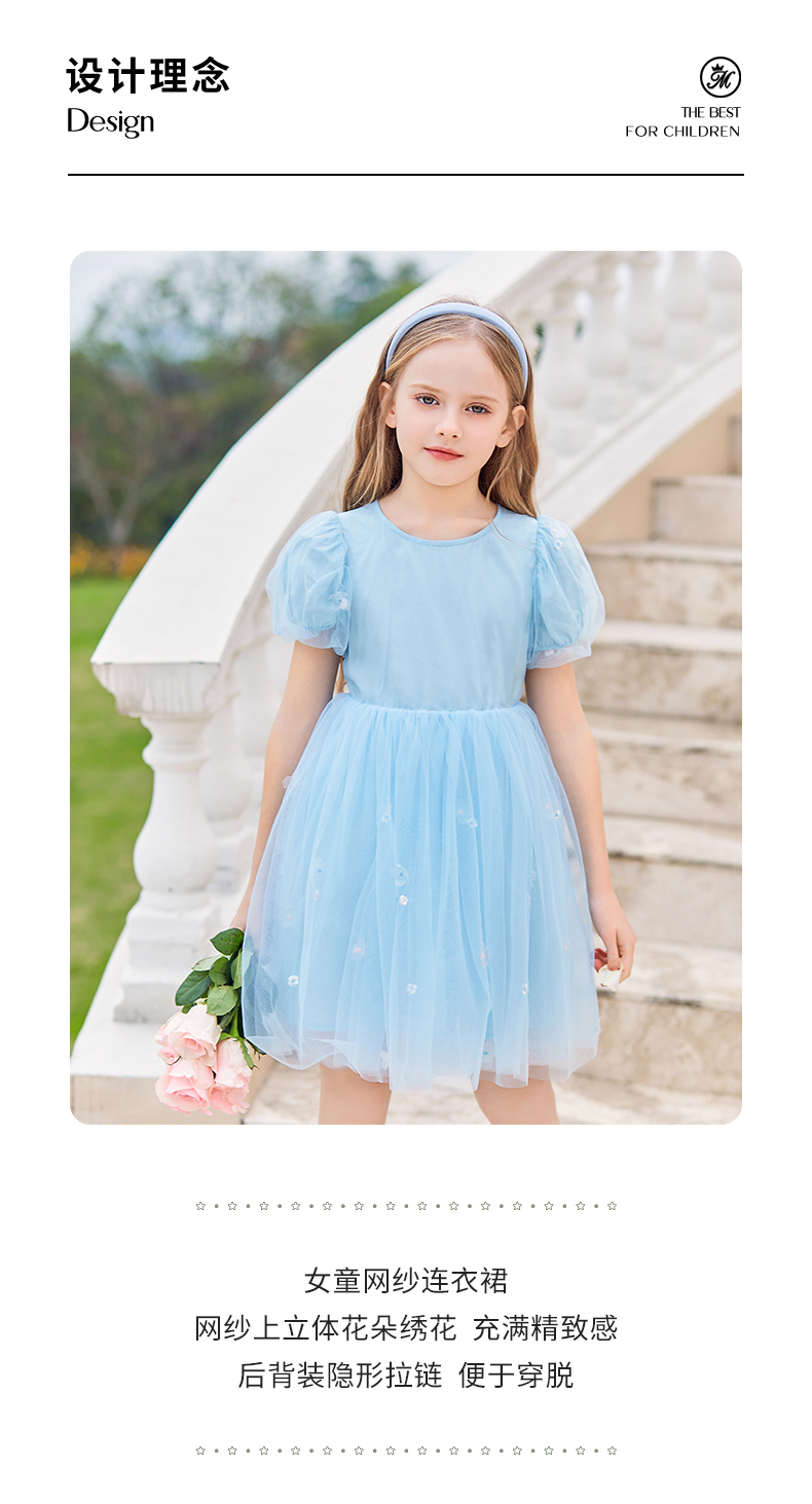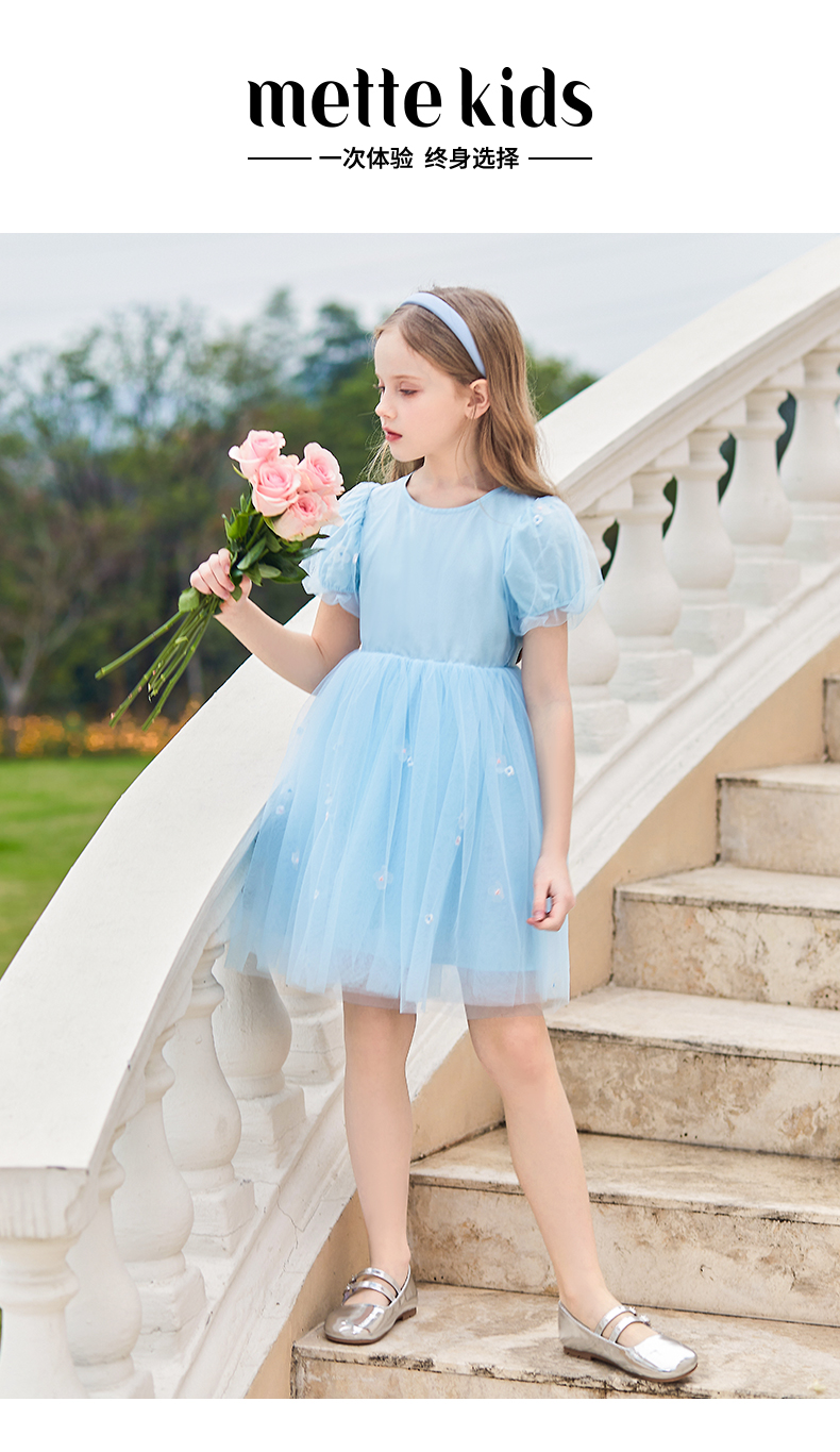 mettekids女童连衣裙夏季儿童网纱公主裙大童洋气时髦天蓝色裙子