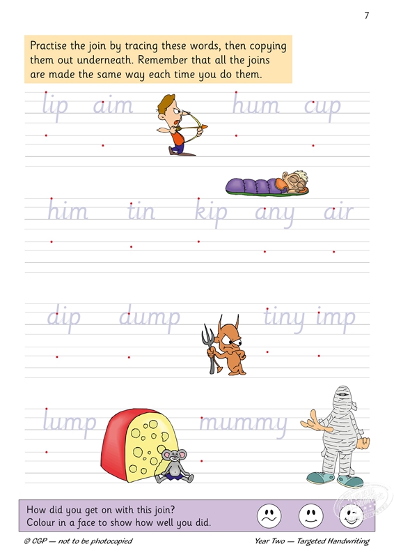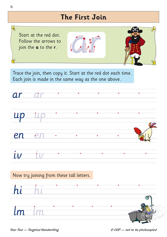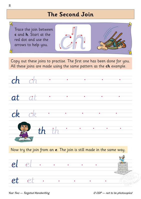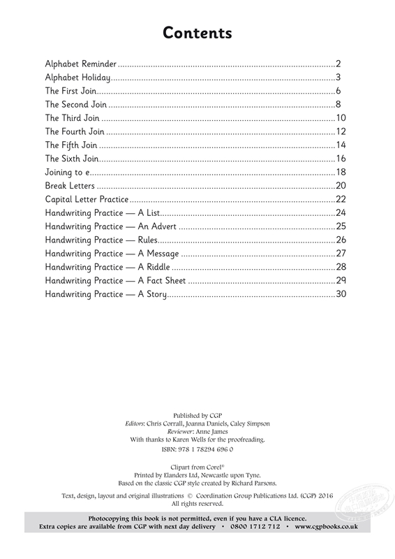 KS1 英语针对性练习册:手写 - 2 年级 适用于 2 年级学生(6-7 岁),以有趣且易于理解的方式介绍了连写手写。在对字母表中的所有字母进行简要回顾后,会进行连写练习。涵盖了每种不同类型的连写,从一个示例开始,该示例带有要遵循的箭头以指示学生。然后,学生可以自己练习复写,然后在一系列单词内,所有这些都带有指导方针和起始点。中断字母和大写字母也包括在内。学生还可以通过抄写较长的文章来练习他们的连写。本书开头提供了方便的提示。