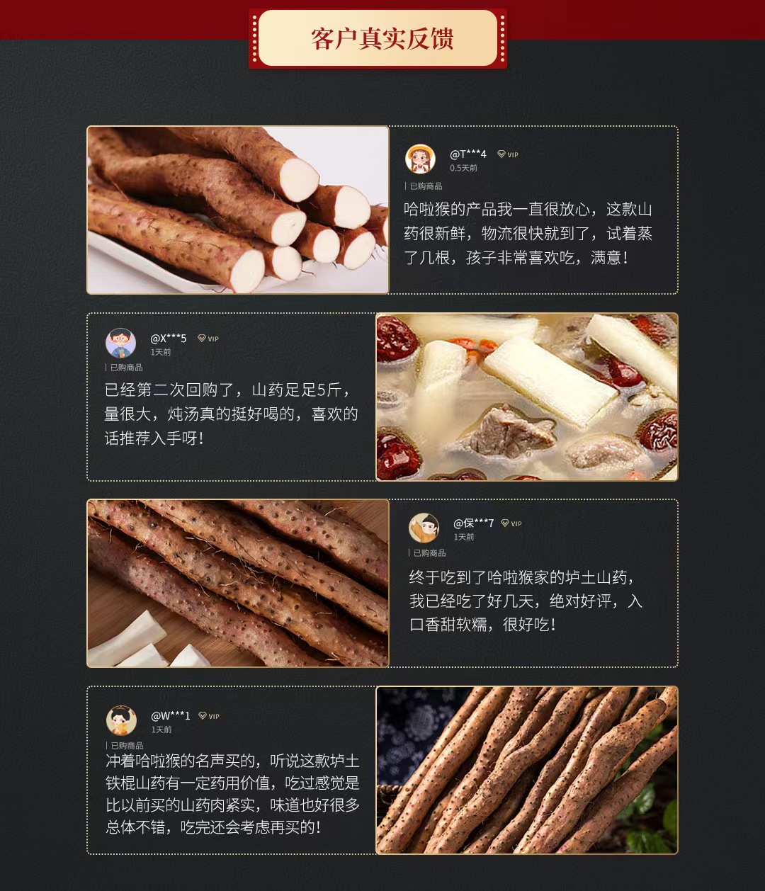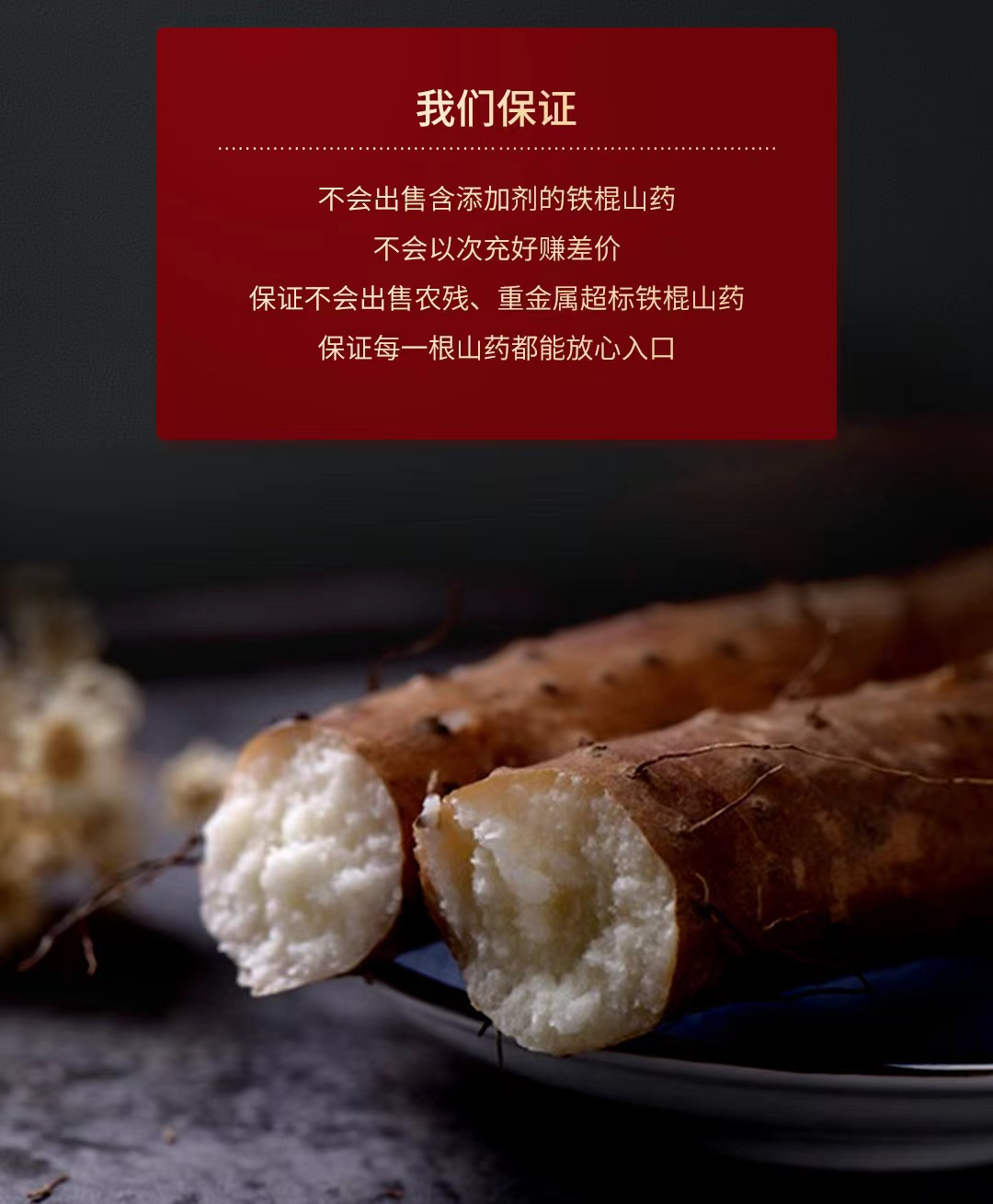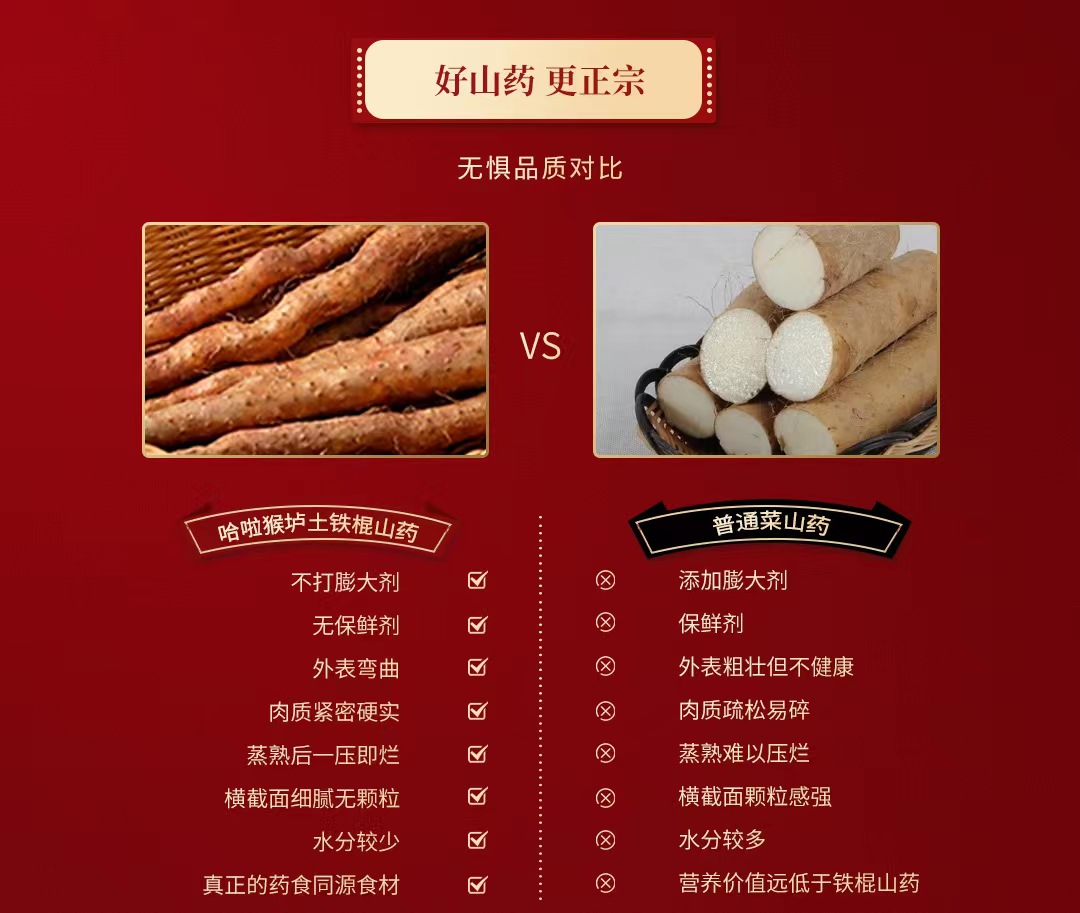 【特别说明】因生鲜产品具有特殊性和相关规定,下单时请一定认真确认收件信息,因客户原因导致转寄、延派、误派、擅自拒收、退货,口感问题等不在理赔范围。 【售后标准】生鲜产品不支持退货换货,收到货后有任何质量问题按比例赔付,在24小时之内都可以拍照联系客服进行售后,感谢您的信任,祝您购物愉快! 【温馨提示】收到摊开通风保存,把网套都去掉,打开包装存放在阴凉干燥通风处,别捂着,捂久了山药会发芽,发芽不影响食用;山药不好运输,运输途中容易断,轻微断裂的不在售后范围 |