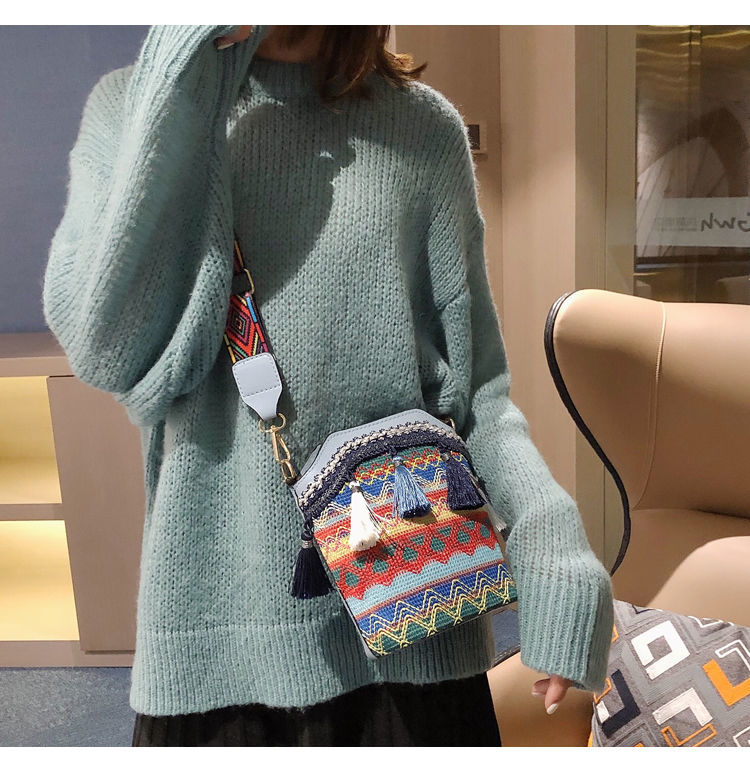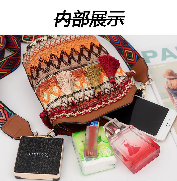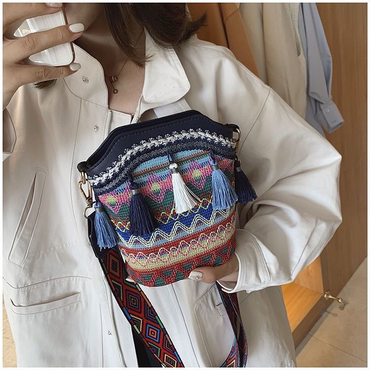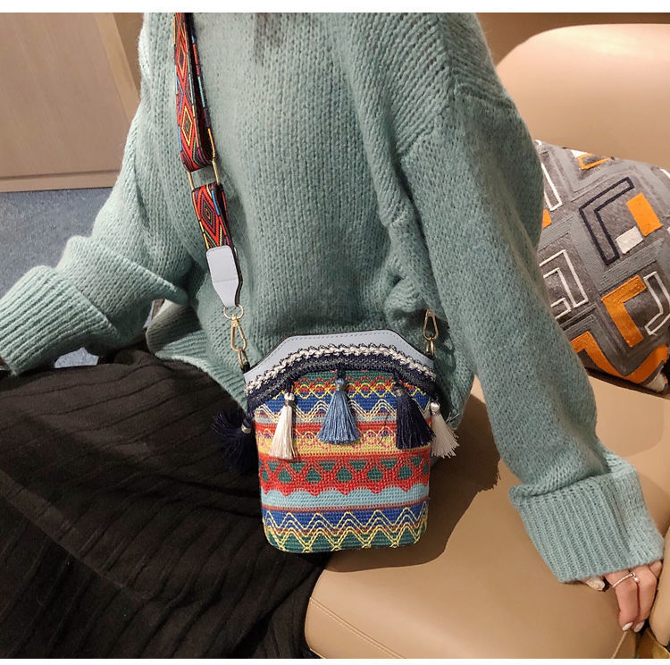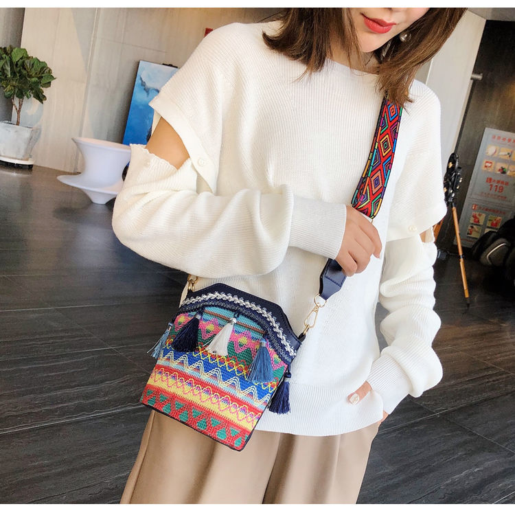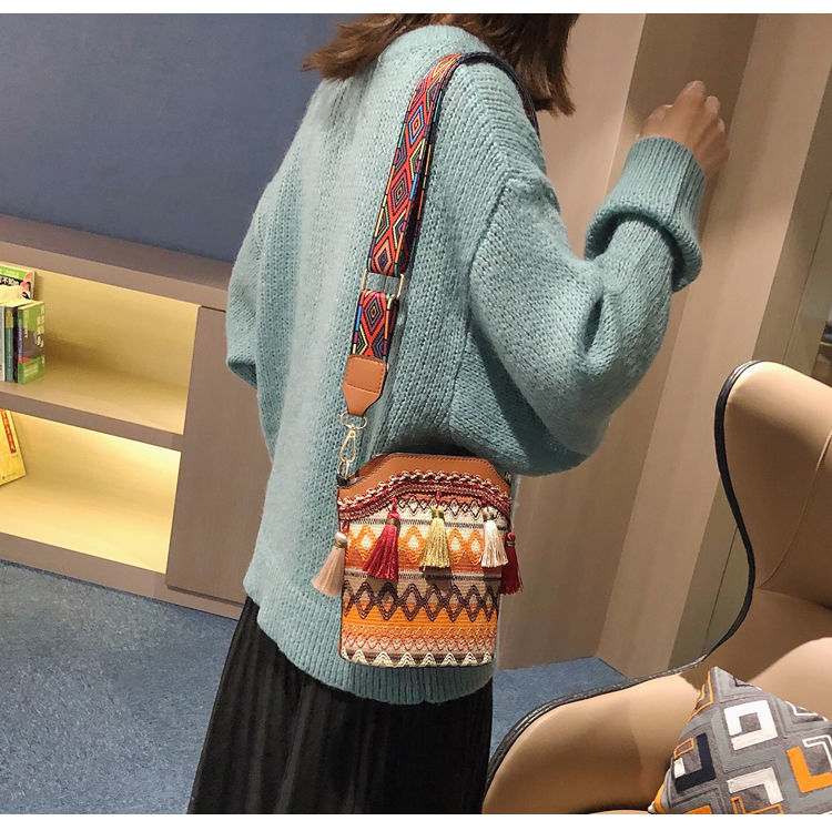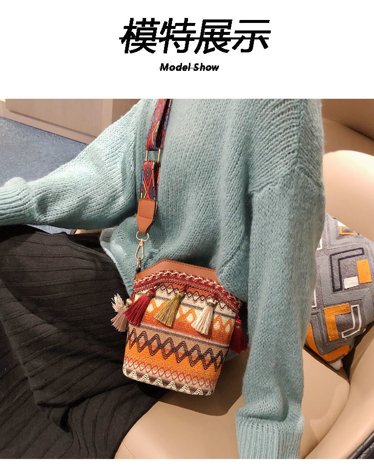 新款民族风优雅气质百搭,单肩流苏斜挎水桶包