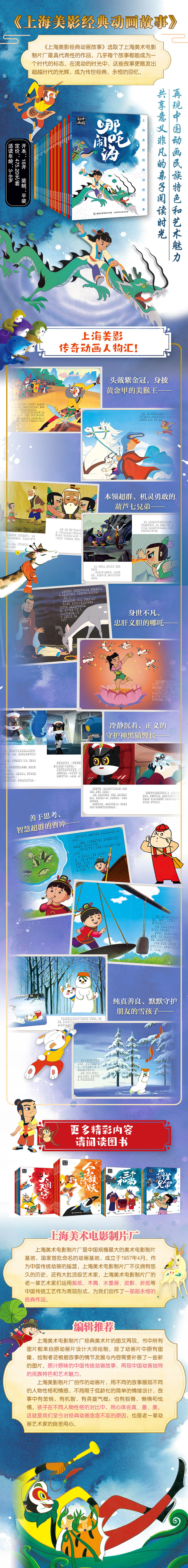 《上海美影经典动画故事》由上海美术电影制片厂官方授权出版,根据上海美影同名动画片改编而成,汇集上海美影最经典动画作品。全系列共24个故事,有《小蝌蚪找妈妈》《曹冲称象》《大闹天宫》《哪吒闹海》《猴子捞月》等。书中故事根据上海美术电影制片厂同名电影改编。图片由上海美影老艺术家根据图书特点重新绘制,具有视觉冲击力。故事全文加注拼音,可以亲子共读,也便于孩子自主阅读。