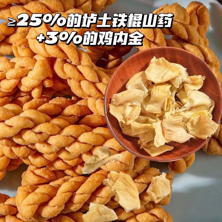 配料里面用的是非常出名的——焦作垆土铁棍山药,焦作温县特殊的土壤环境,出产的铁棍山药药用价值和滋补作用都很高,我们添加的含量≥25%,入口香浓酥脆,边吃边养胃,一举两得~
