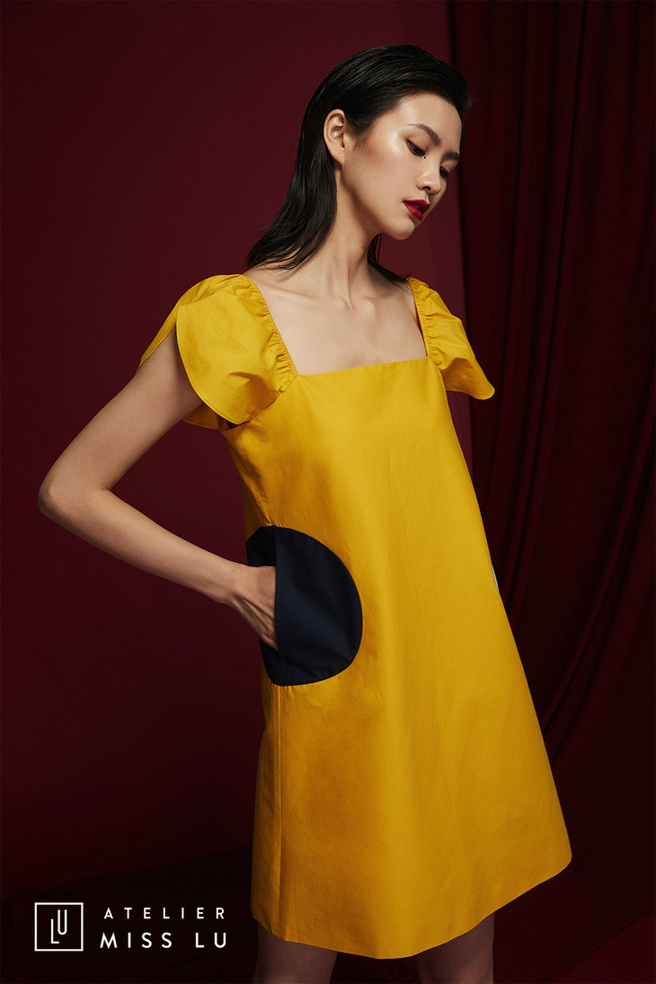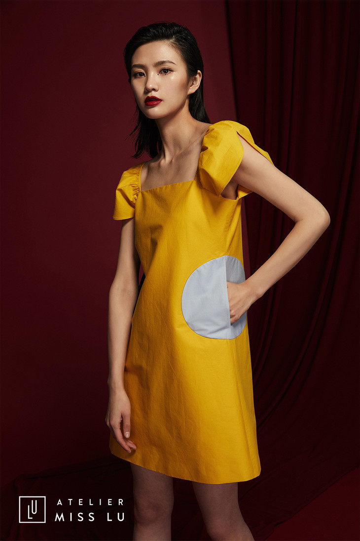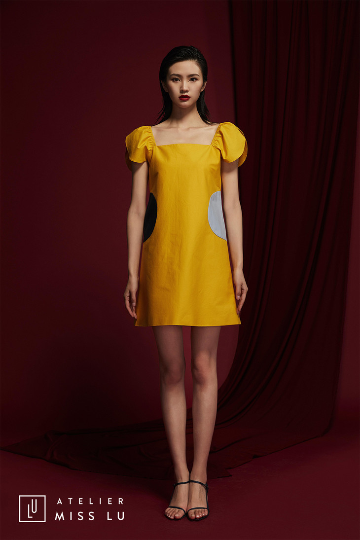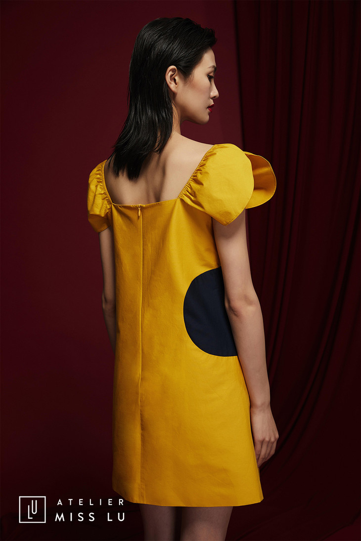 AtelierMissLu /Torres-流心黄拼色蓬蓬袖连身裙/0000543