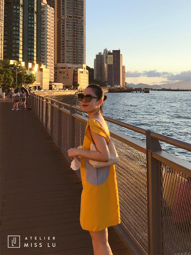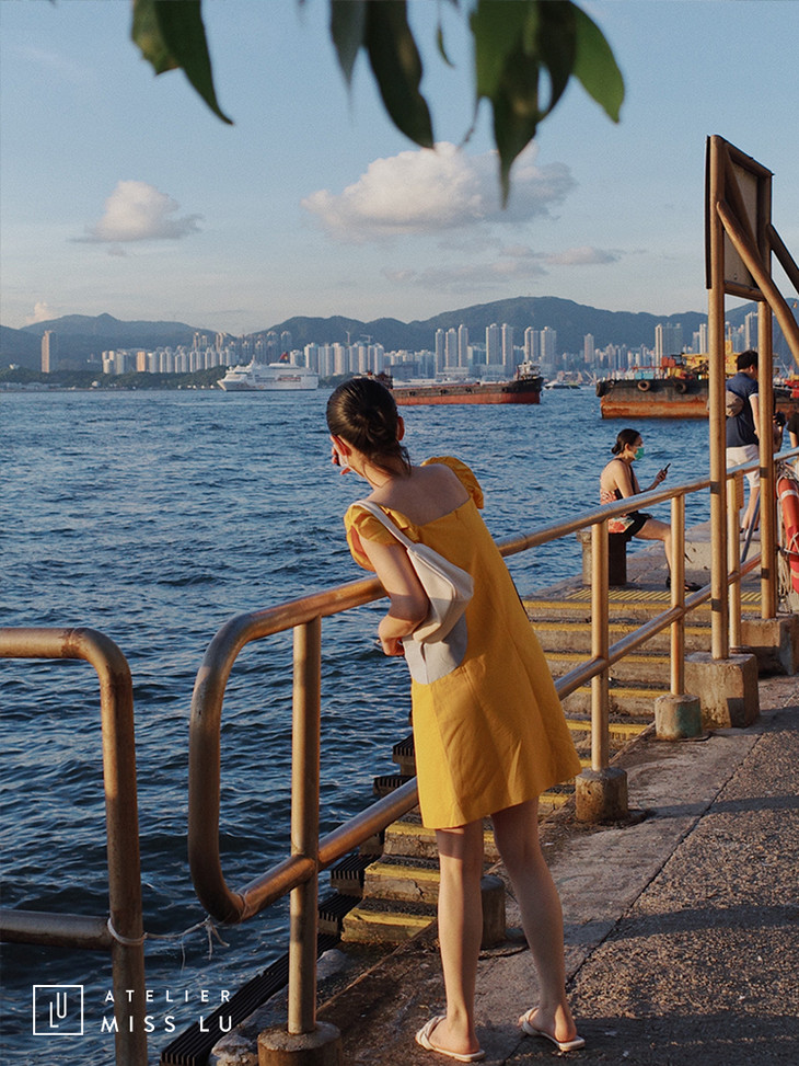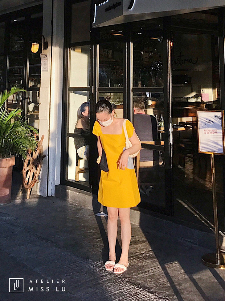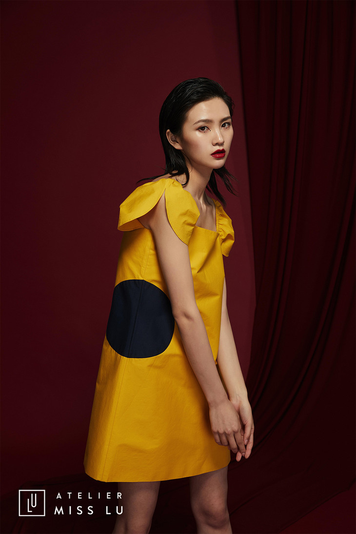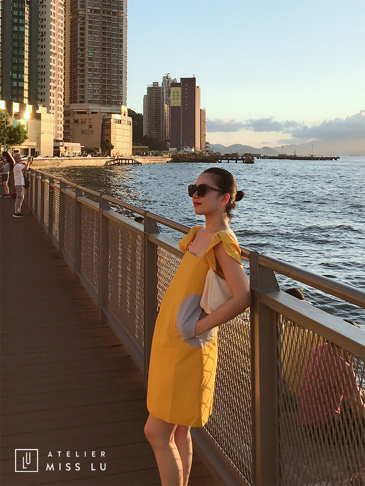 AtelierMissLu /Torres-流心黄拼色蓬蓬袖连身裙/0000543