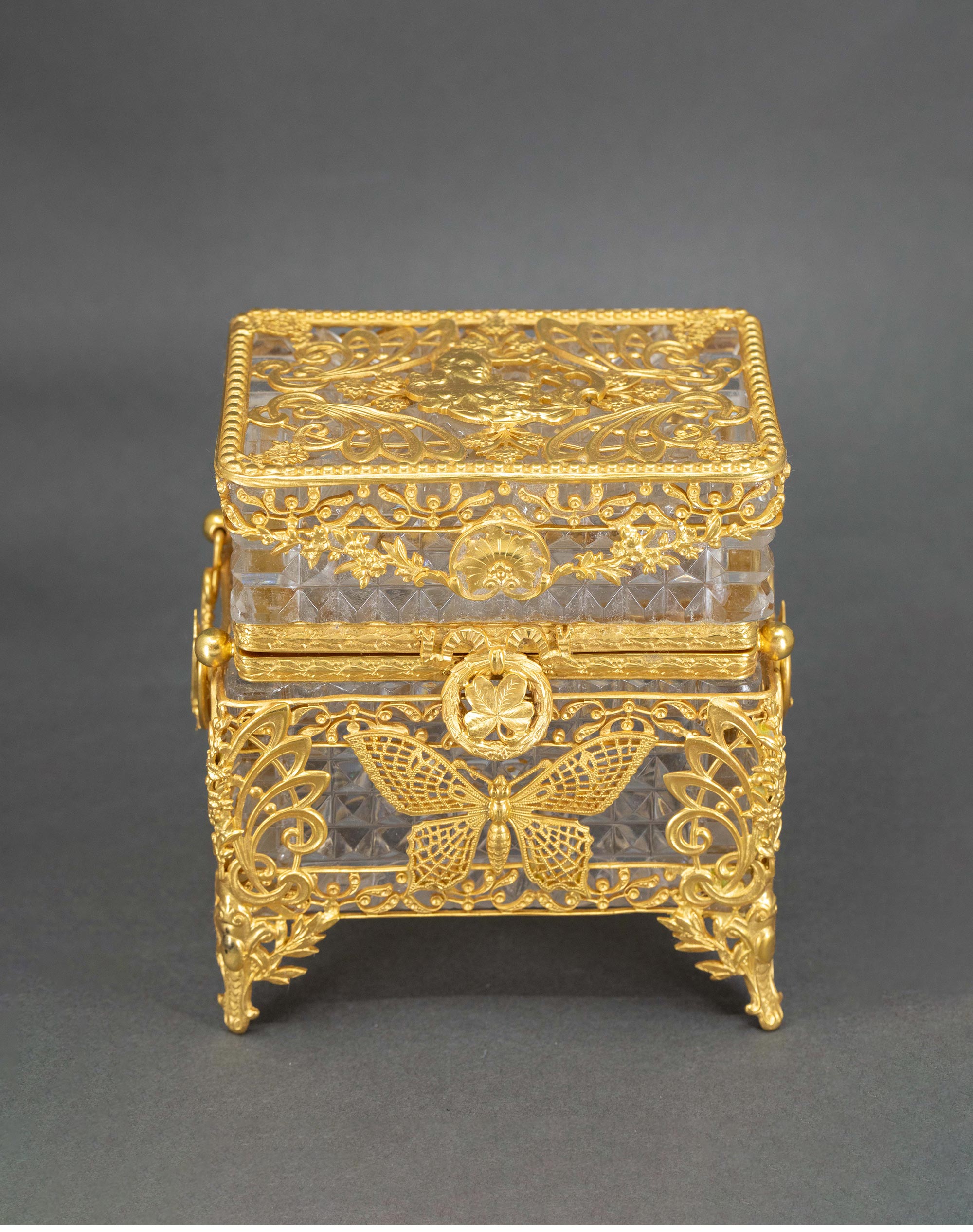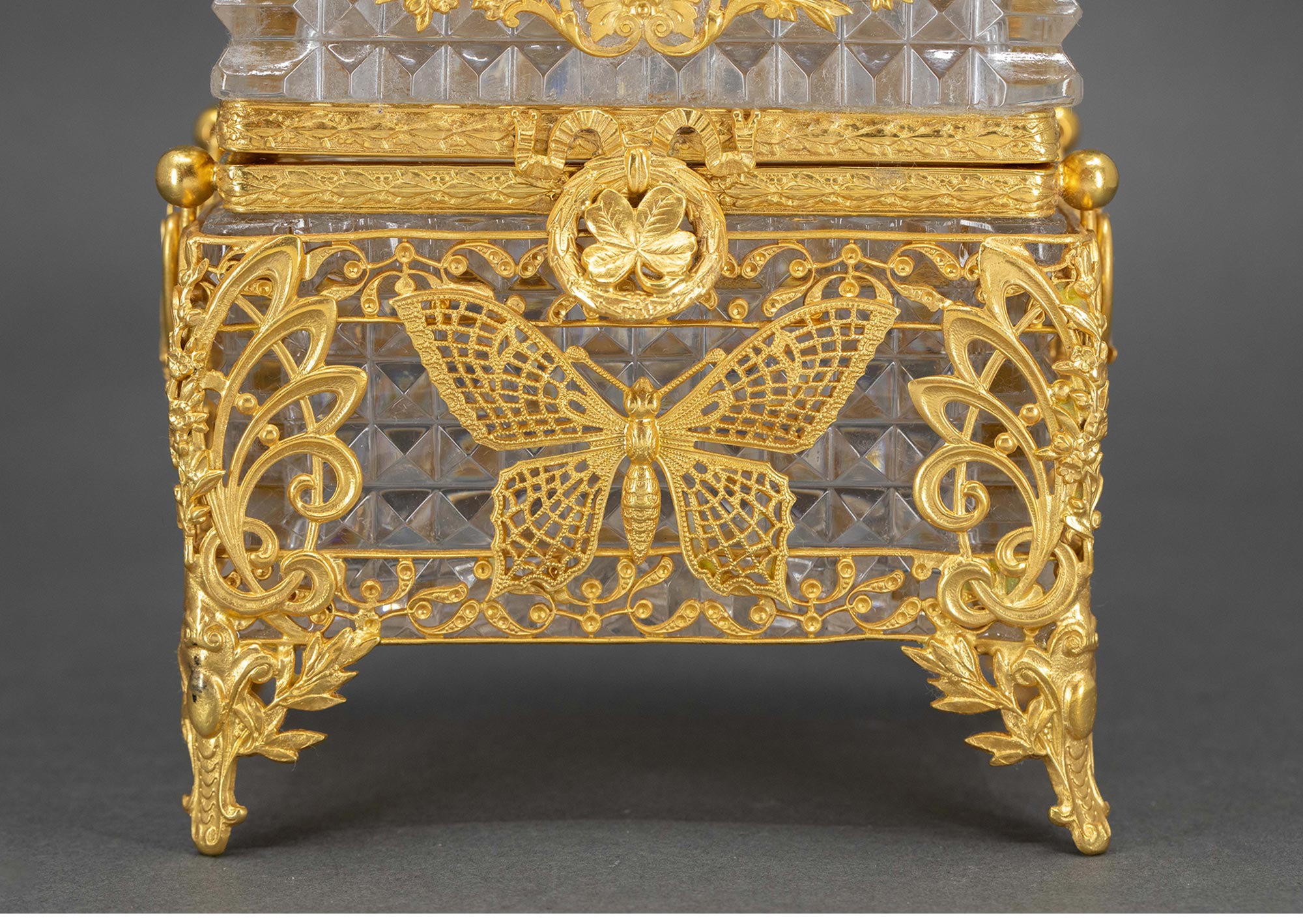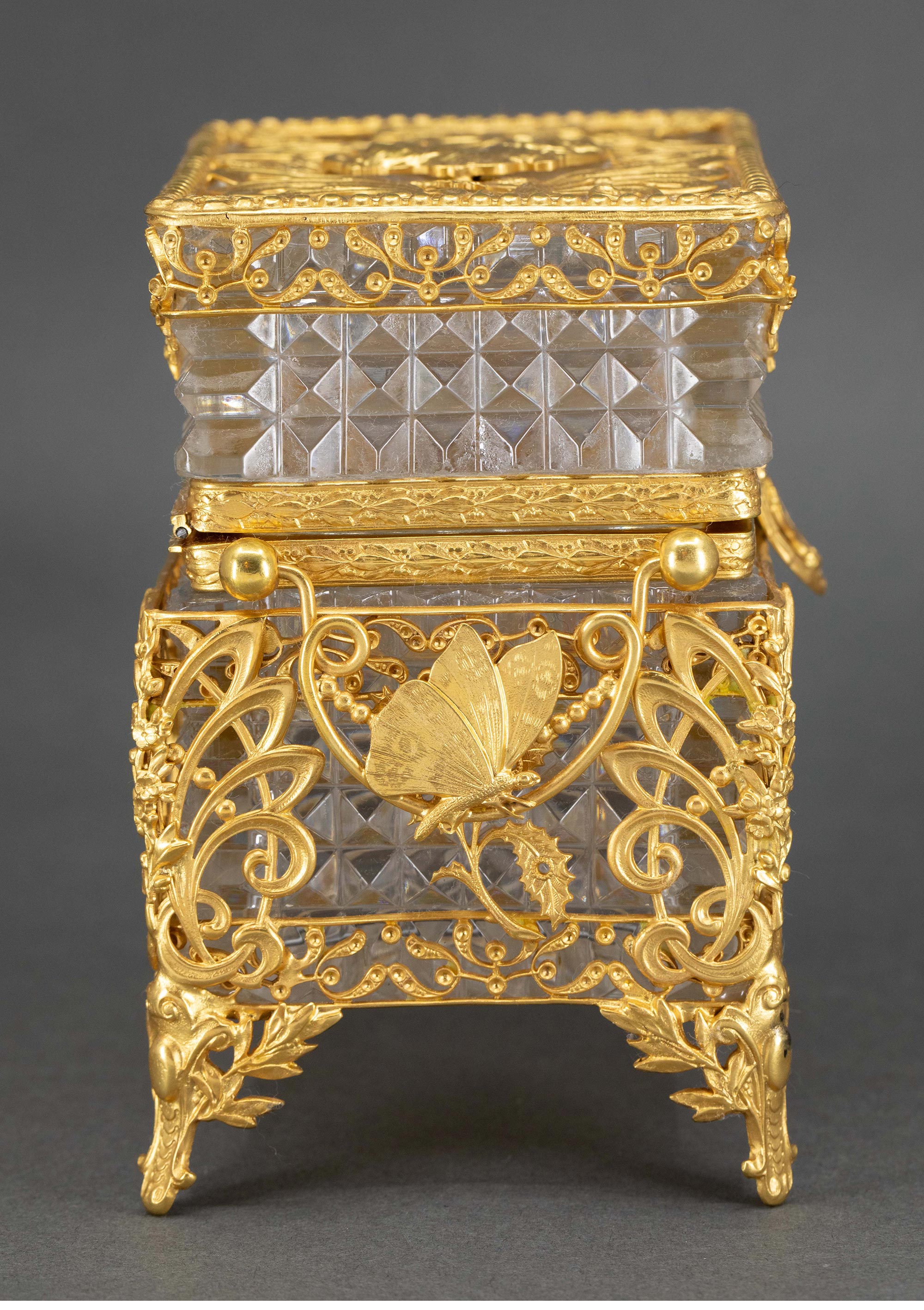 19世纪末法国出品新艺术风格蝴蝶花叶主题铜鎏金精雕装饰水晶珍宝盒