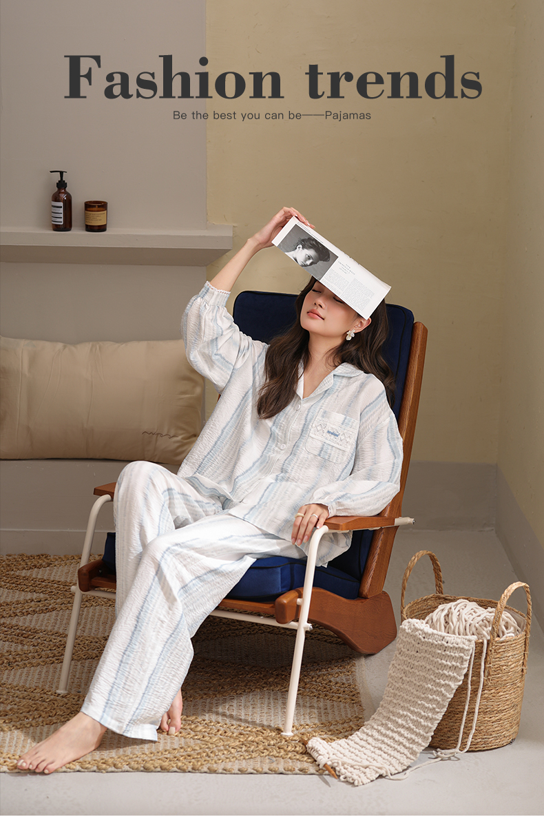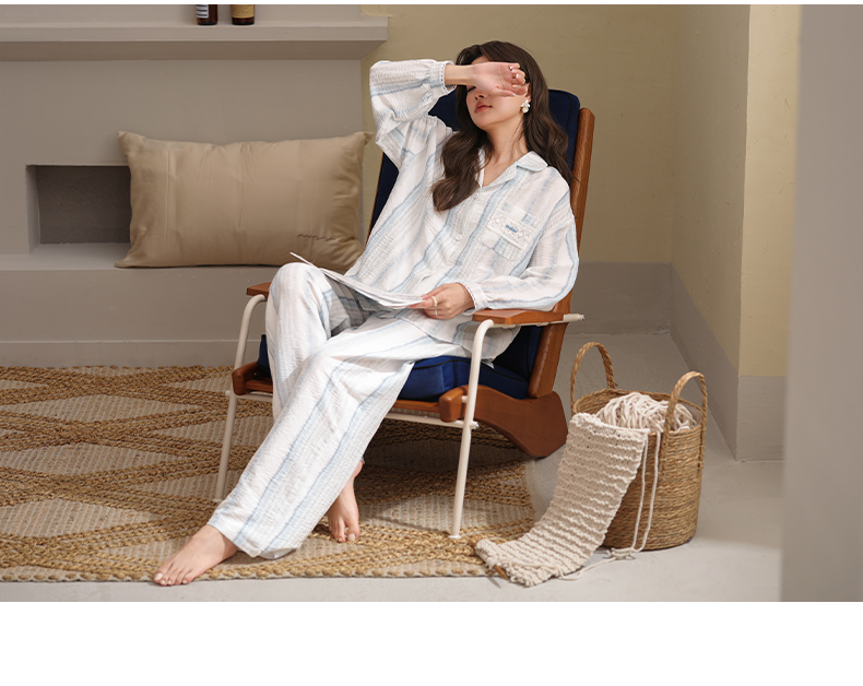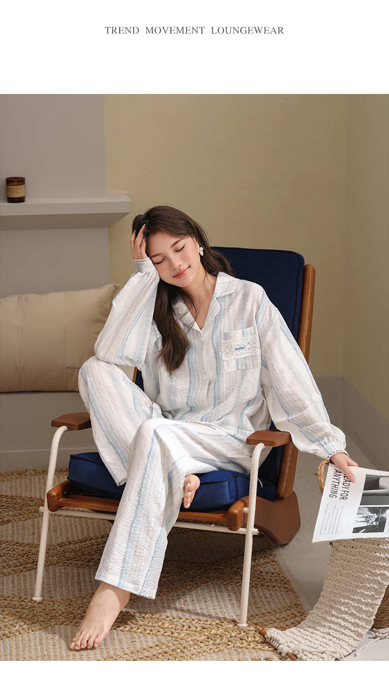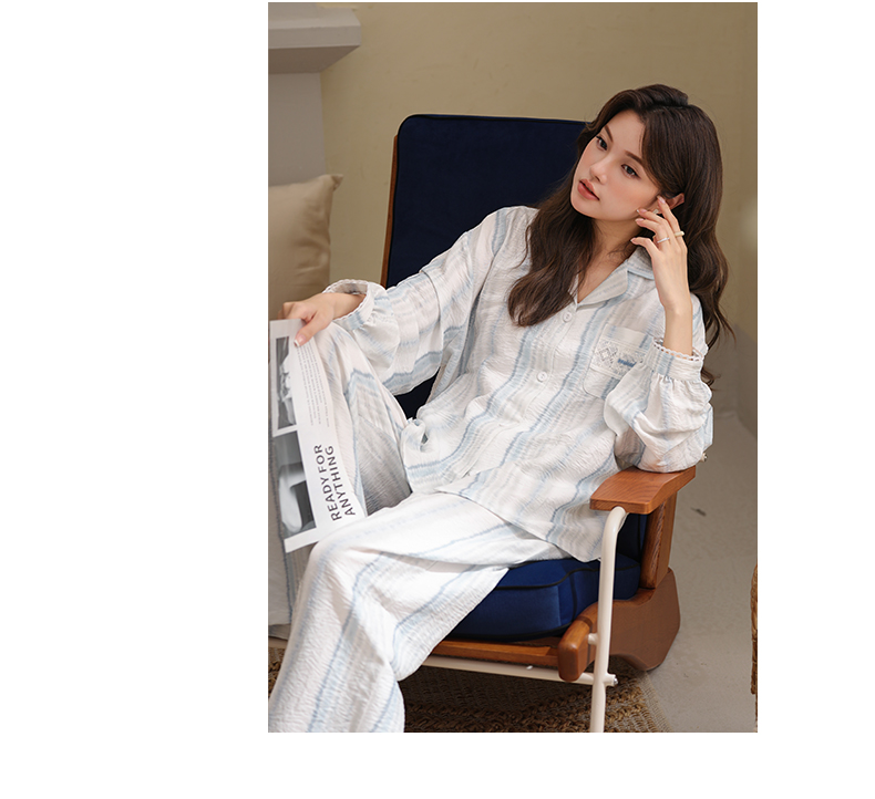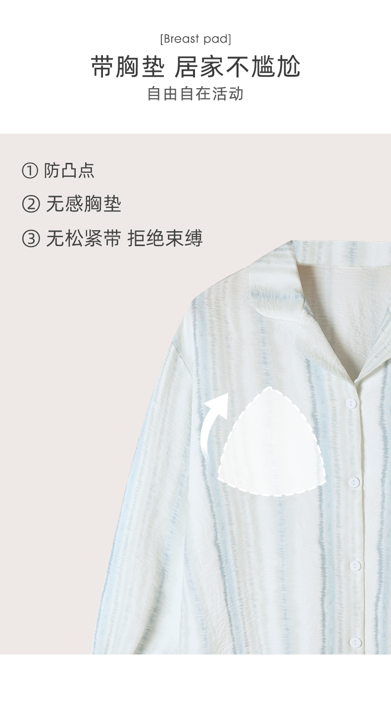 可人儿春秋季带胸垫泡泡绵女士长袖长裤睡衣可外出小众家居服套装