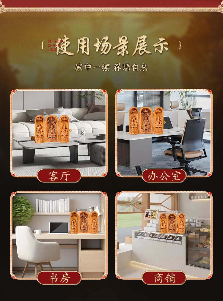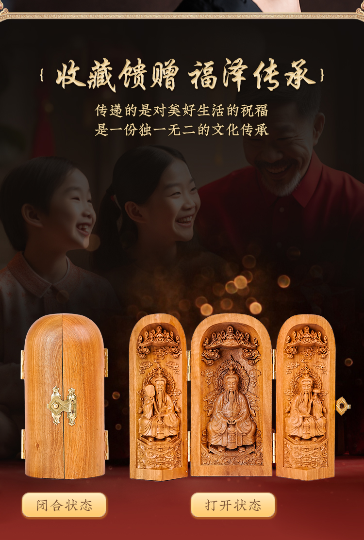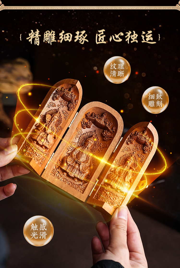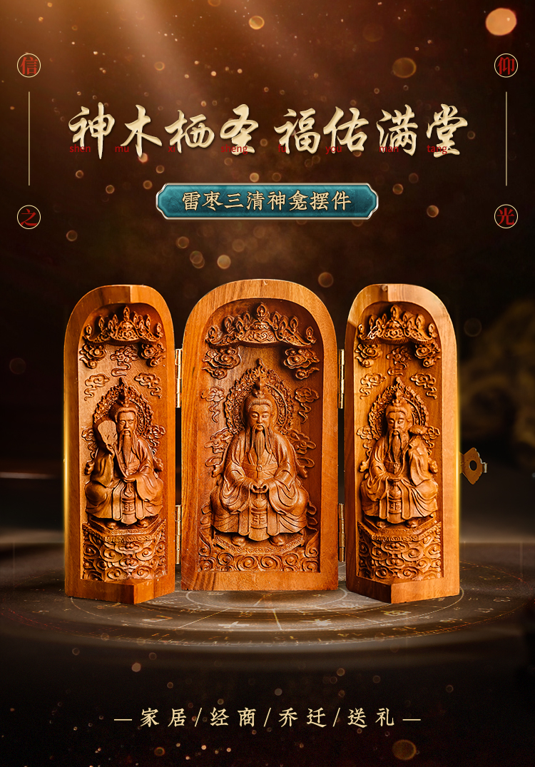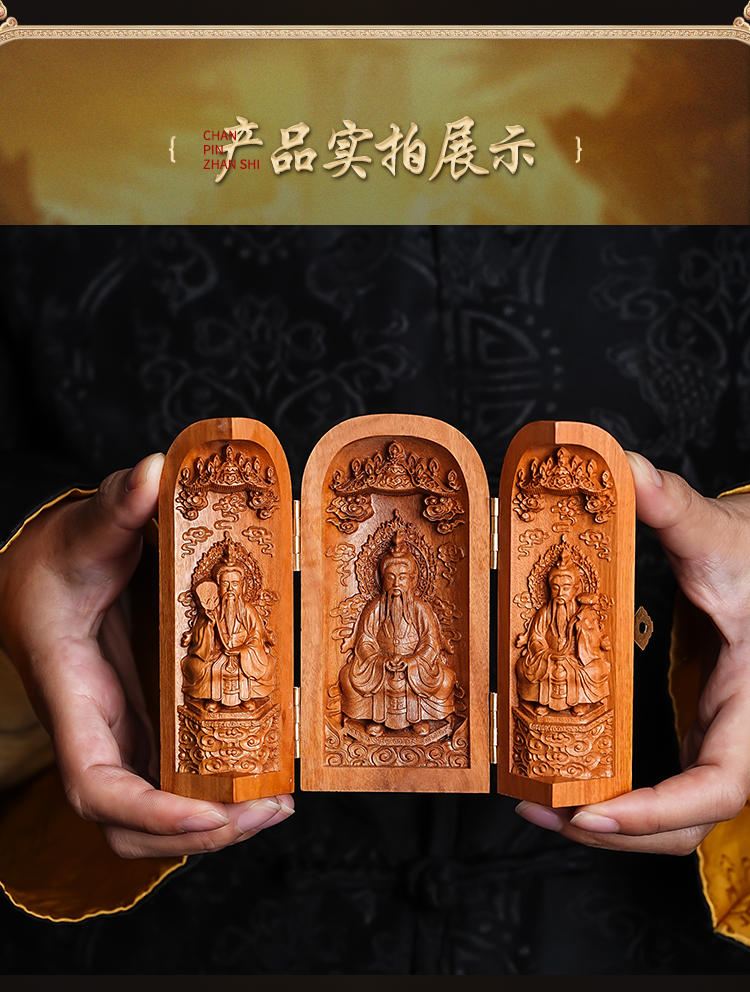 雷击枣木三清神龛摆件折叠三开人像工艺品摆件