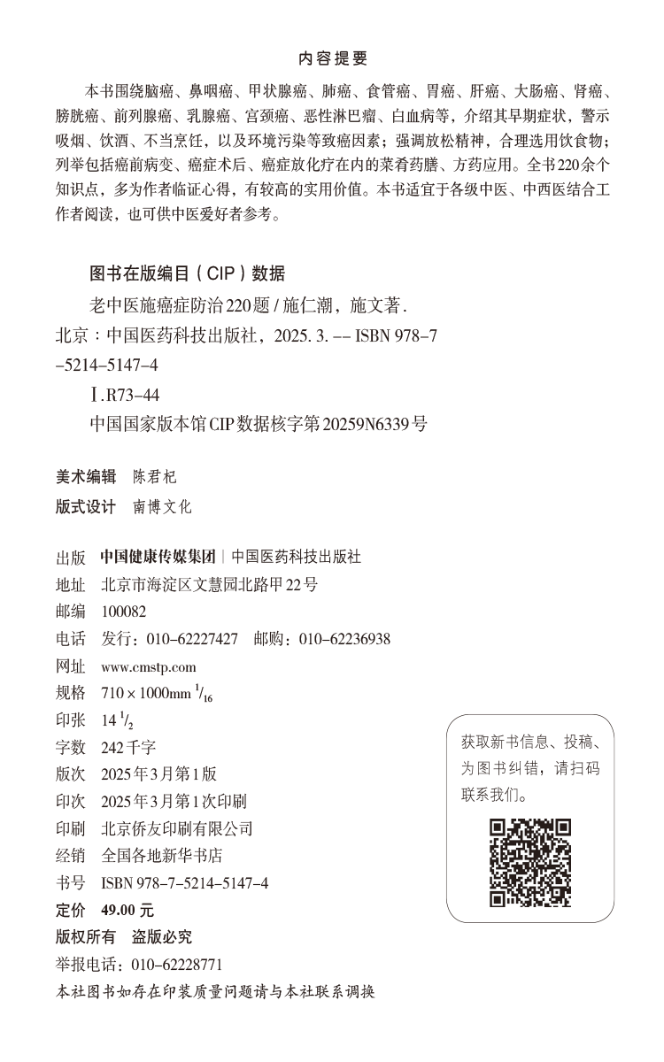 书名:老中医施癌症防治220题