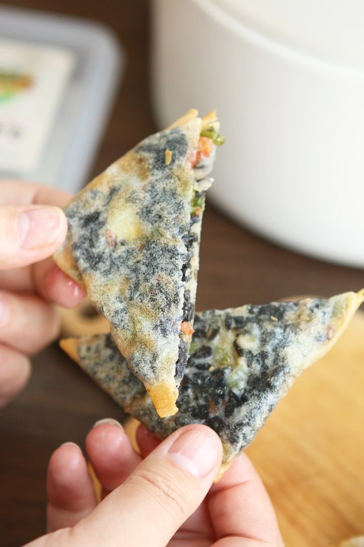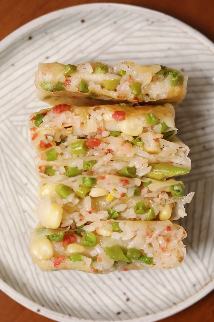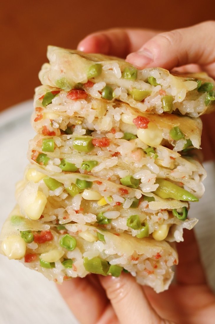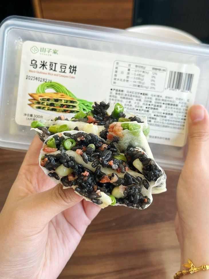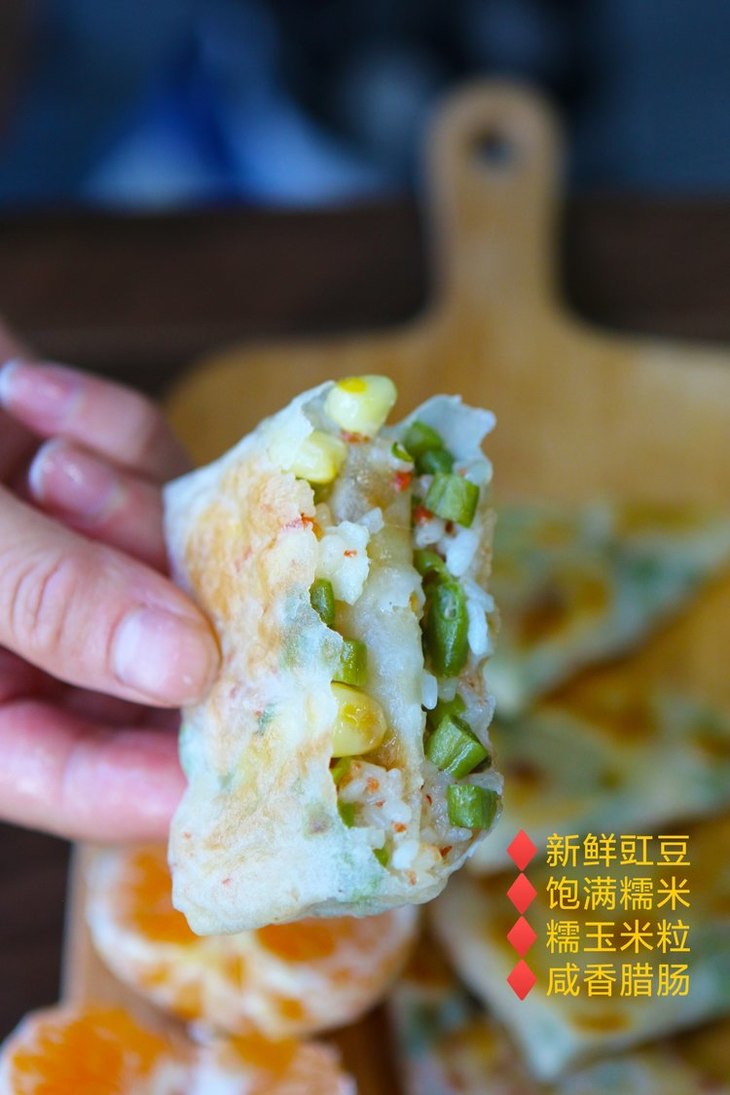 豇豆饼的饼皮用的是薄如蝉翼的春卷皮,包裹着糯米、乌米、新鲜豇豆、玉米粒和腊肠,只需要中小火慢煎3-5分钟,两面金黄即可出锅,咬一口外皮酥香松脆,内馅软糯弹牙的米粒,伴随着脆嫩口感的豇豆和鲜甜玉米粒,还有咸香的腊肠,越嚼越香,香到邻居来敲门🥱