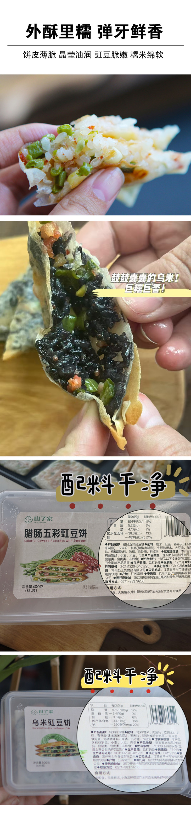 【品名】五彩腊肠豇豆饼、乌米豇豆饼【规格】五彩腊肠豇豆饼400g/盒(8个装)乌米豇豆饼300g/盒(6个装)【配料】五彩腊肠豇豆饼:糯米、豇豆、春卷皮、玉米粒、腊肠、大豆油、食用盐、鸡精调味料、味精、白砂糖、胡椒粉。乌米豇豆饼:乌米(糯米、南烛叶、饮用水)、豇豆、春卷皮、玉米粒、腊肠、大豆油、食用盐、鸡精调味料、味精、白砂糖、胡椒粉。【保质期】12个月【储存方式】零下18度冷冻保存【发货时效】48小时【发货快递】顺丰【产地】江苏常州【发货地】浙江杭州【不发货地区】新疆、西藏、海南、云南及港澳台【需加运费地区】黑龙江、吉林、内蒙、宁夏、甘肃、青海+15元运费【售后标准】本产品属于冷冻品,在发货后不支持修改地址、退款与拒收,因此产生的损失由买家承担责任。如遇到产品质量问题,请在收货当天联系客服,并提供面单和产品破损照片,申请售后处理。