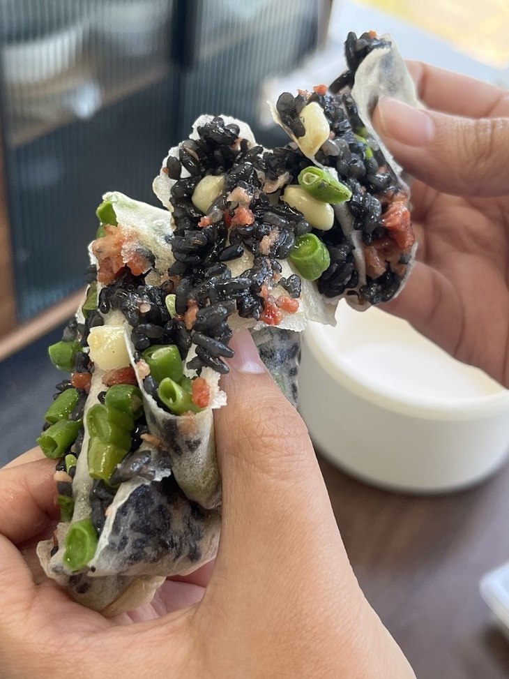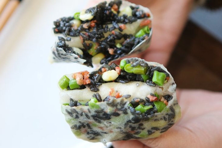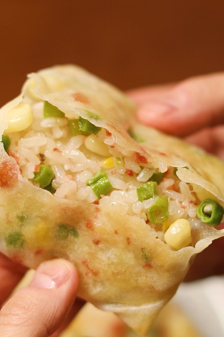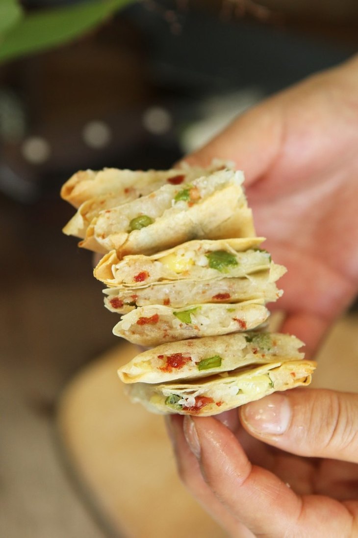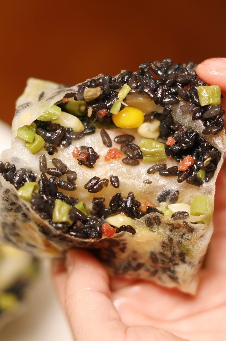 3、手工制作春卷皮,新鲜豇豆、玉米粒和咸香腊肠制作,外皮酥脆,内里软糯鲜香,越嚼越香。