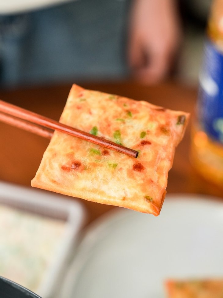 杨师傅说,豇豆饼好吃的关键在于春卷皮的制作,薄如蝉翼的同时要不易破皮,而且要煎好后金黄酥脆!经过长达半年的测试,他从面粉的选择到和面醒面的时间做出各种调整。面粉要选择中筋面粉,既有一定的韧性,又不会过于劲道。和面的时候需要加入食用盐,醒面的时间根据春夏秋冬的温度变化也有所不同。最终制作出了满意的春卷皮,薄如蝉翼,有韧性,包制的时候不易破皮,煎好的饼皮金黄酥脆,不会太硬也不会太软,酥脆的刚刚好!
