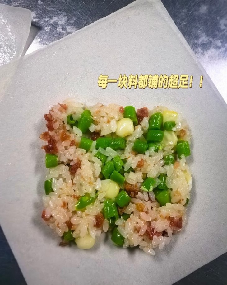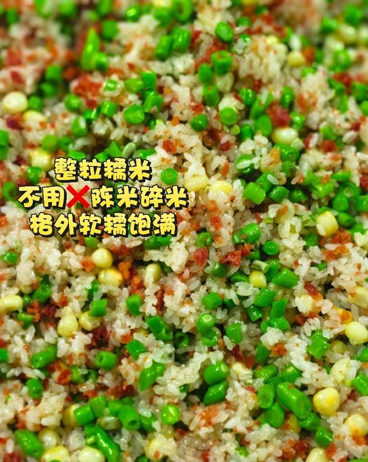 糯米一定要选择足够饱满圆润的,吃起来才会香甜软糯,❌拒绝碎米陈米!糯米经过多次淘洗,浸泡8小时左右,然后蒸制50分钟,糯米香糯,又有足够的粘性,可以将所有馅料粘在一起,包制的时候不会露馅!