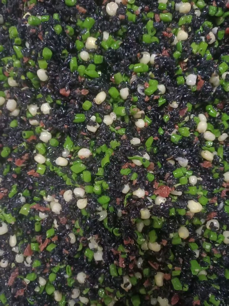 新鲜的豇豆切成均匀大小的小块,焯水的时候时间不宜太长,加入食用盐和油,豇豆翠绿口感脆嫩,腊肠切成非常小的小丁,吃起来不腻口又鲜香,将糯米/乌米、豇豆、玉米粒和腊肠一起搅拌均匀即可包制,所有馅料没有经过炒制,都是煮熟后进行包制的,避免煎的时候口感油腻,吃起来是自然鲜香,咸香适中,适合大众口味!