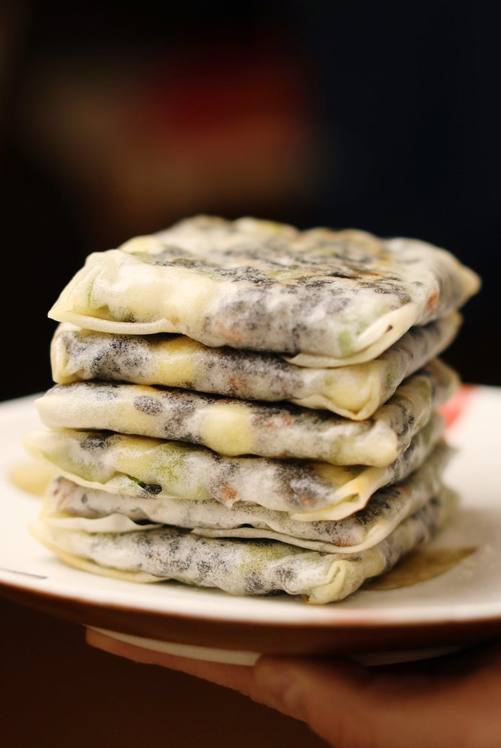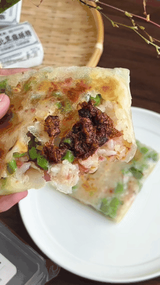 江浙特色小吃【五彩腊肠和乌米豇豆饼】🌿豇豆饼创始人之一杨师傅30年磨一剑,薄如蝉翼的春卷皮,煎至金黄酥脆,内里软糯弹牙,一口咬下,腊肠的咸香、豇豆的脆嫩、糯米的甜润层层交织.有糯米和乌米两种口味,0添加!