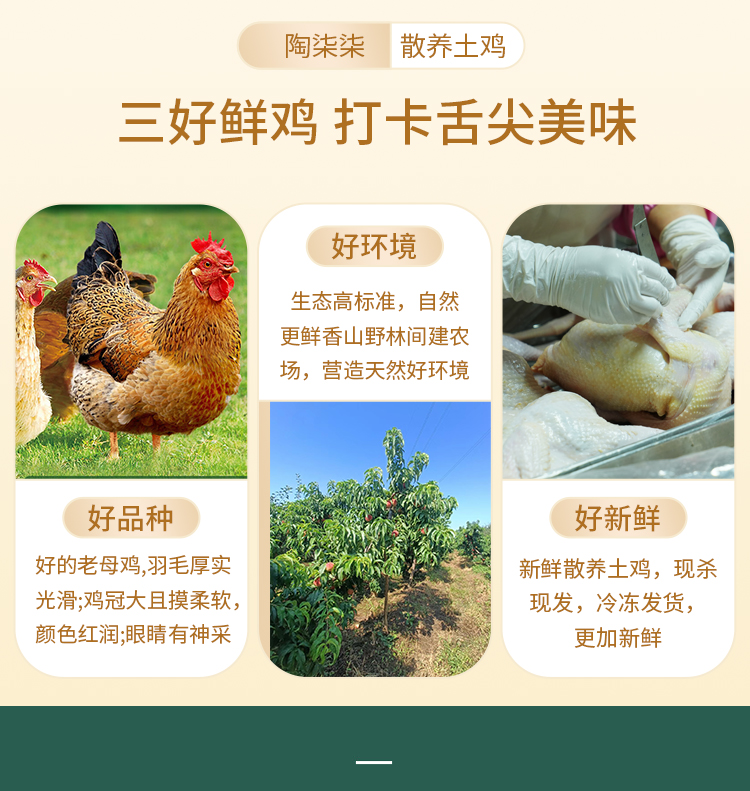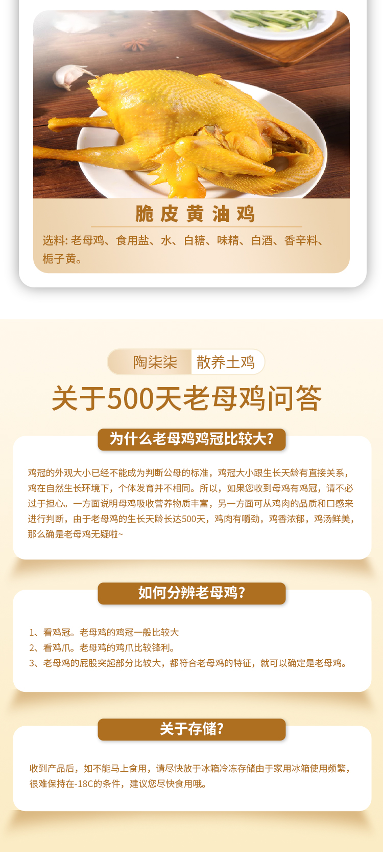 1、生鲜食品不支持退换货由于生鲜产品的特殊性,不接收7天无理由退换货如有品质坏损等问题可在收货后24小时内提供鸡只和快递面单一起的清晰图片反馈给客服处理>特别提醒客户需填写正确地址和电话,如因地址和电话错误原因无法联系,客户需要自行承担坏损,可能因为路途颠簸导致真空漏气,属于正常现象,收货后及时冷冻,食用是没有任何影响的! 2、我们保证无注水。因杀后塑封至冷库急速锁住营养分子,您收货后热空气遇冷产生水份,肉类中原本的水份也会少量溢出,收货后看到血水属正常现象 3、因散养禽类战斗力强活动量大经常发生打架斗殴现象个别皮部若发现有啄伤后表面泛红的伤痕,属于正常现象请您谅解。不保证每只老母鸡都有黄,介意勿拍 |