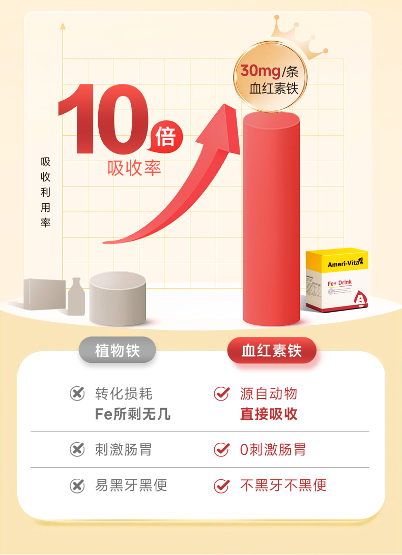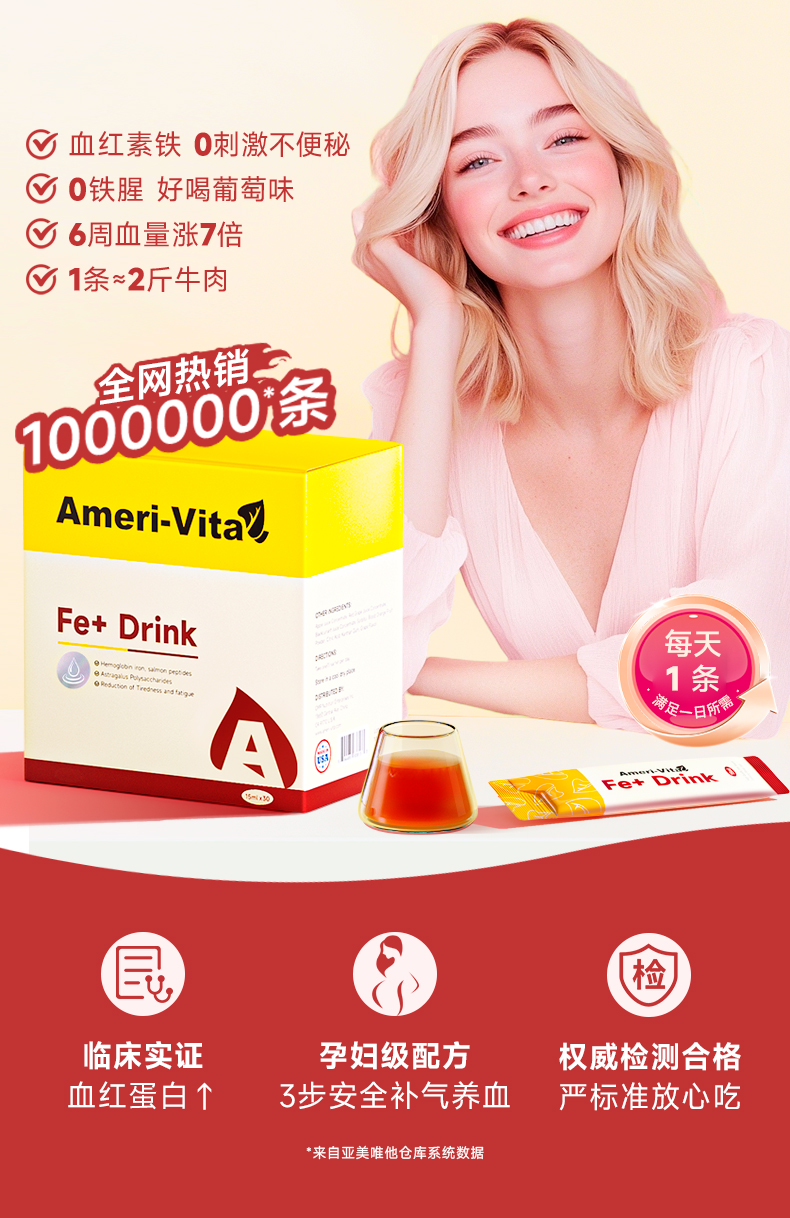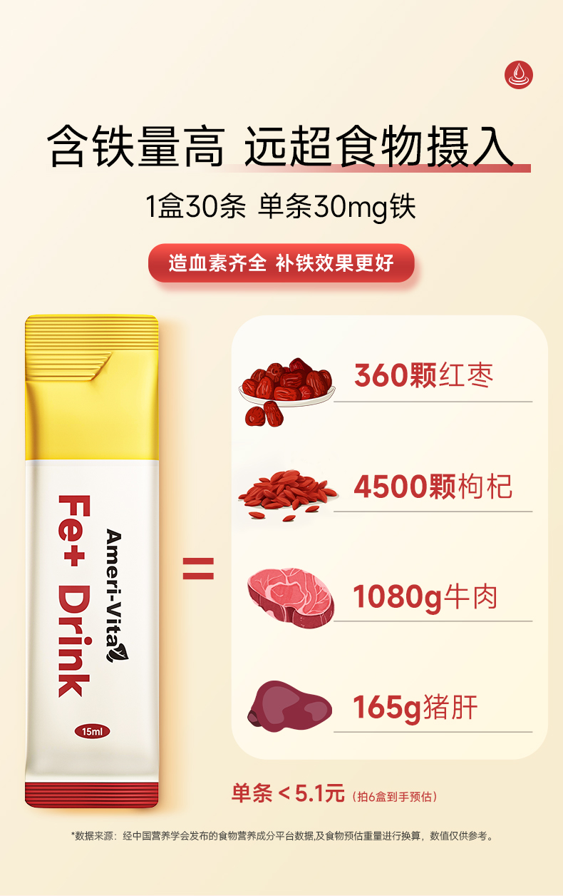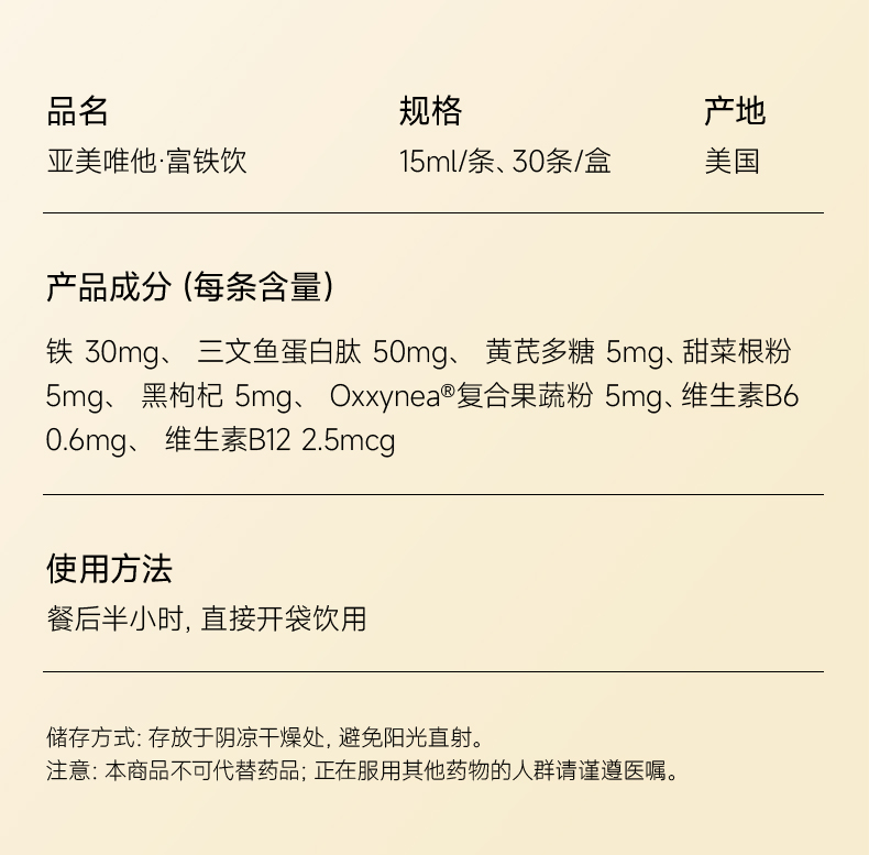 【买3送2】[AMeri vita]亚美唯他 富铁口服液 30条/盒 孕妇贫血女性经期便携铁剂铁元素口服液富铁小A条(效期至2026-09-12)