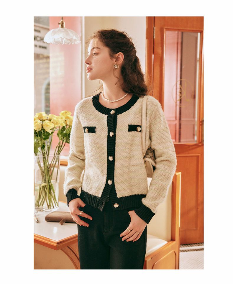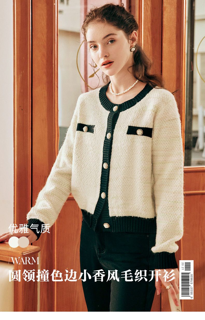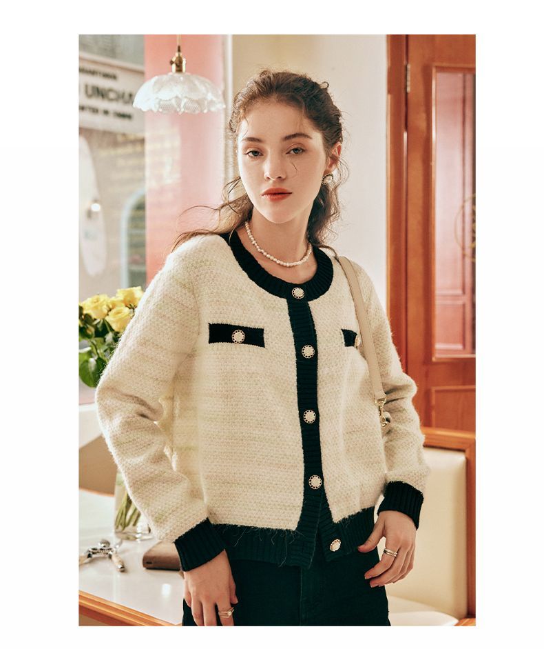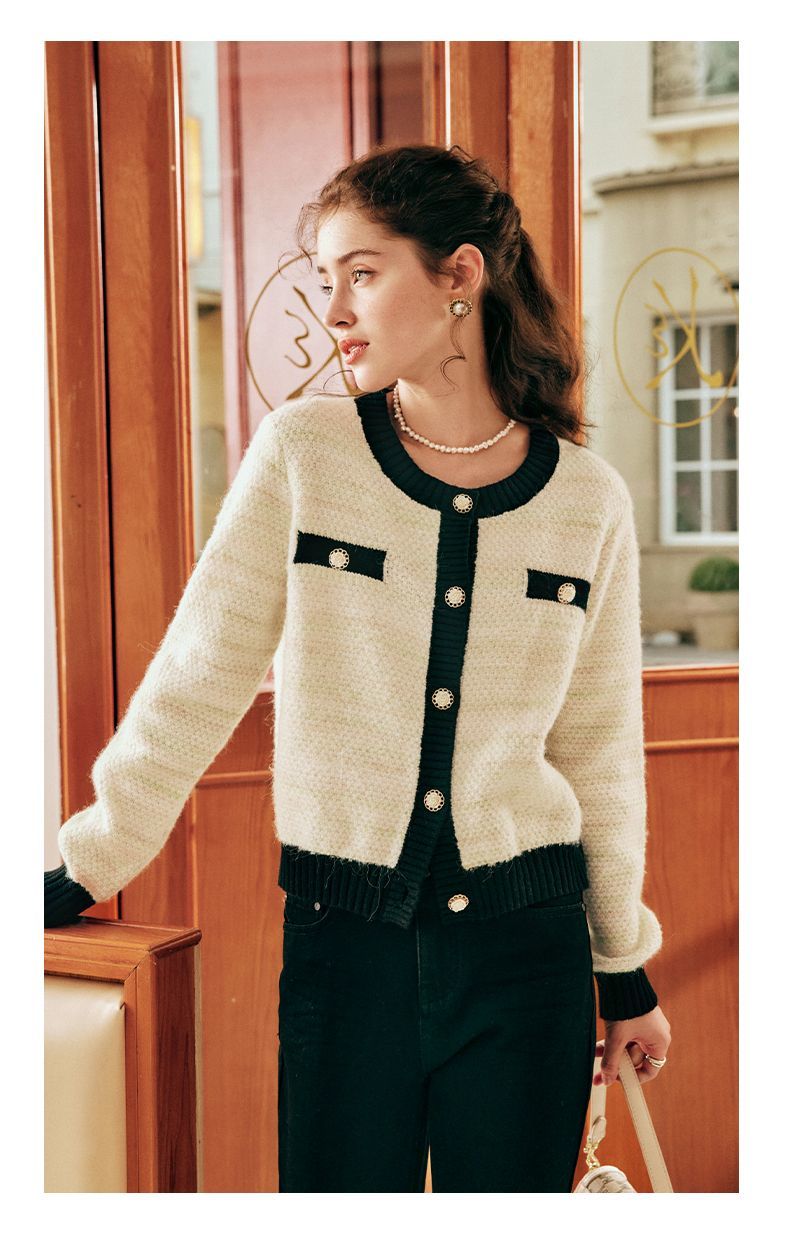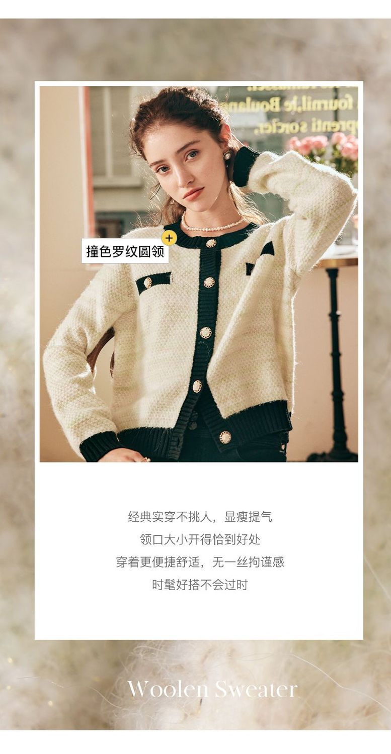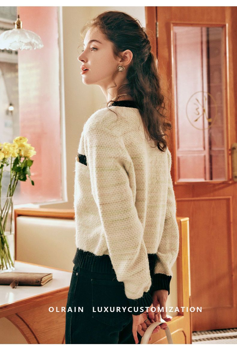 OLrain欧芮儿法式小香风毛衣外套女秋冬2022新款撞色圆领针织开衫